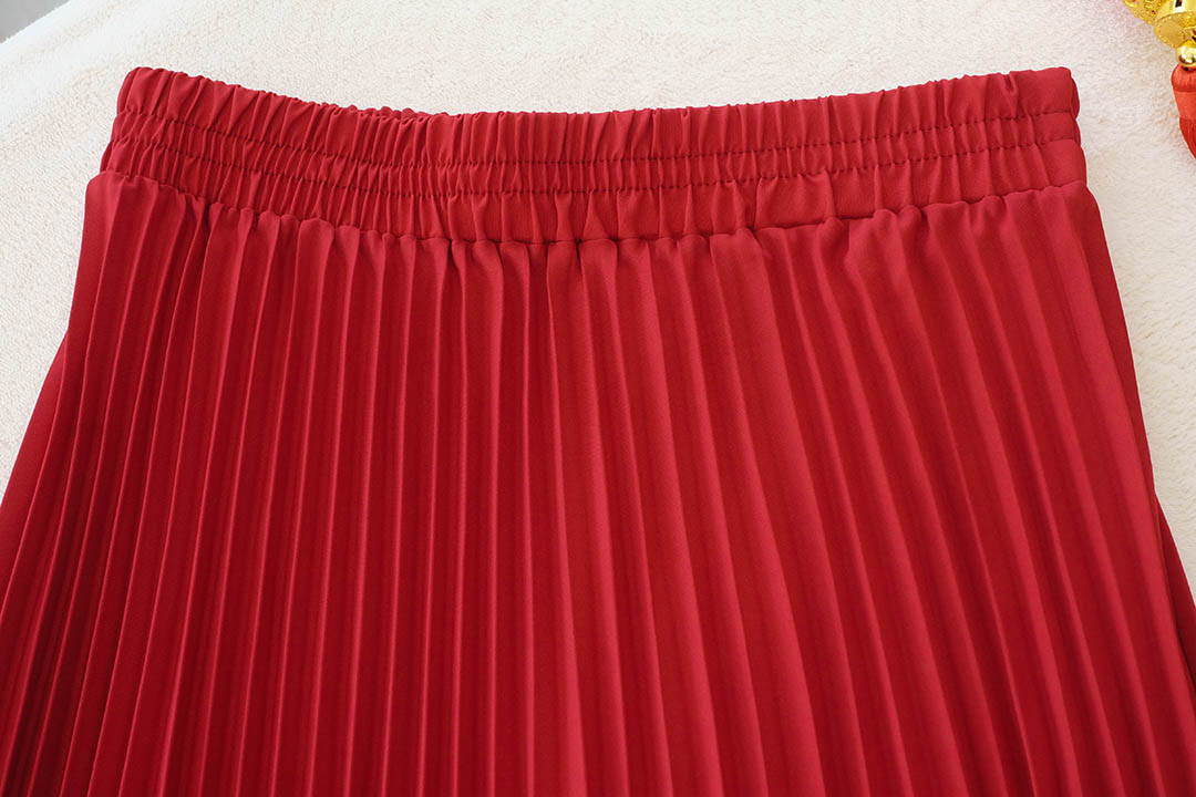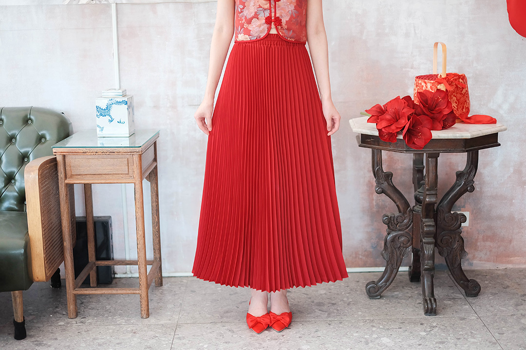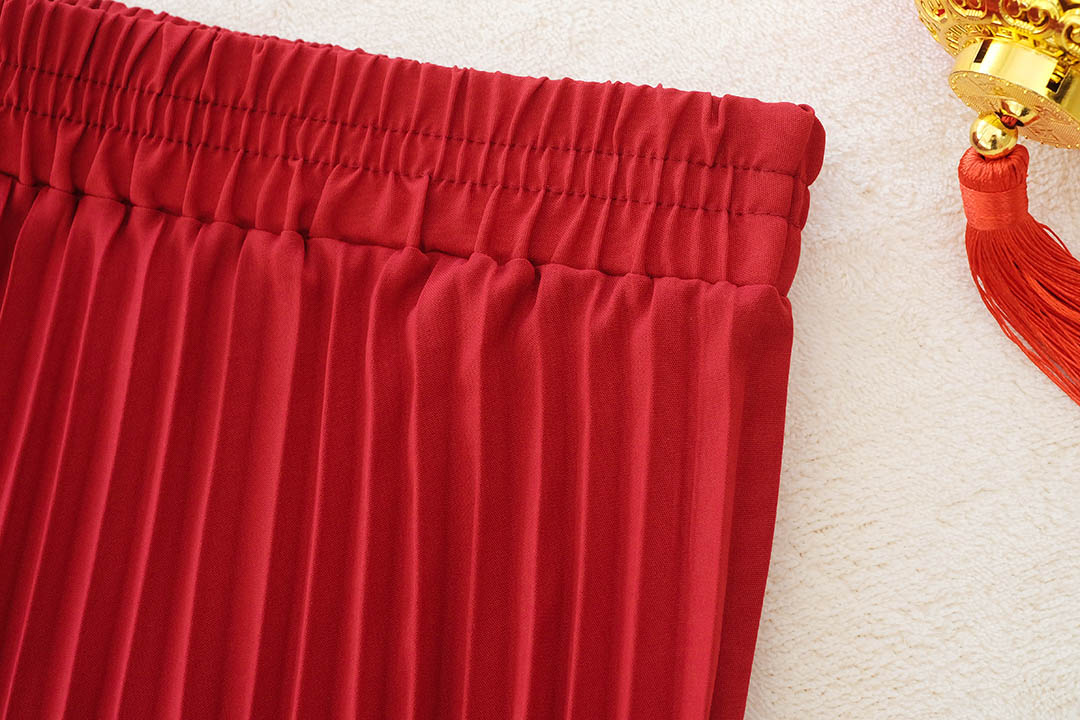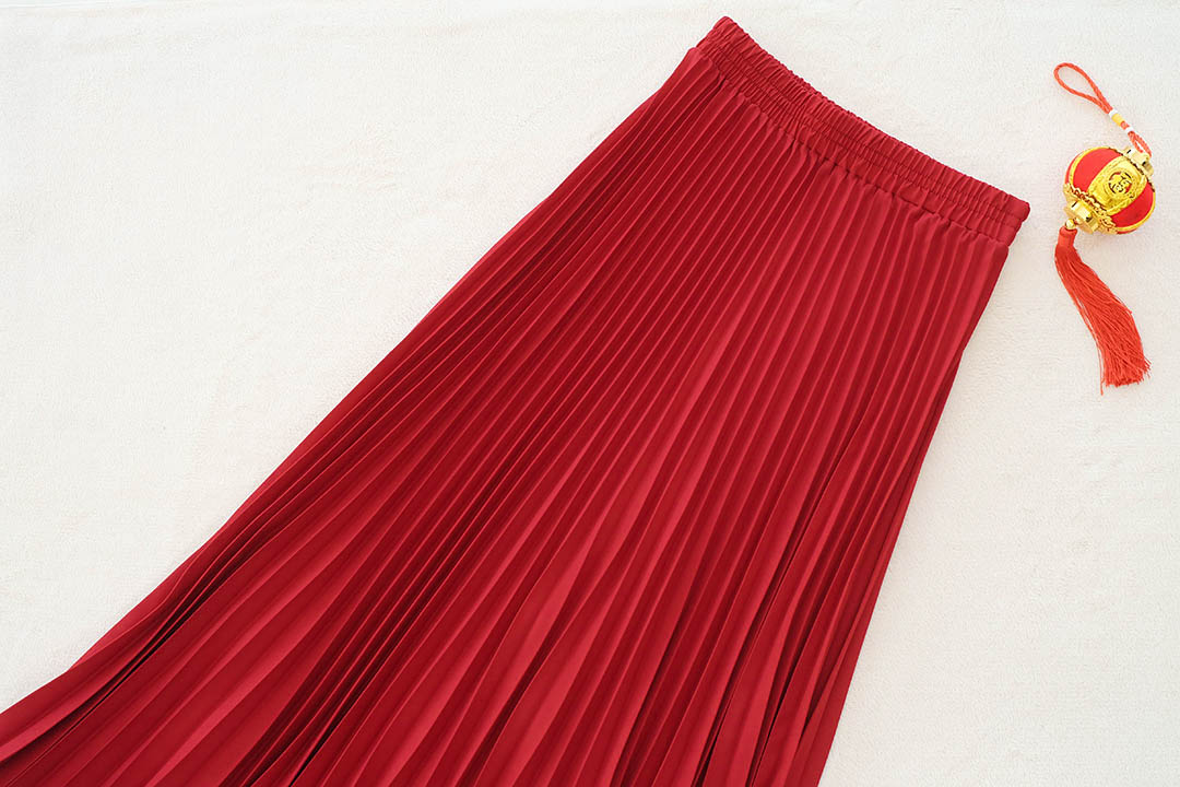 กระโปรงอัดพลีทสีแดงจับจีบแน่นอย่างเนี๊ยบ จีบสวยจีบไม่แตกค่า เนื้อผ้ามีน้ำหนักมันวาวใส่แล้วทิ้งตัวสวย ช่วงเอวเป็นยางยืด แบบน่ารัก ใส่แมทกับเสื้อคอจีนเข้ากันสุดๆ จัดไปไม่ผิดหว้ง