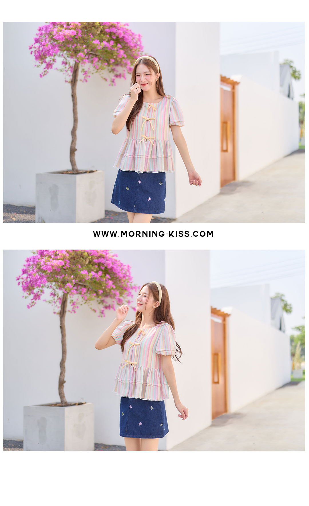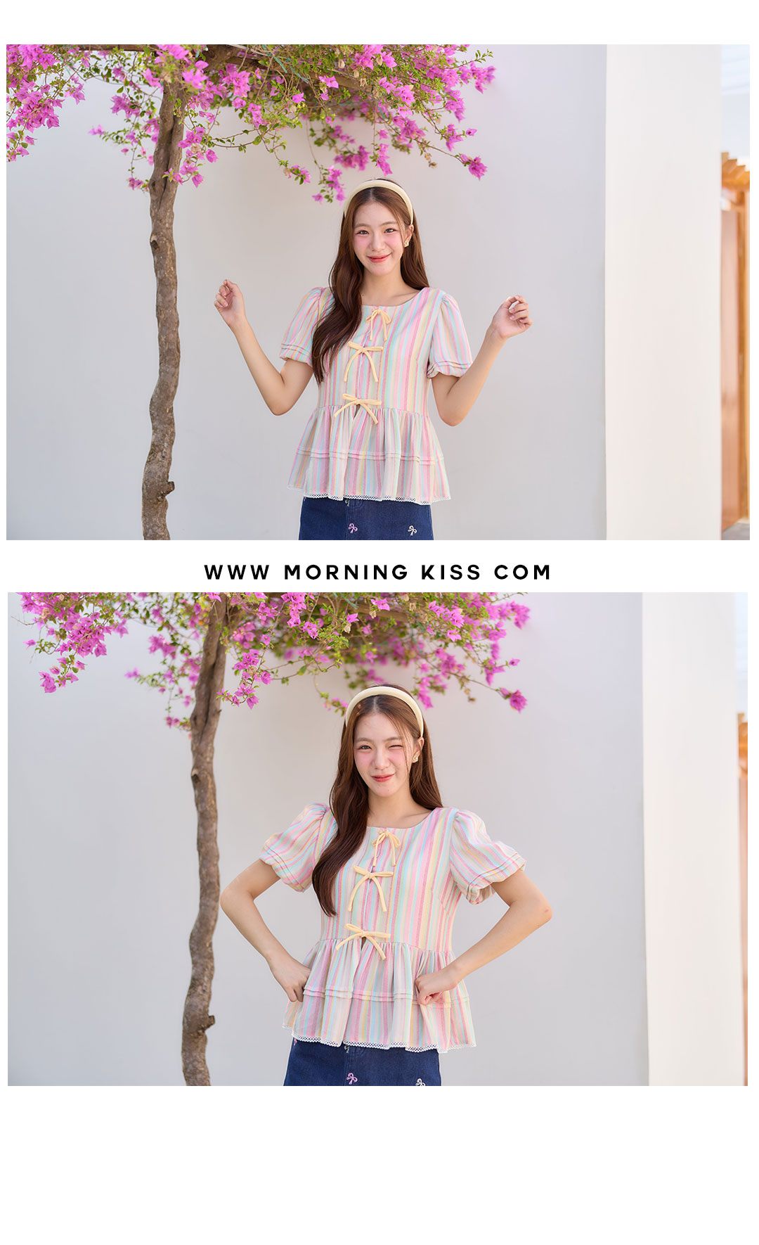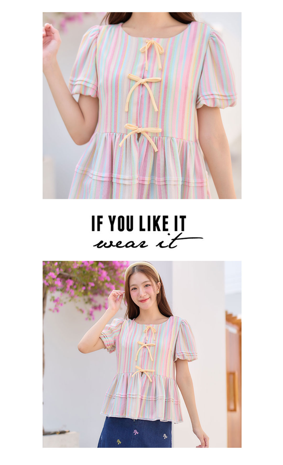 ดีไซน์ตัวนี้คือน่ารักให้ที่ 1 เฉดสีพาสเทลหวานๆซัมเมอร์ตะโกน ผ้า Cotton ลายทางนิ่มม้ากกกและยังมีซับในให้ทั้งตัว ดีเทลโบว์ผูกสีเหลืองละมุนเรียงด้านหน้า มีกระดุมซ่อนสาปเสื้อด้านใน ช่วงแขนเป็นทรงบอลลูนจับจีบคิวท์ๆ และชายเสื้อระบายจับจีบ พร้อมแต่งลูกไม้สีขาวเล็กๆ เพิ่มความหวานละมุนแบบลูกคุณหนู everydaylookใส่ง่ายๆ น่ารักสดใสขนาดนี้สาวหวานห้ามพลาดนะค้า