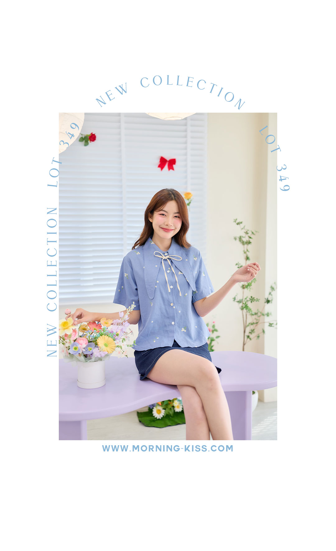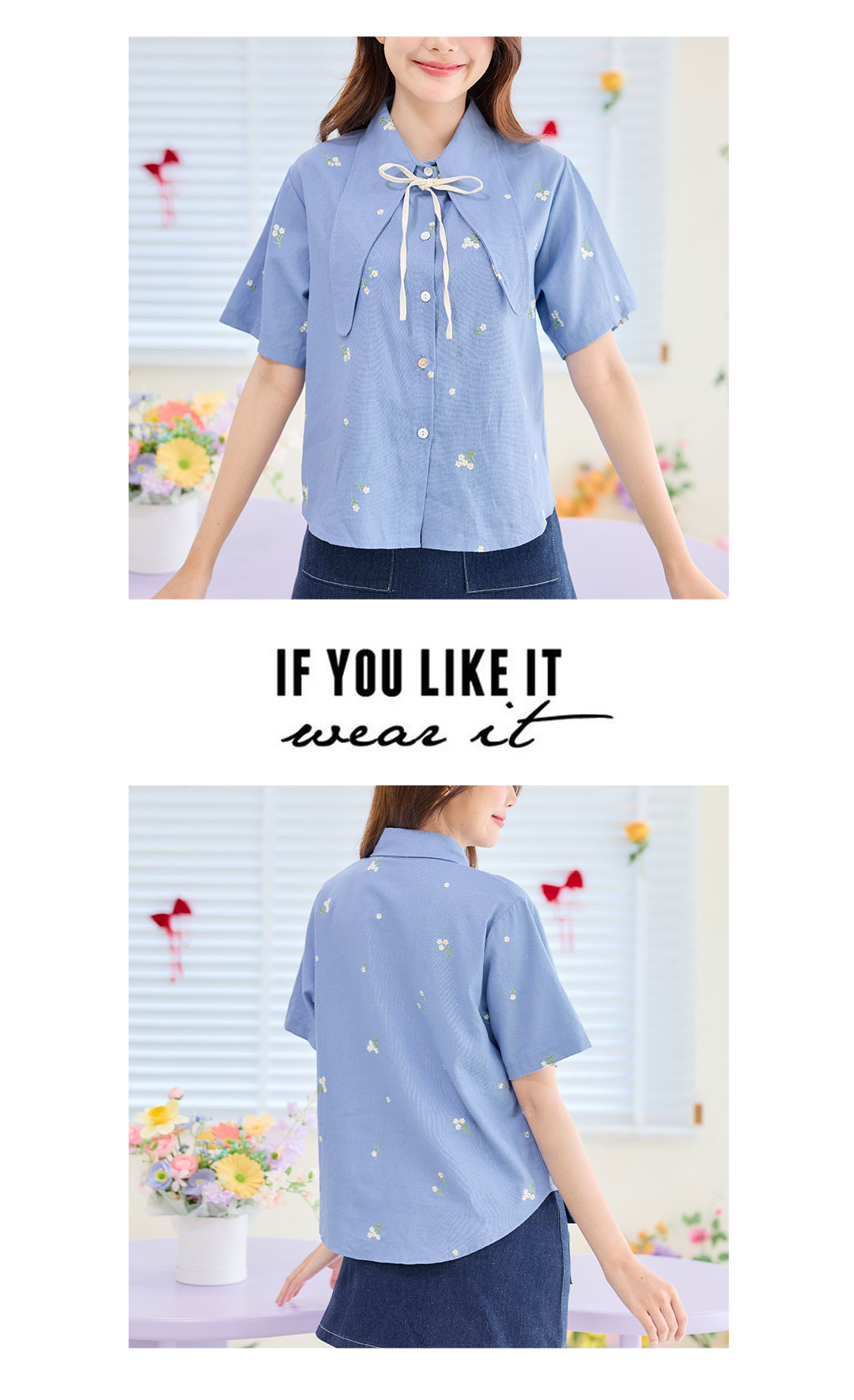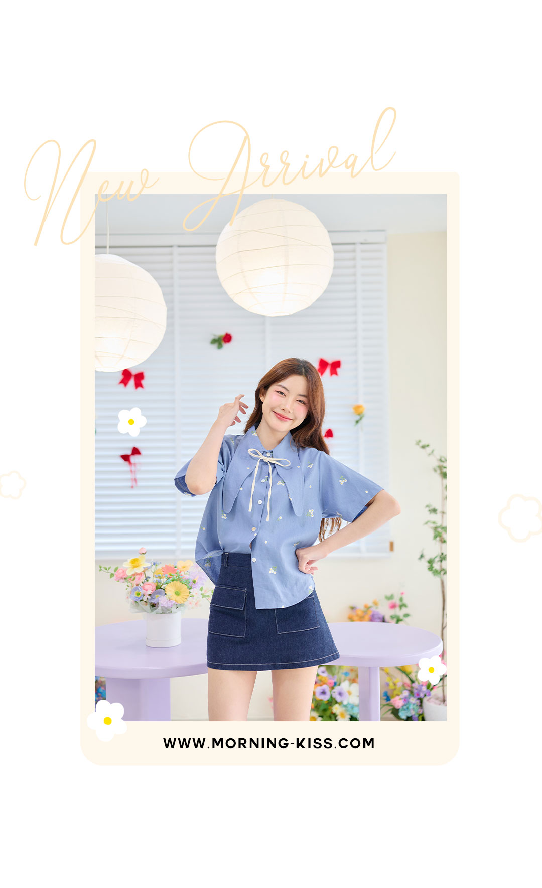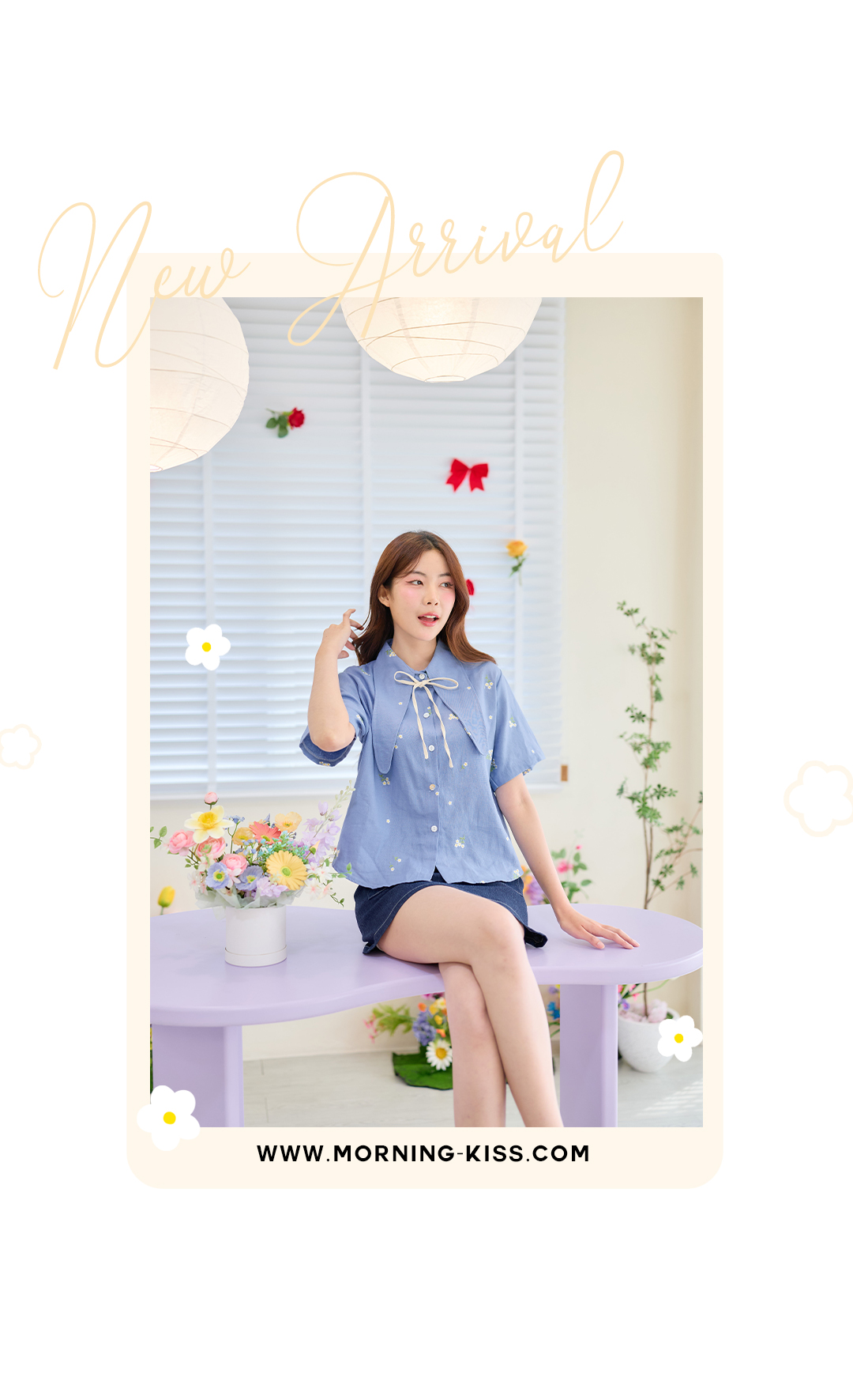 รุ่นนี้ใครใส่ก็สวยเกิด! กับเสื้อแขนสั้นคอปกหูกระต่ายโทนสีฟ้าที่มีทั้งความน่ารัก+เท่ปนกันแบบลงตัว เป็นผ้าคอตตอนปักลายดอกไม้รอบตัวสุดเนี้ยบ ดีไซน์คอปกหูกระต่ายสวยเก๋สุดๆ แต่งด้วยโบว์ผูกสีครีมด้านหน้า ความน่าร้ากเต็มสิบ กระดุมเรียงหน้า รุ่นนี้มิกซ์แอนด์แมตช์ได้ไม่มีเบื่อ รีบจับจองด่วนก่อนหมดนะค้าา~