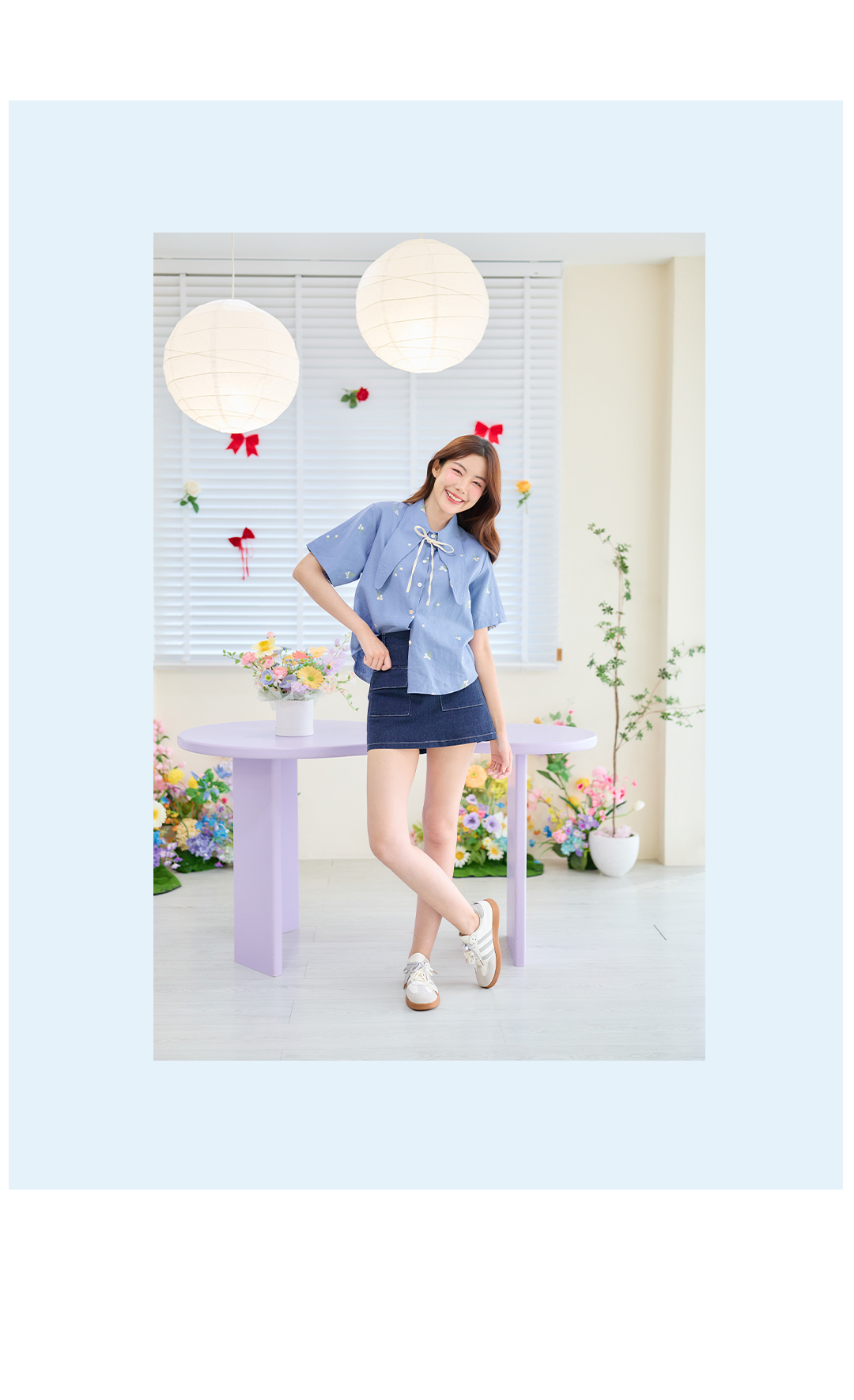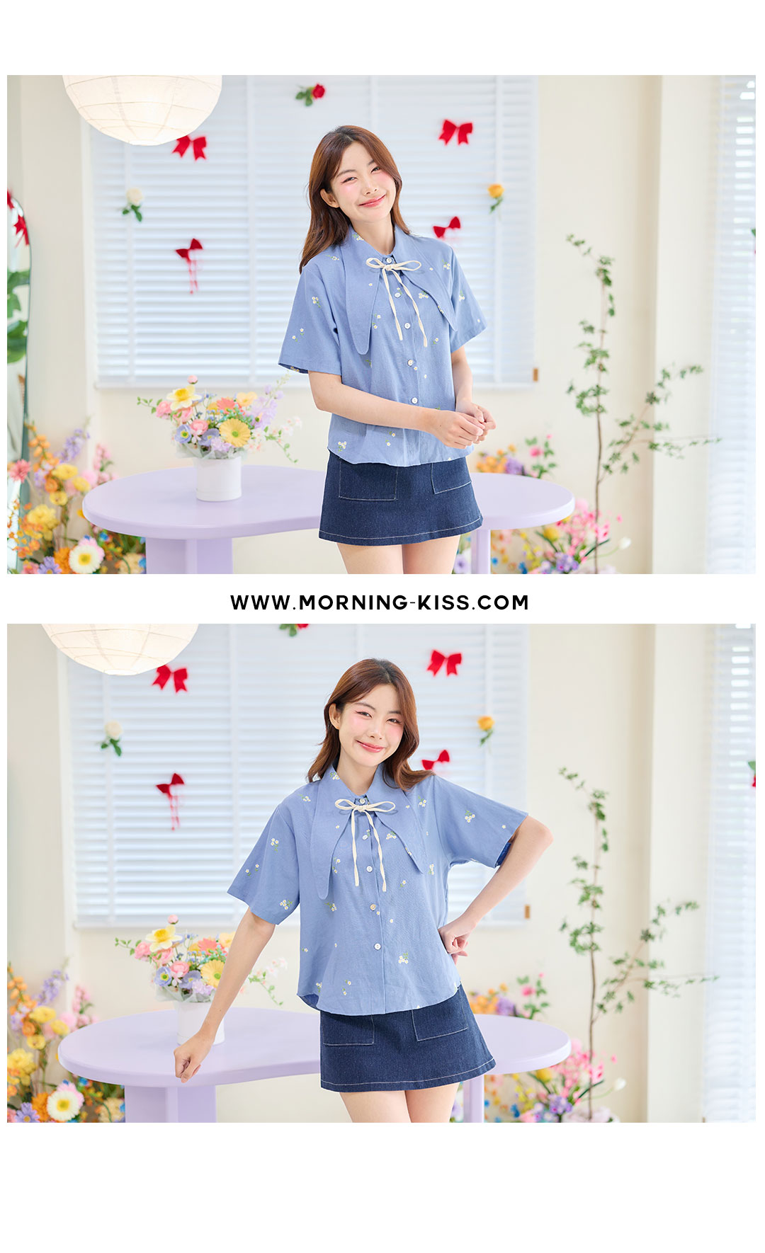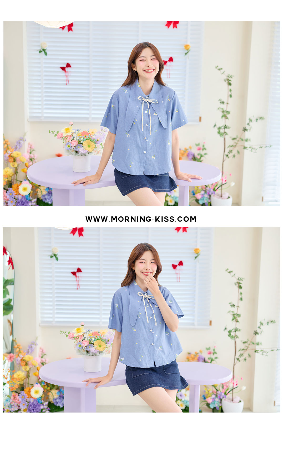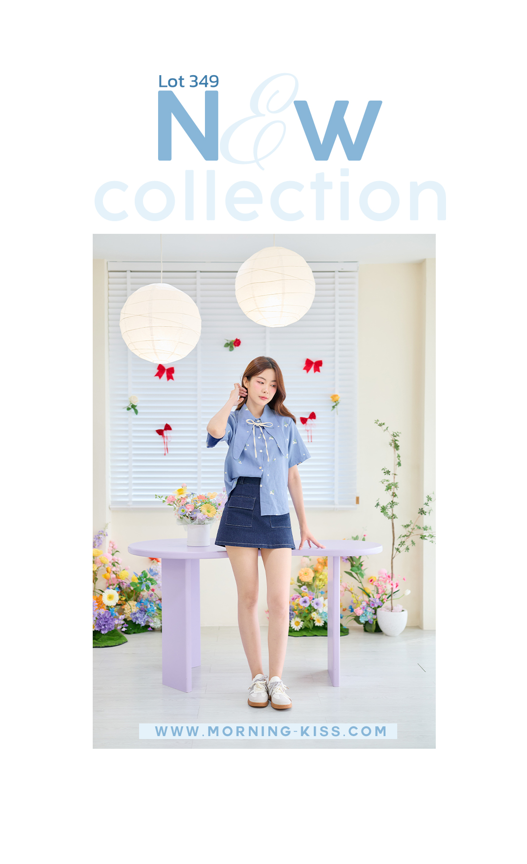 รุ่นนี้ใครใส่ก็สวยเกิด! กับเสื้อแขนสั้นคอปกหูกระต่ายโทนสีฟ้าที่มีทั้งความน่ารัก+เท่ปนกันแบบลงตัว เป็นผ้าคอตตอนปักลายดอกไม้รอบตัวสุดเนี้ยบ ดีไซน์คอปกหูกระต่ายสวยเก๋สุดๆ แต่งด้วยโบว์ผูกสีครีมด้านหน้า ความน่าร้ากเต็มสิบ กระดุมเรียงหน้า รุ่นนี้มิกซ์แอนด์แมตช์ได้ไม่มีเบื่อ รีบจับจองด่วนก่อนหมดนะค้าา~