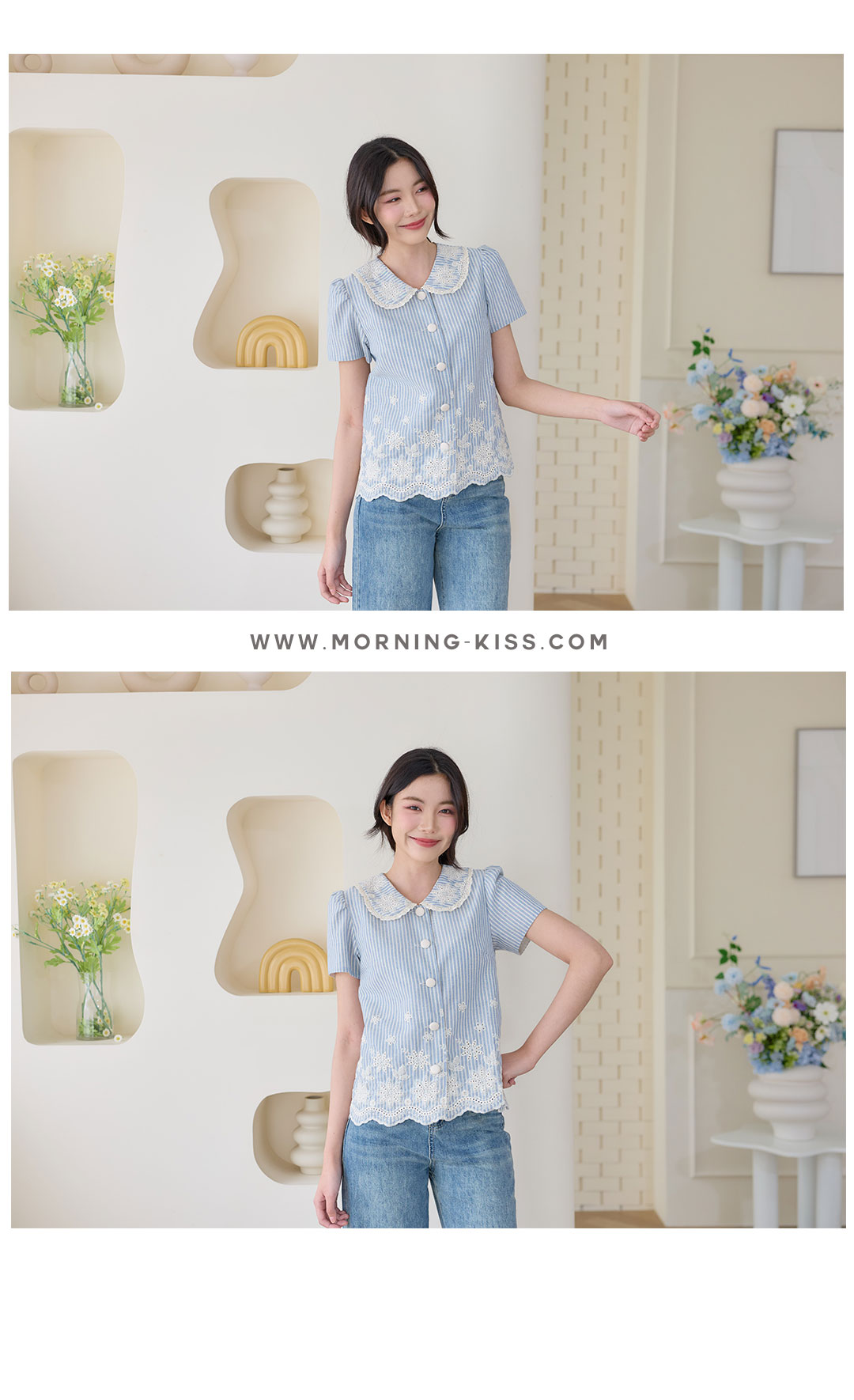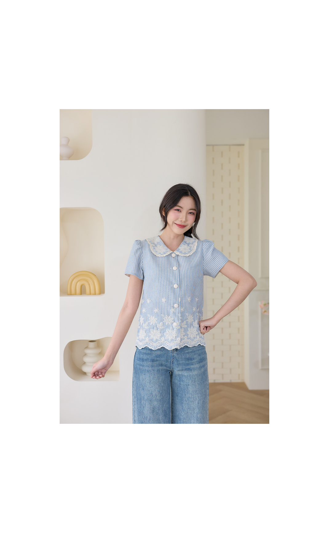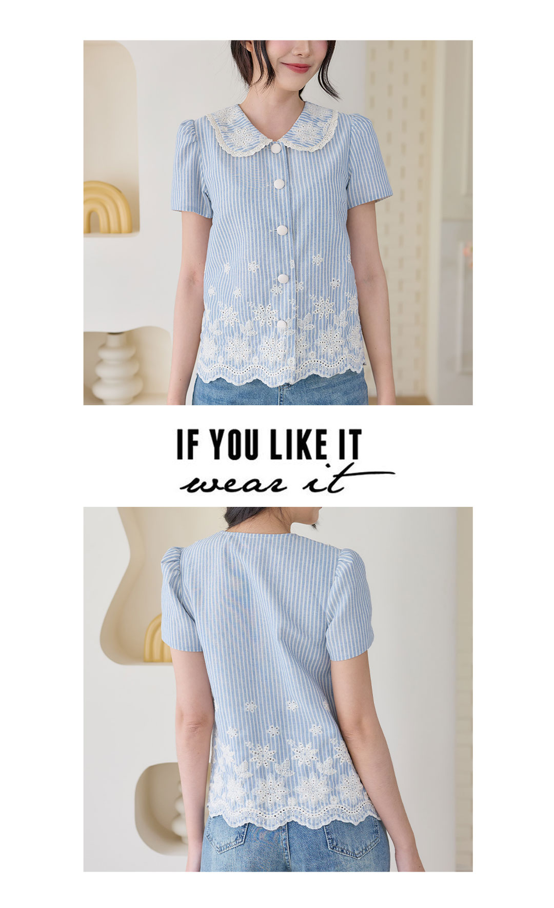 มาแล้วค่าาา โทนสีฟ้าที่ทุกคนรอคอยจัดมาให้แล้ว เสื้อแขนสั้นลายทางสีฟ้าครีมคอปกบัวงานปัก เป็นผ้าคอตตอนลินินลายทางฟ้าสลับครีม คือโทนสีละมุนมากก ดีเทลงานปักแน่นๆที่ชายเสื้อและคอปกแถมกุ๊นลูกไม้เล็กๆด้วยน้า แถมชายเสื้อเป็นชายเชิงเพิ่มความคิ้วท์ไปอีกก กระดุมเรียงหน้า ใส่แล้วได้ลุคสาวหวานละมุนสุดๆ ใส่กับกางเกงหรือกระโปรงยีนส์ก็ดูชิลล์น่ารัก พลาดไม่ได้จริงๆนะค้า