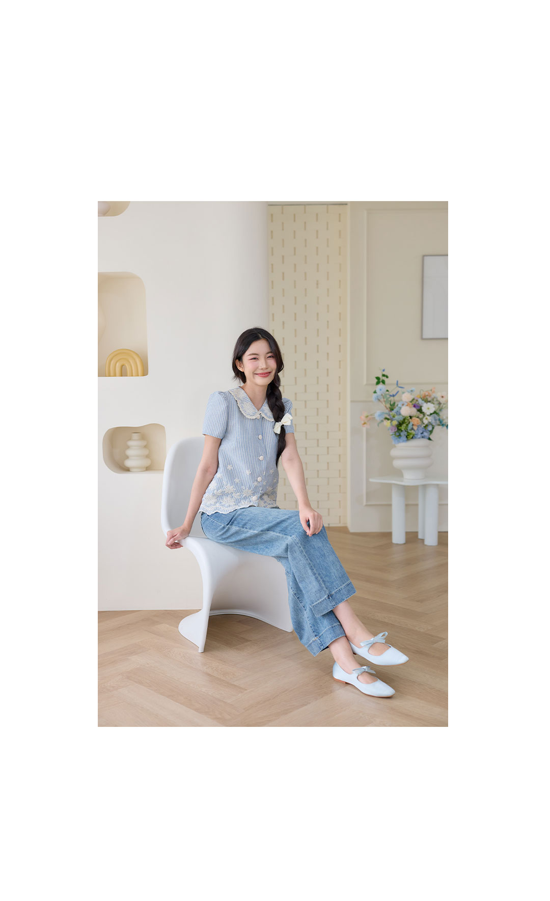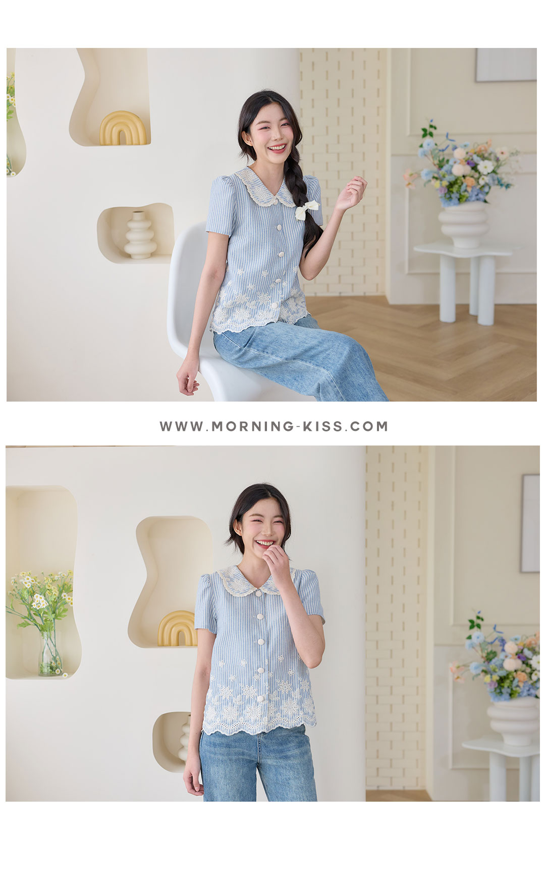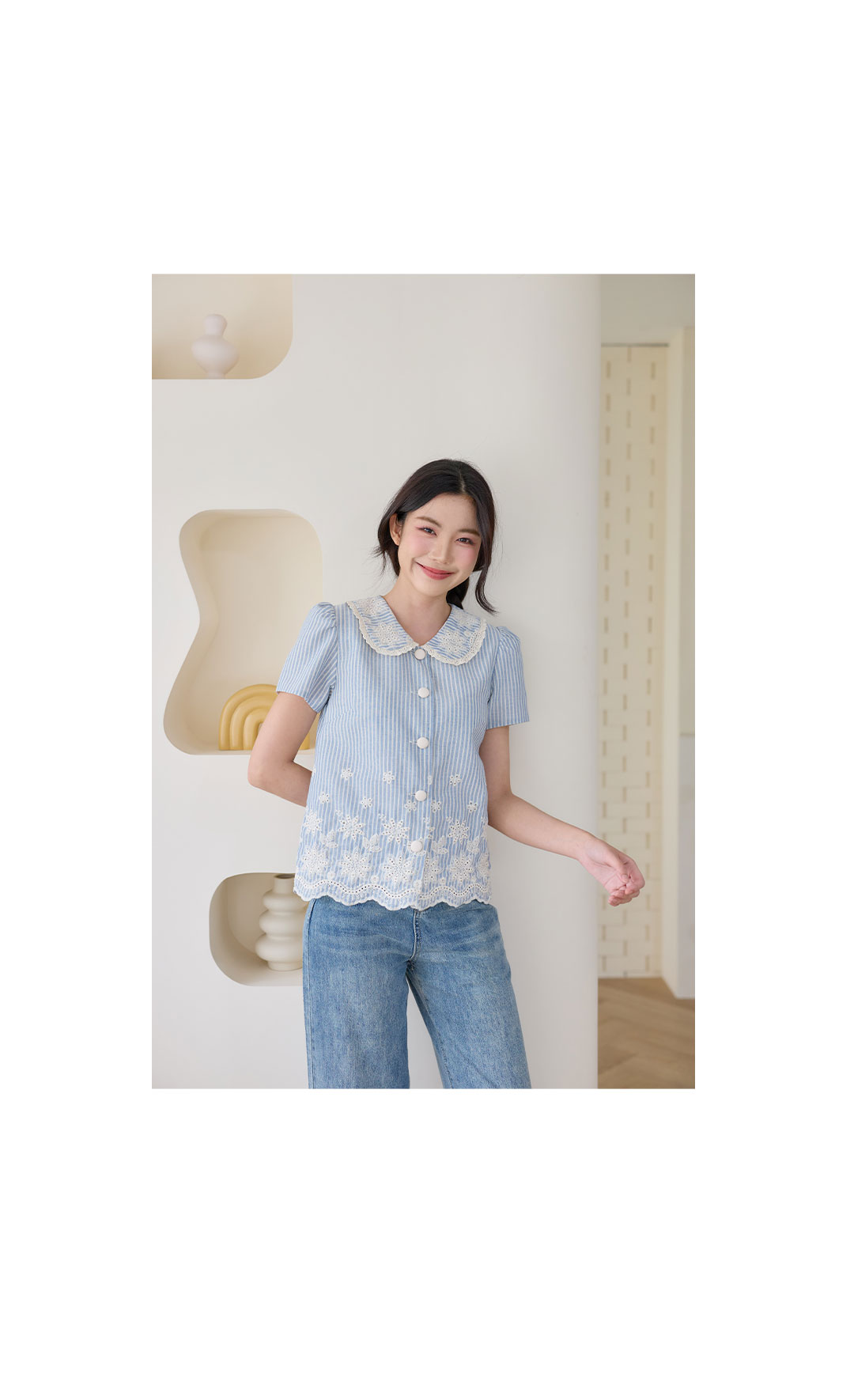 มาแล้วค่าาา โทนสีฟ้าที่ทุกคนรอคอยจัดมาให้แล้ว เสื้อแขนสั้นลายทางสีฟ้าครีมคอปกบัวงานปัก เป็นผ้าคอตตอนลินินลายทางฟ้าสลับครีม คือโทนสีละมุนมากก ดีเทลงานปักแน่นๆที่ชายเสื้อและคอปกแถมกุ๊นลูกไม้เล็กๆด้วยน้า แถมชายเสื้อเป็นชายเชิงเพิ่มความคิ้วท์ไปอีกก กระดุมเรียงหน้า ใส่แล้วได้ลุคสาวหวานละมุนสุดๆ ใส่กับกางเกงหรือกระโปรงยีนส์ก็ดูชิลล์น่ารัก พลาดไม่ได้จริงๆนะค้า