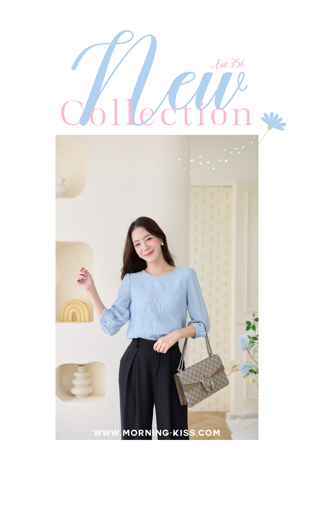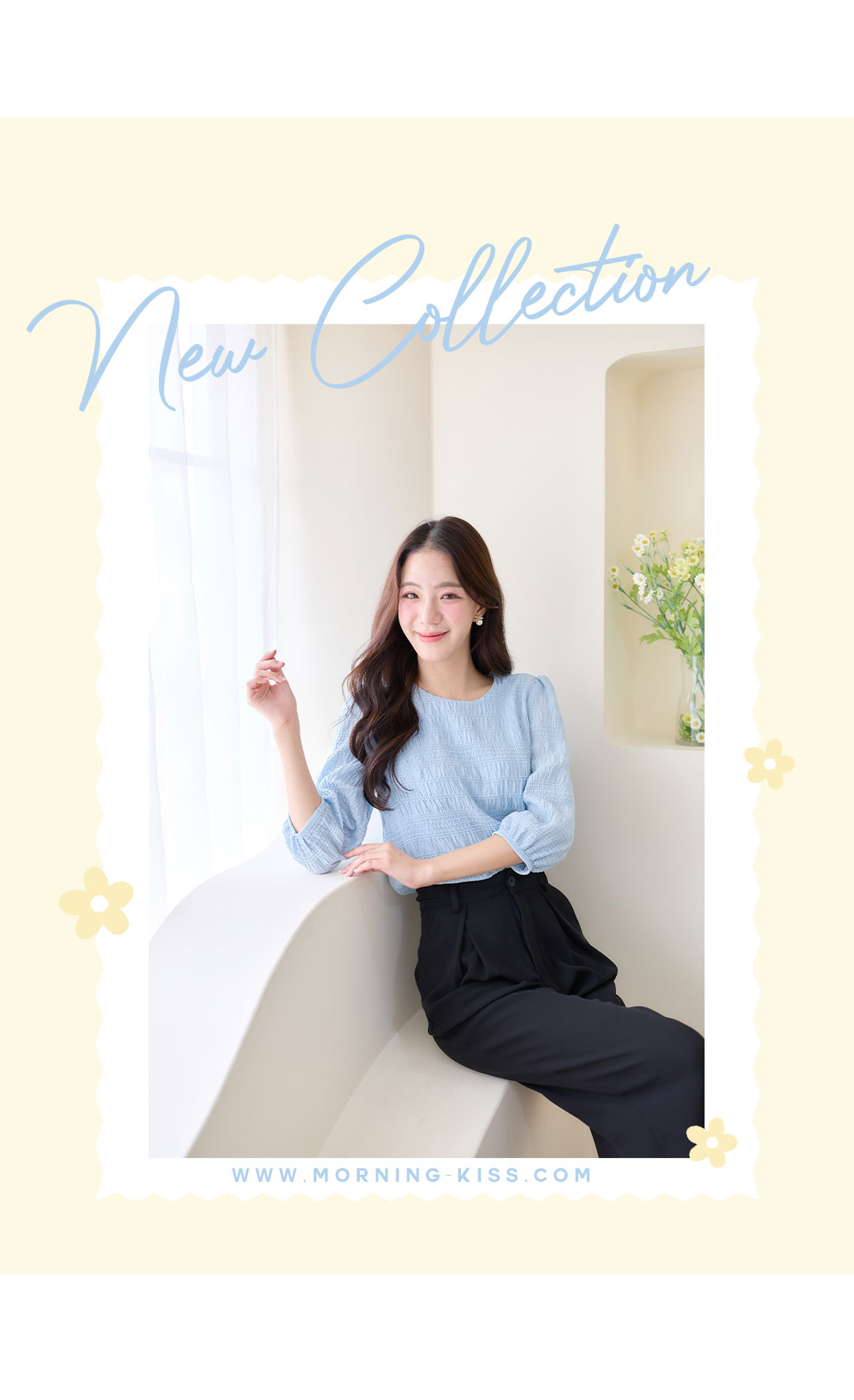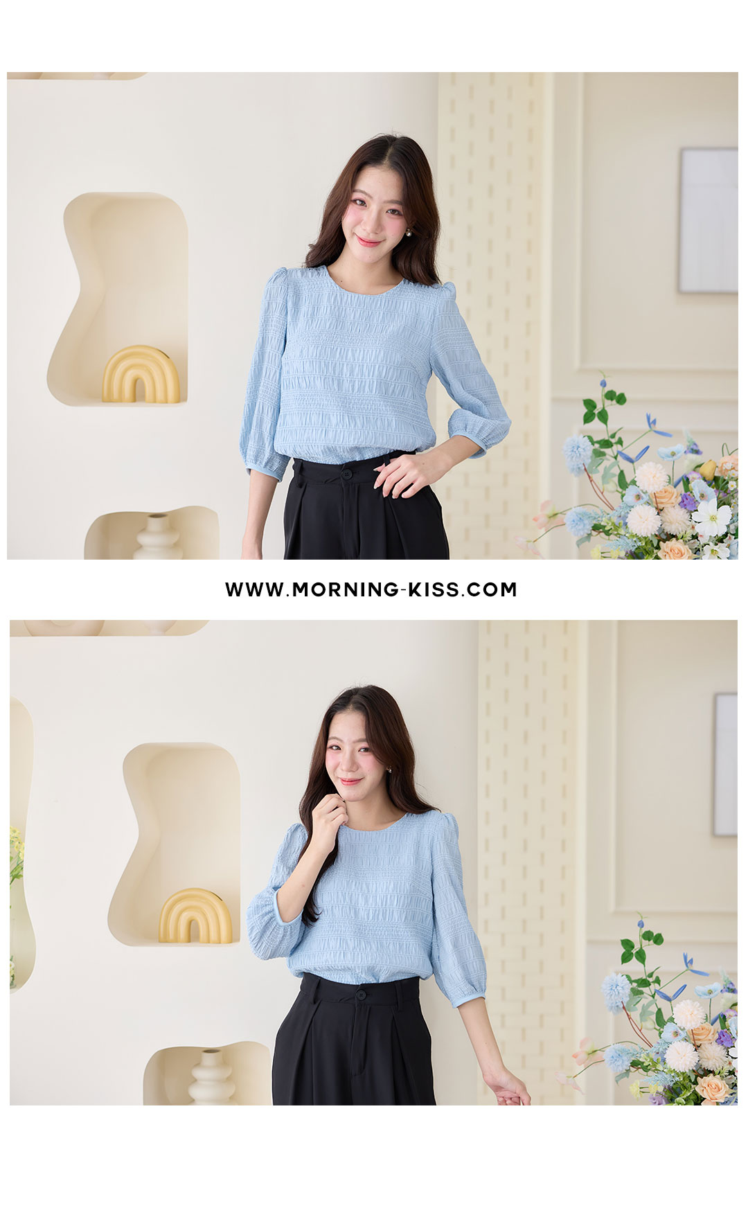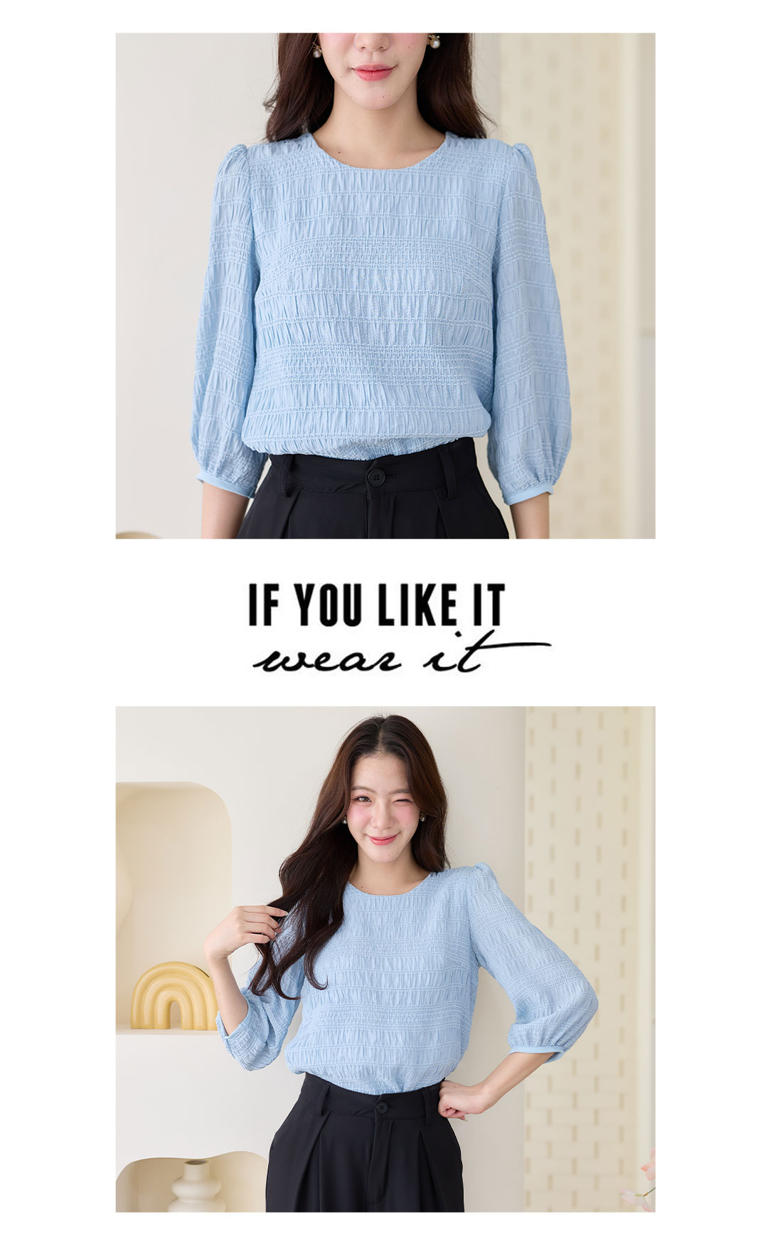 สวยหวานเกินเบอร์ไปอีกแล้ววว เป็นเสื้อแขน 4 ส่วนโทนสีฟ้าอ่อนๆ ที่เริ่ดคือดีไซน์ผ้าแบบย่นๆ ยืดๆ ทำให้ดูมีอะไร ไม่เรียบๆน่าเบื่อ ให้ฟีลแบบมีเท็กซ์เจอร์เก๋ๆ ทรงเสื้อคือใส่สบายมาก แขนเสื้อเป็นแบบ 4 ส่วน พองๆนิดๆ คือน่ารักมาก! ใส่ซับในให้ทั้งตัว ใครที่ชอบงานแบบเรียบๆ ต้องจัดรุ่นนี้ไป ใส่แล้วได้ฟีลสาวหวานๆใสๆ แต่ยังดูมีสไตล์ จะแมทช์กับกางเกงสีดำแบบในรูปก็คือดูดี ดูคลีนๆ หรือจะใส่กับกางเกงสีขาว/ยีนส์ก็ยังเข้ากัน! เหมาะกับทุกโอกาสเลยน้า ของมันต้องมีจริงๆ รีบตำด่วนๆ ก่อนของหมดนะค้าา