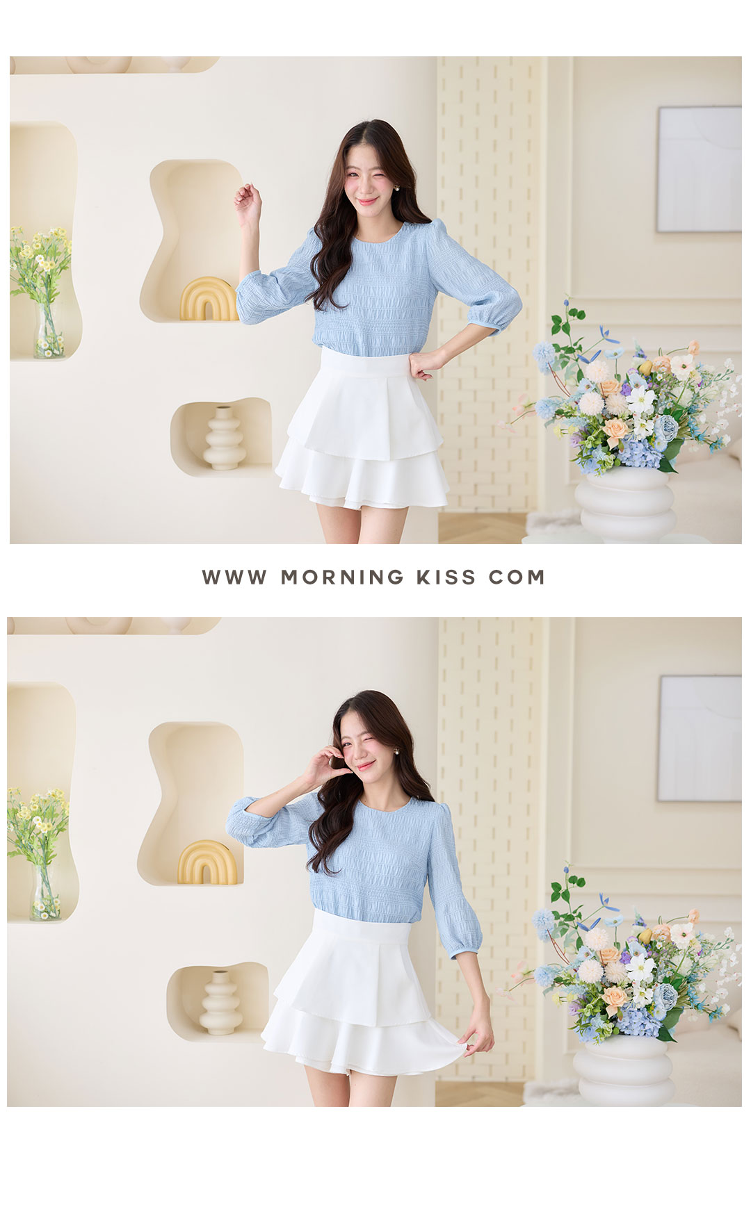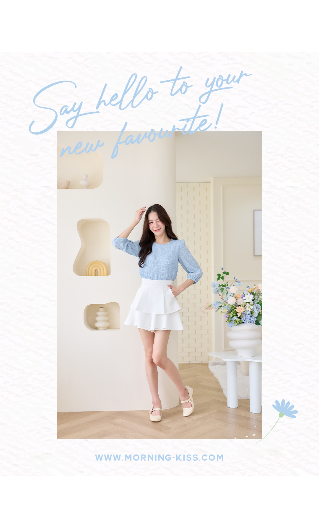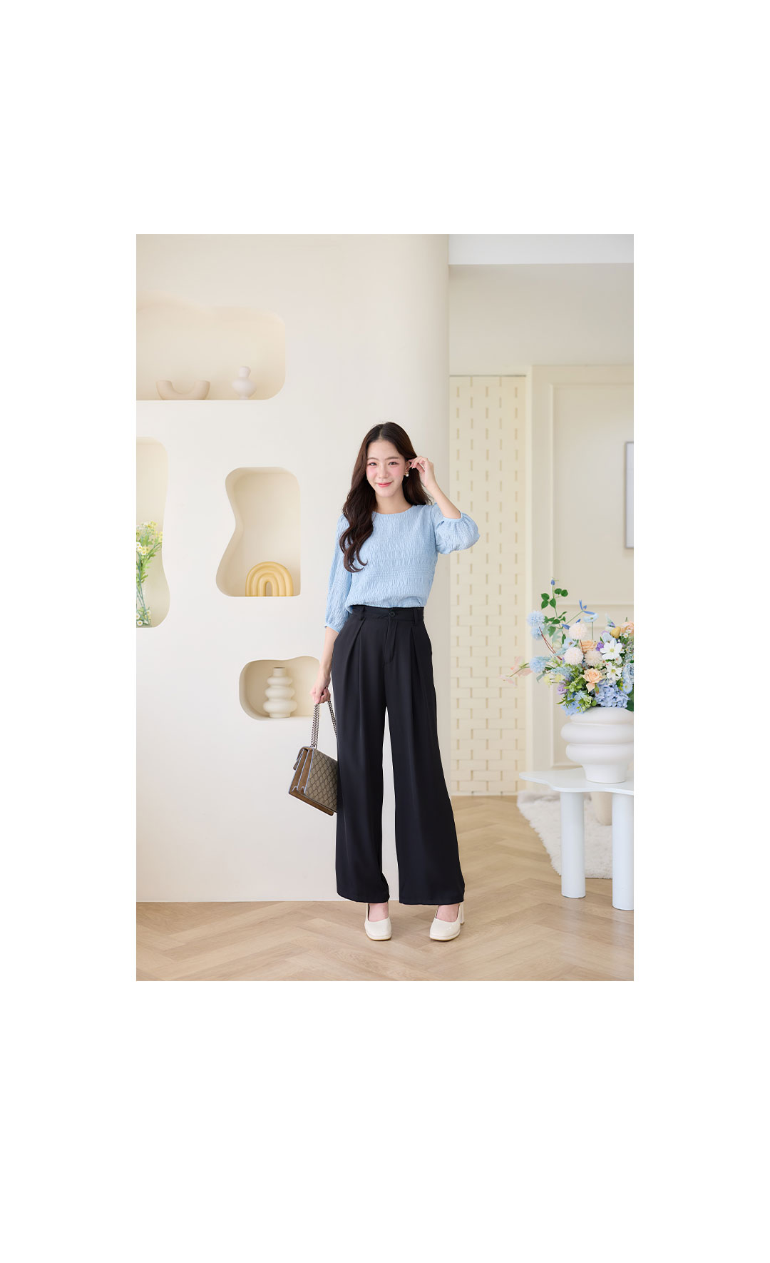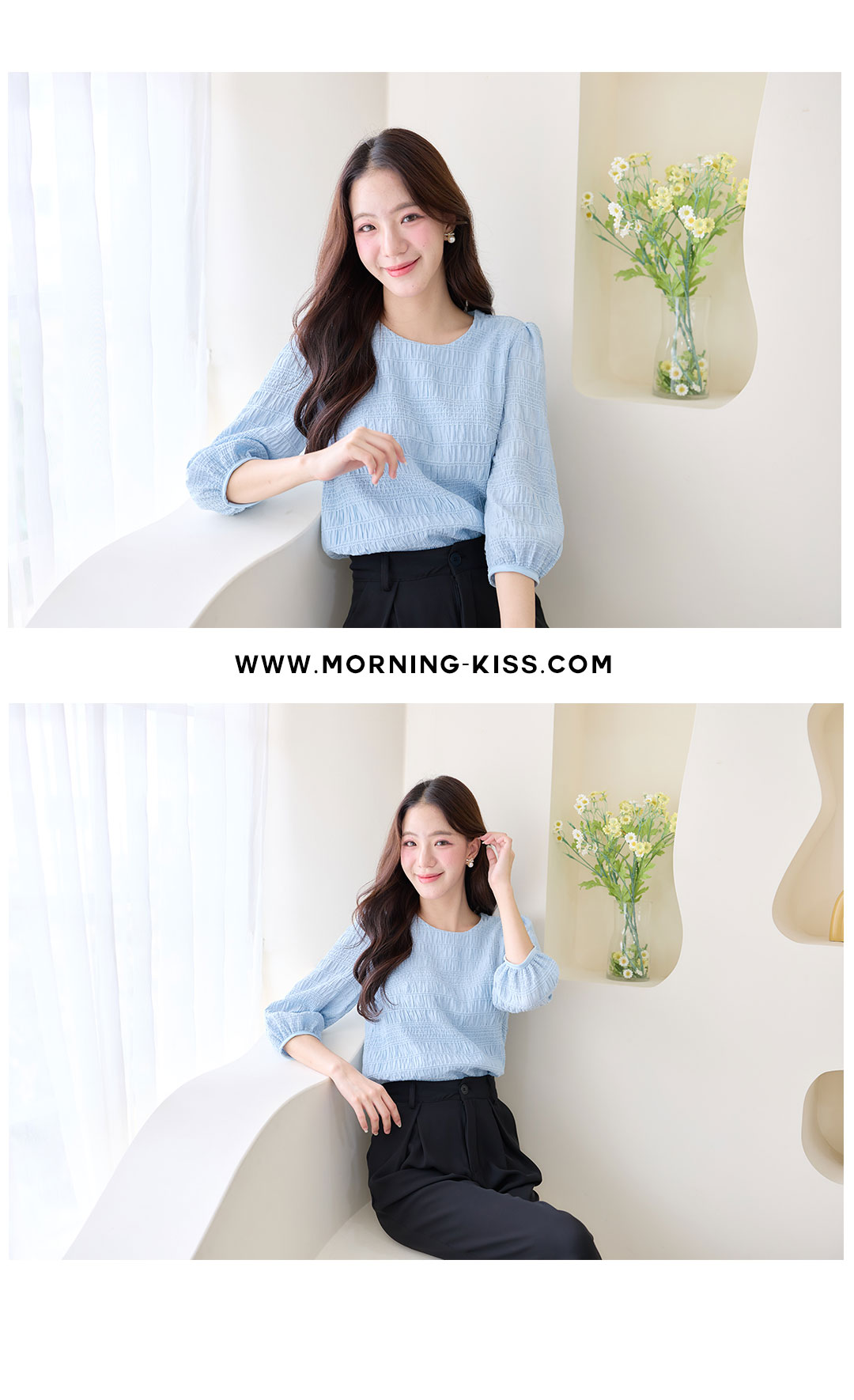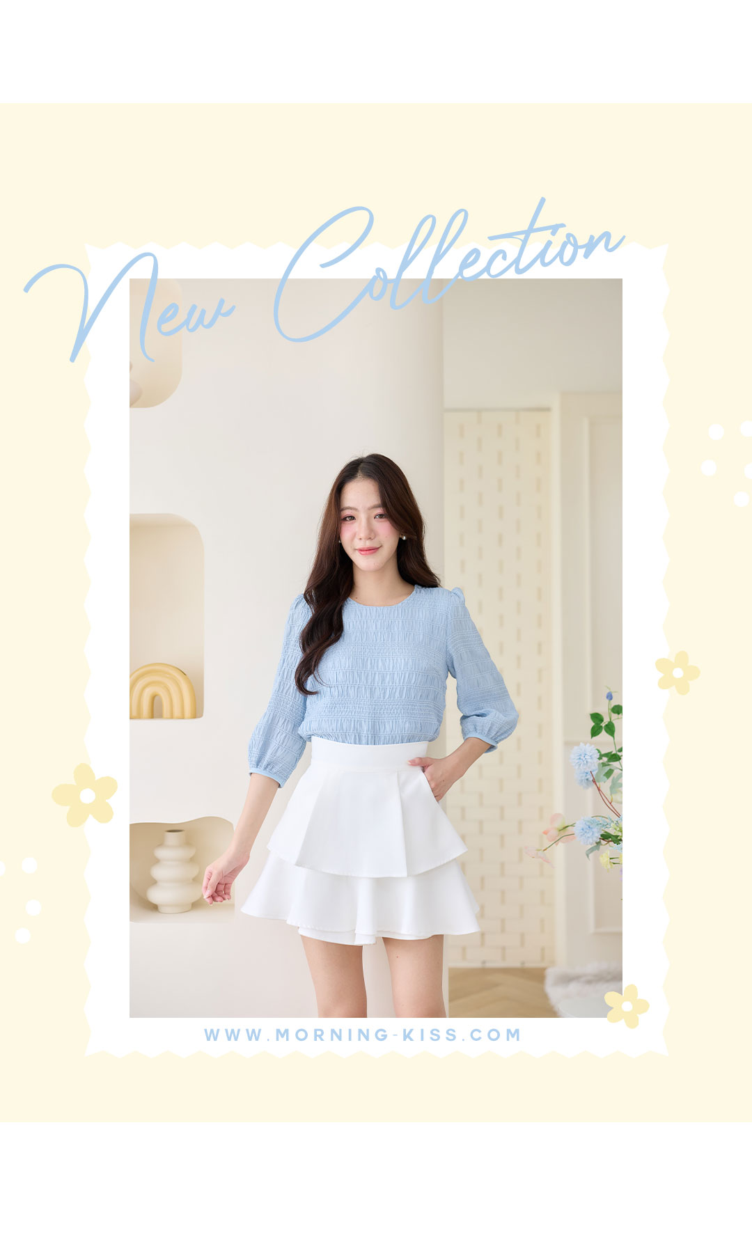 สวยหวานเกินเบอร์ไปอีกแล้ววว เป็นเสื้อแขน 4 ส่วนโทนสีฟ้าอ่อนๆ ที่เริ่ดคือดีไซน์ผ้าแบบย่นๆ ยืดๆ ทำให้ดูมีอะไร ไม่เรียบๆน่าเบื่อ ให้ฟีลแบบมีเท็กซ์เจอร์เก๋ๆ ทรงเสื้อคือใส่สบายมาก แขนเสื้อเป็นแบบ 4 ส่วน พองๆนิดๆ คือน่ารักมาก! ใส่ซับในให้ทั้งตัว ใครที่ชอบงานแบบเรียบๆ ต้องจัดรุ่นนี้ไป ใส่แล้วได้ฟีลสาวหวานๆใสๆ แต่ยังดูมีสไตล์ จะแมทช์กับกางเกงสีดำแบบในรูปก็คือดูดี ดูคลีนๆ หรือจะใส่กับกางเกงสีขาว/ยีนส์ก็ยังเข้ากัน! เหมาะกับทุกโอกาสเลยน้า ของมันต้องมีจริงๆ รีบตำด่วนๆ ก่อนของหมดนะค้าา