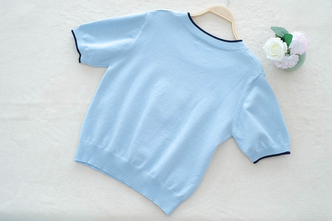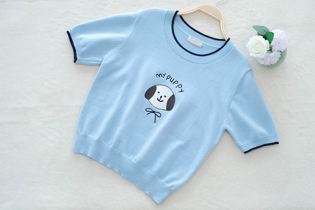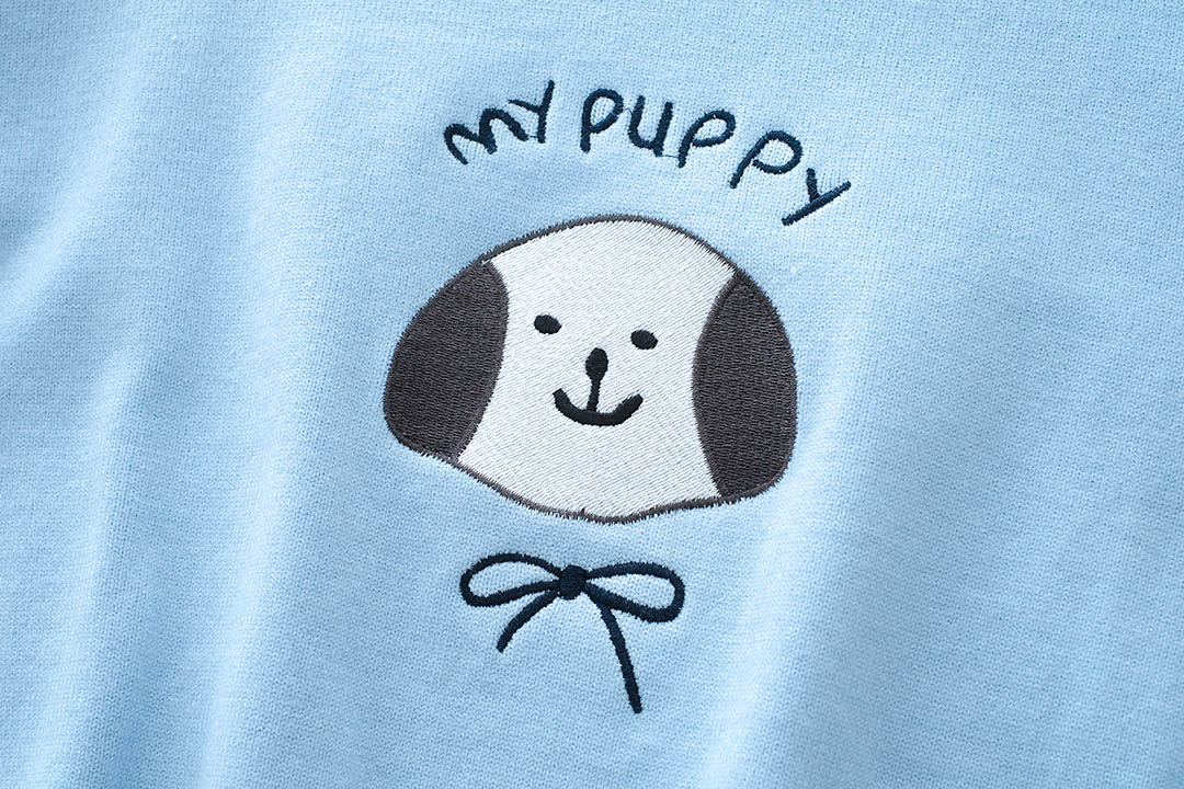 เสื้อตัวนี้คิ้วท์แบบตะโกนเป็นผ้า knitting เนื้อนุ่มๆ ใส่สบายสุดๆ ไม่ต้องกลัวร้อนเลย ความน่ารักเกินต้านคือลายปักน้องหมาสุดคิ้วท์ พร้อมคำว่า my puppy ที่ด้านบน สีฟ้าพาสเทลละมุนมาก ตัดกับขอบคอและแขนสีน้ำเงินเข้ม แมทช์ง่ายสุดๆ จะใส่กับกางเกงยีนส์ก็ดูเก๋ หรือใส่กับกระโปรงก็ได้ลุคหวานๆ ใส่แล้วน่ารักจนใจเจ็บ! ใครเห็นก็ต้องตกหลุมรักแน่นอน!