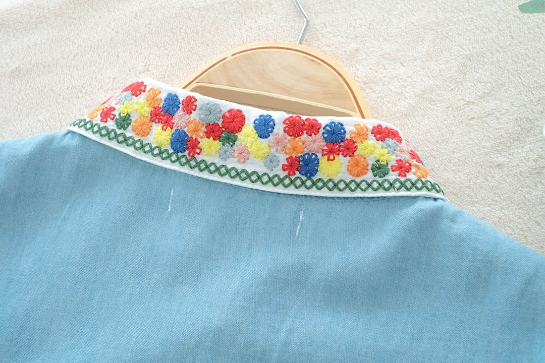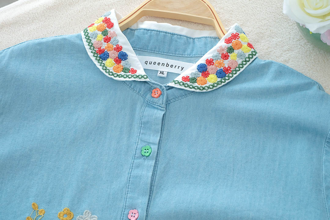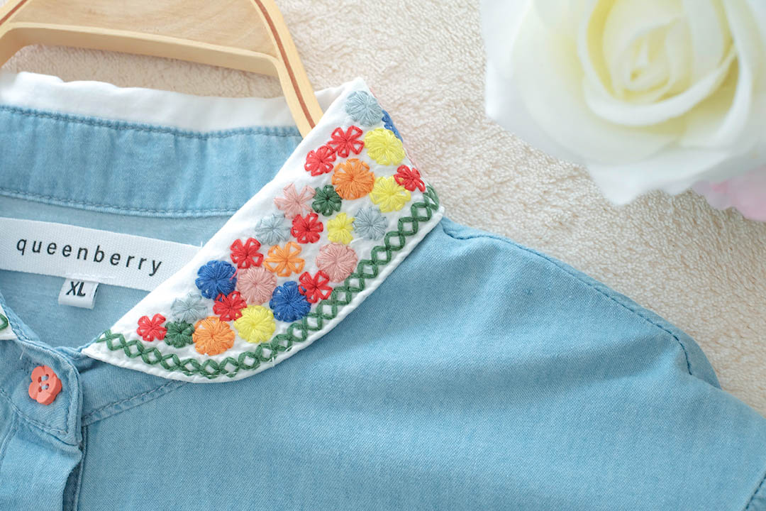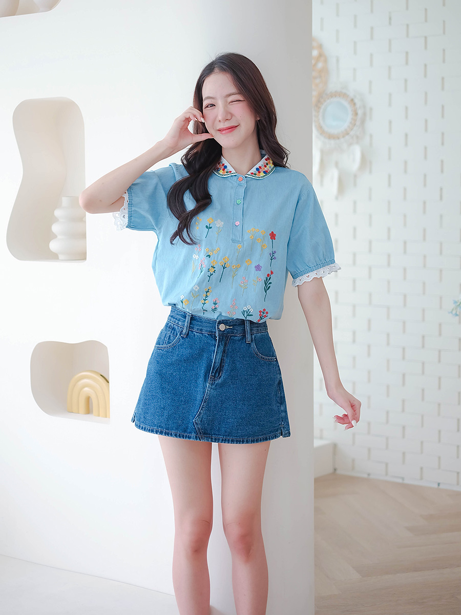 เสื้อตัวนี้คือน่ารักแบบกินขาด เสื้อยีนส์สีฟ้าอ่อนสุดคิ้วท์ ดีเทลคือจัดเต็มมาก คอปกปักลายดอกไม้สีสันสดใส และกระดุมก็ยังเป็นสีๆ เข้ากับลายปักสุดๆ ตัวเสื้อก็ปักลายดอกไม้เล็กๆ น่ารักๆ ด้านหน้า แขนเสื้อยังตกแต่งด้วยลูกไม้สีขาว ให้ฟีลสาวหวานๆ สไตล์วินเทจ แมทช์ง่ายมาก ใส่แล้วได้ลุคคุณหนูที่ดูสดใสขี้เล่น ไม่ว่าจะไปเที่ยว ไปคาเฟ่ หรือไปเดทก็คือเริ่ดหมด รับรองว่าตัวจริงน่ารักกว่าในรูปแน่นอน ห้ามพลาดเลยนะ