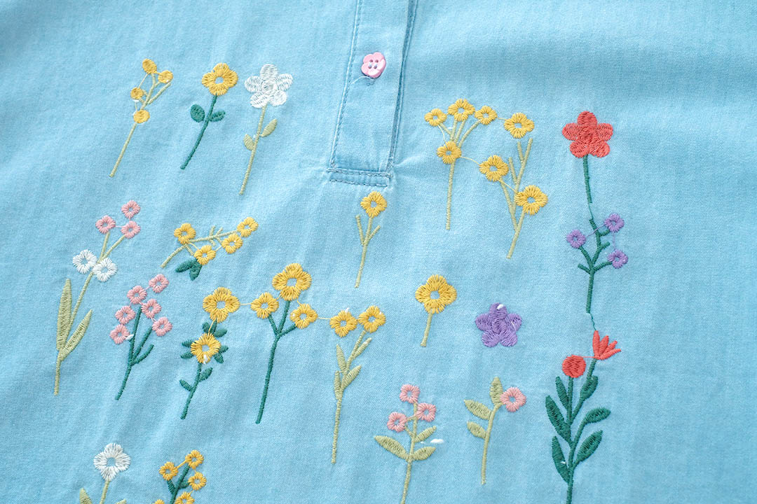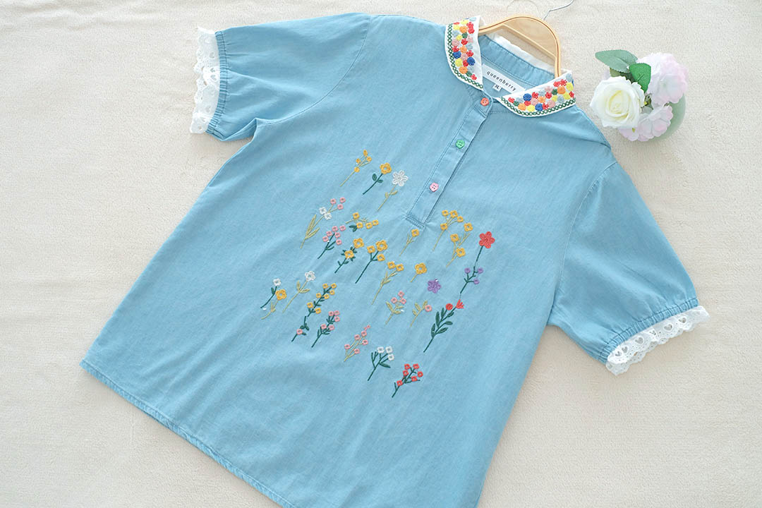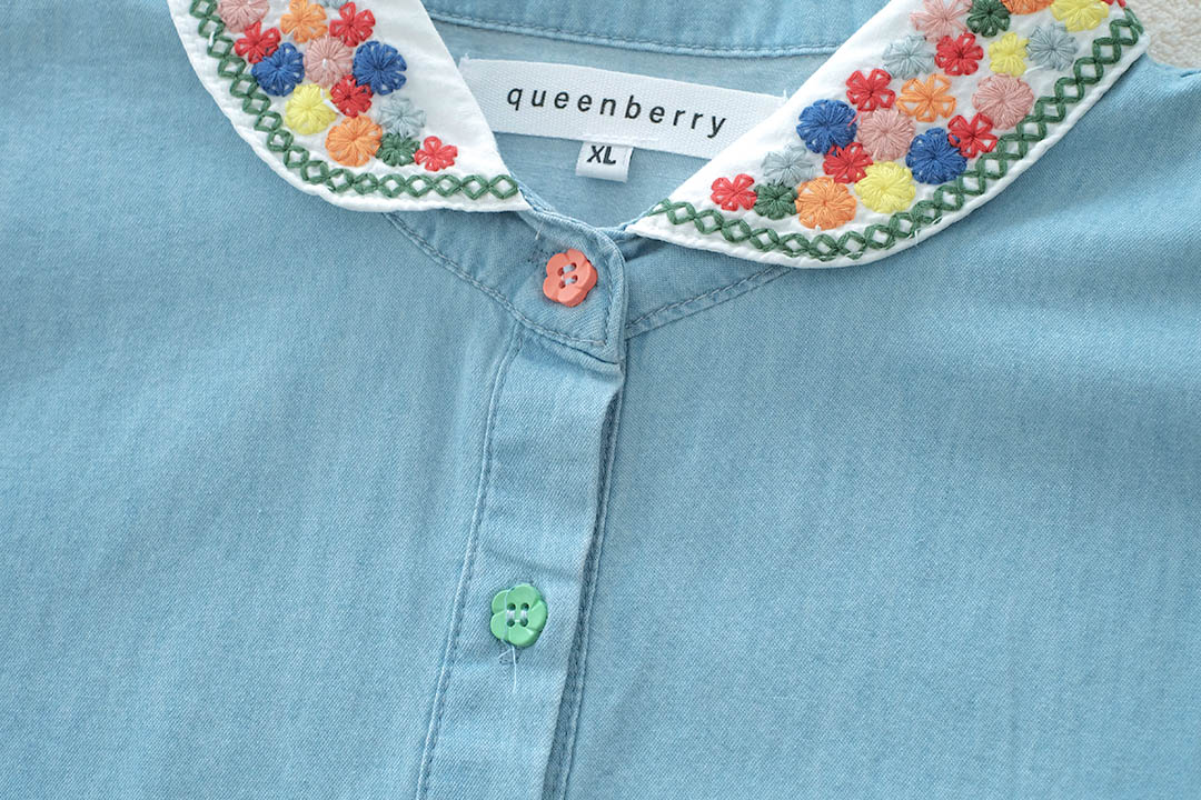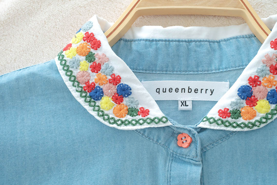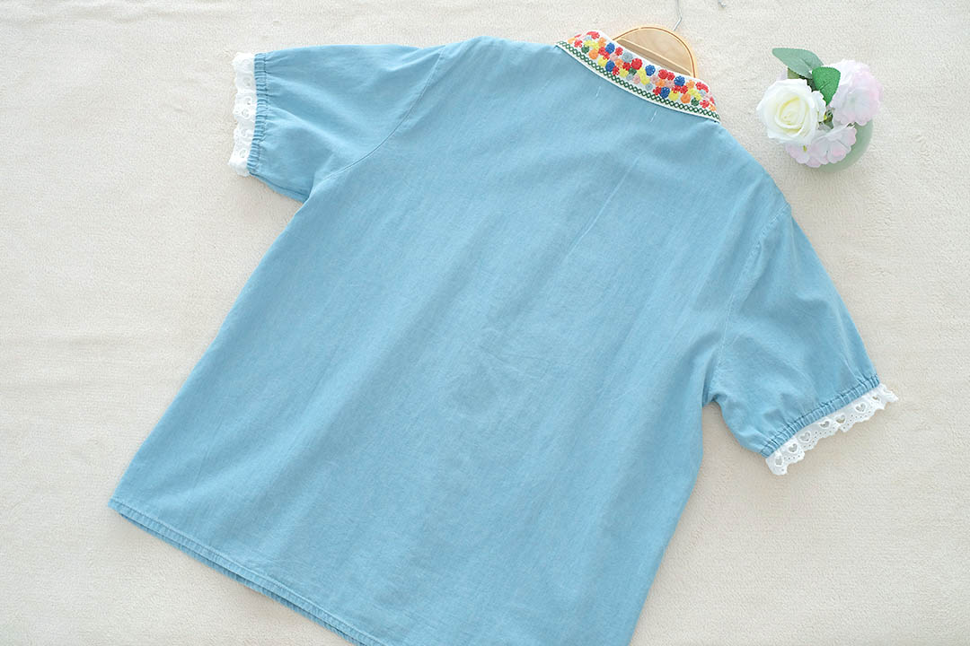 เสื้อตัวนี้คือน่ารักแบบกินขาด เสื้อยีนส์สีฟ้าอ่อนสุดคิ้วท์ ดีเทลคือจัดเต็มมาก คอปกปักลายดอกไม้สีสันสดใส และกระดุมก็ยังเป็นสีๆ เข้ากับลายปักสุดๆ ตัวเสื้อก็ปักลายดอกไม้เล็กๆ น่ารักๆ ด้านหน้า แขนเสื้อยังตกแต่งด้วยลูกไม้สีขาว ให้ฟีลสาวหวานๆ สไตล์วินเทจ แมทช์ง่ายมาก ใส่แล้วได้ลุคคุณหนูที่ดูสดใสขี้เล่น ไม่ว่าจะไปเที่ยว ไปคาเฟ่ หรือไปเดทก็คือเริ่ดหมด รับรองว่าตัวจริงน่ารักกว่าในรูปแน่นอน ห้ามพลาดเลยนะ