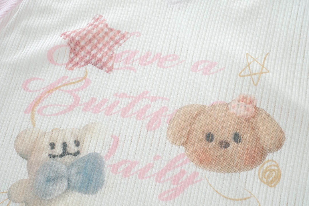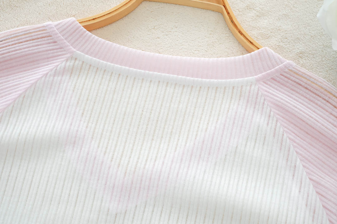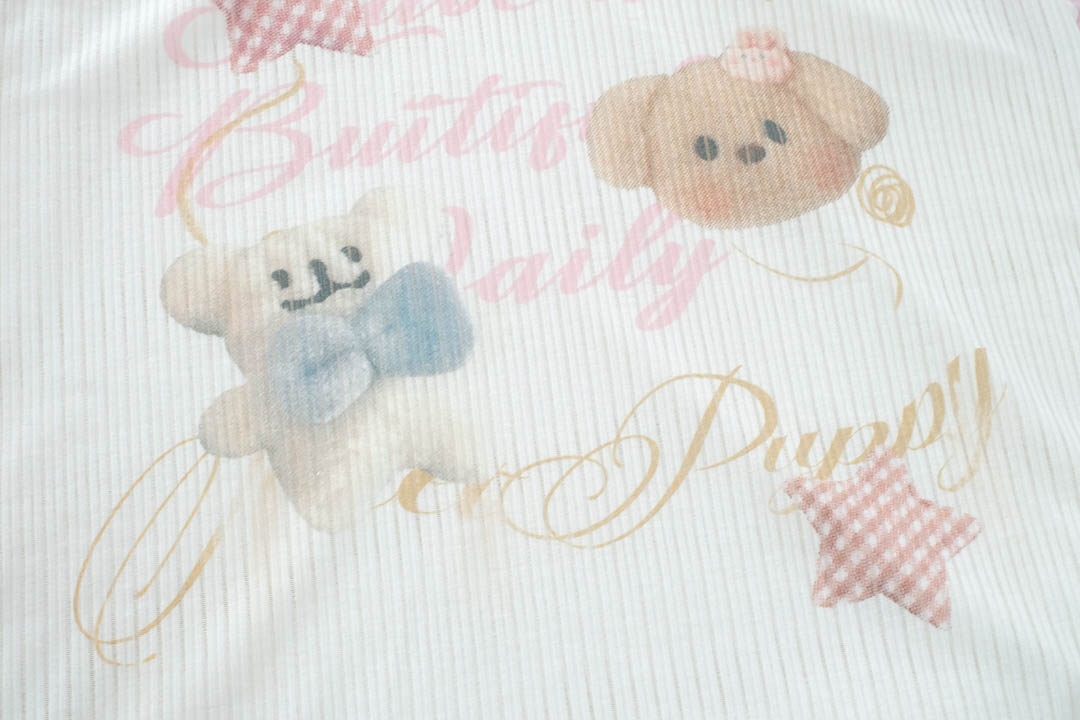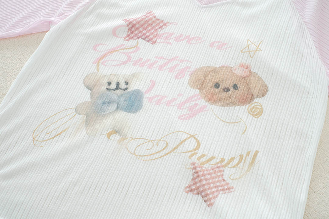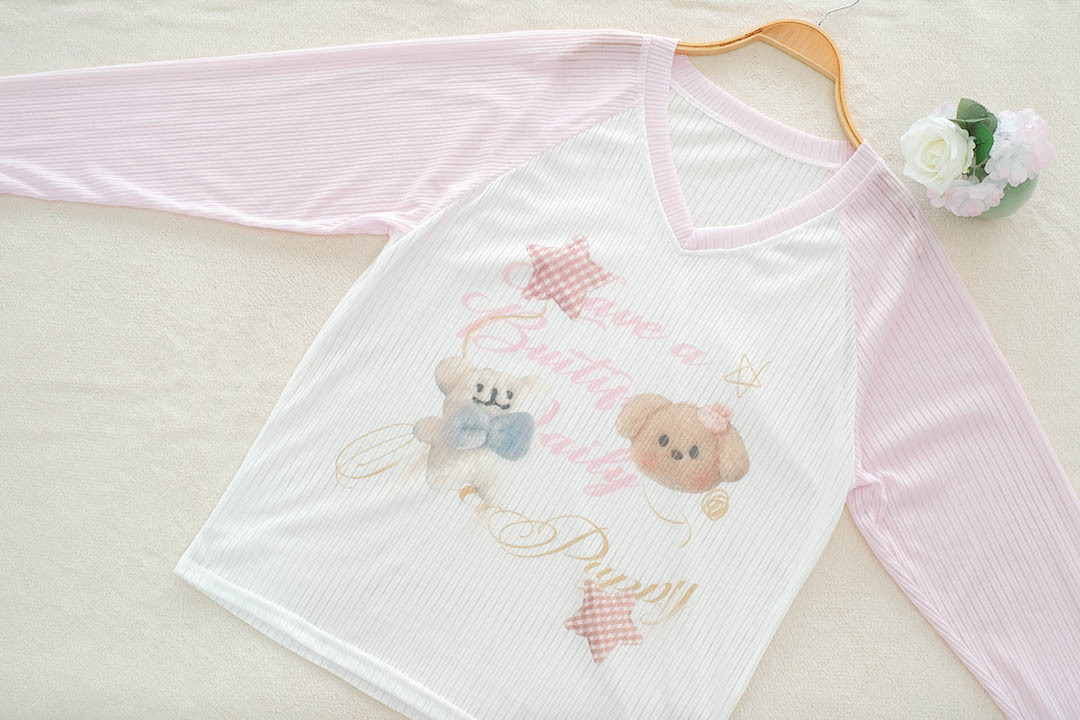 ตัวนี้คือน่ารักมากเสื้อ Raglan แขนยาวลายหมีสุดคิ้วท์ สีชมพู-ขาว สุดละมุนเนื้อผ้าใส่สบาย ระบายอากาศได้ดี ดีเทลคือใจละลาย มีลายพิมพ์น้องหมีน่ารักๆ พร้อมคำว่า "Have a buitty daily puppy" ดีไซน์คอวีเล็กๆ ไม่ดูตัน ส่วนตัวเสื้อเป็นริ้วๆ ทั้งตัว บอกเลยว่าใส่แล้วน่ารักขึ้น 300% จะใส่เป็นชุดลำลองอยู่บ้านก็ดูดี หรือจะใส่ไปเที่ยวก็ได้ลุคสบายๆ แต่ไม่ธรรมดา แมทช์กับกางเกงยีนส์หรือกางเกงขาสั้นก็เข้ากันสุดๆ ตัวนี้ต้องมี