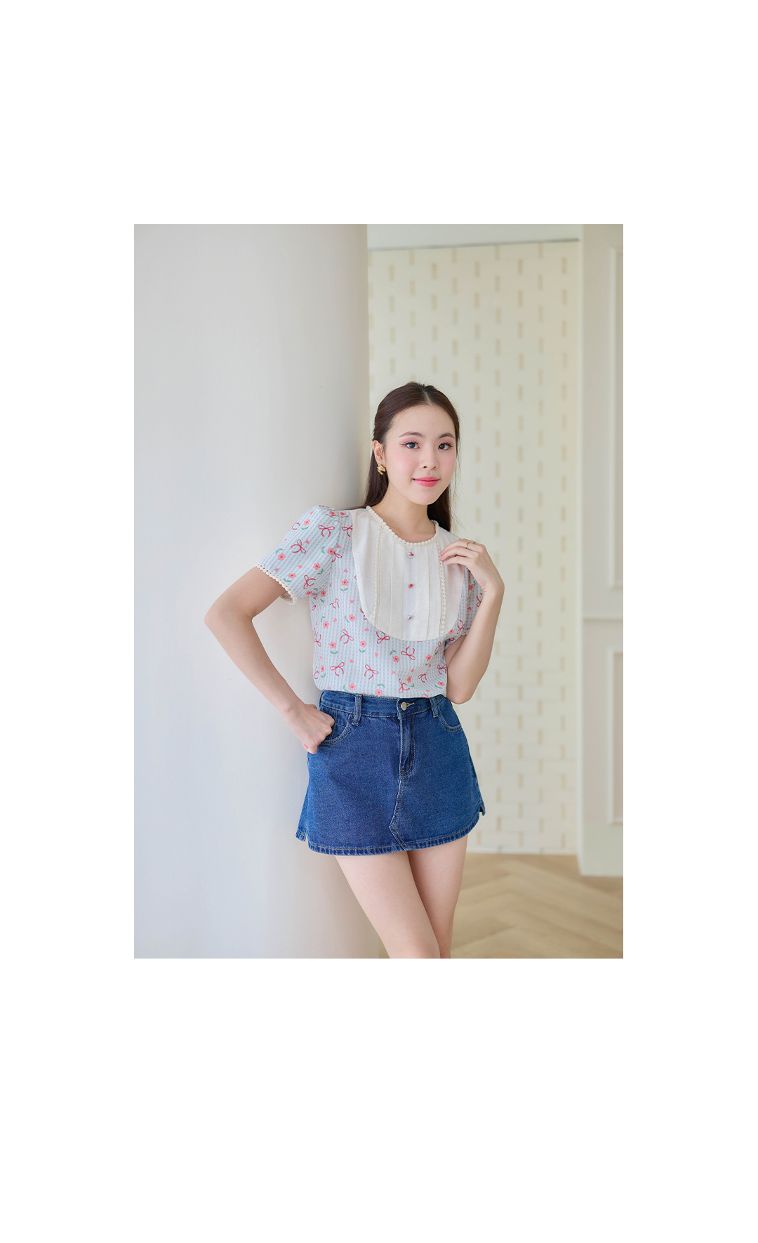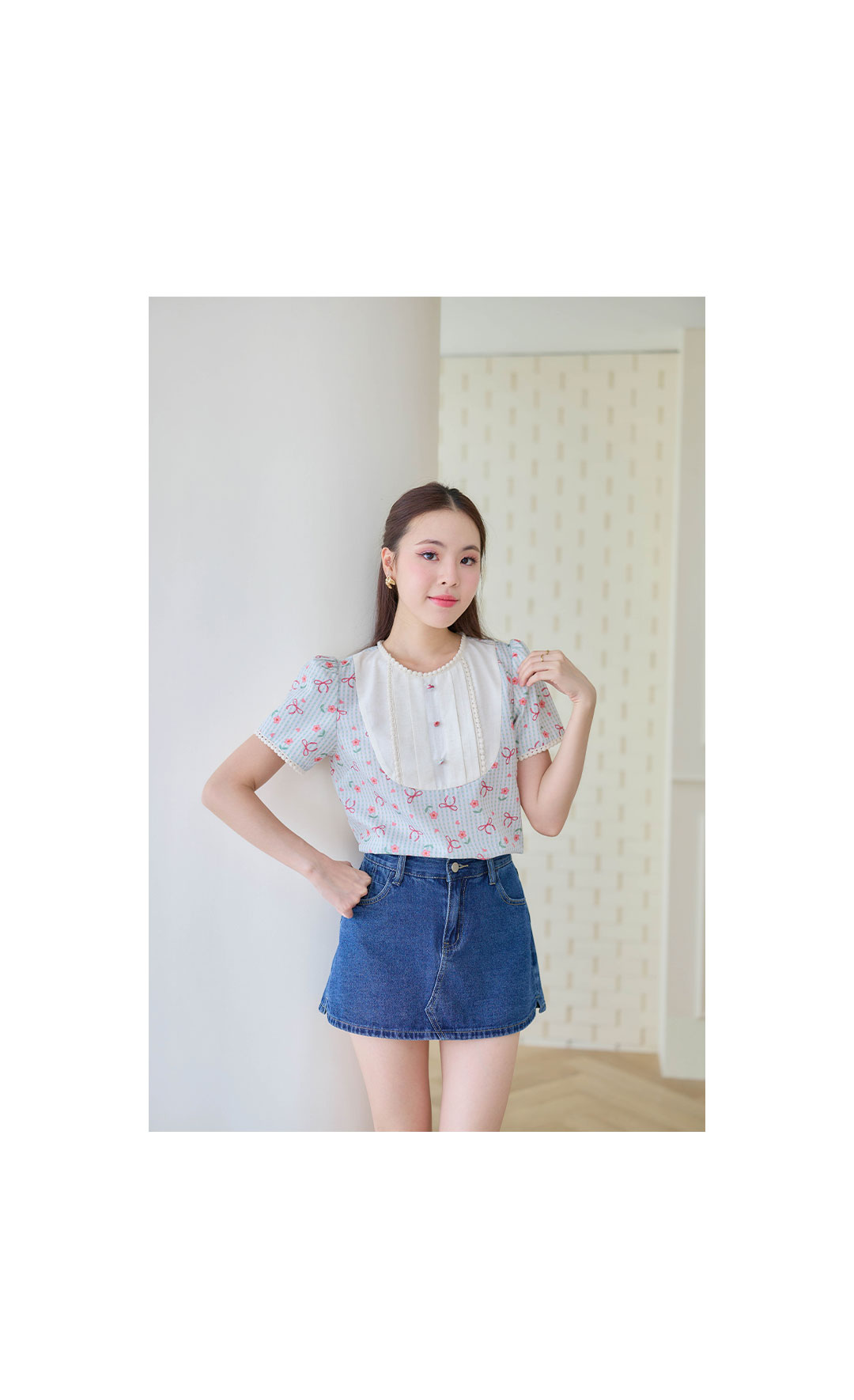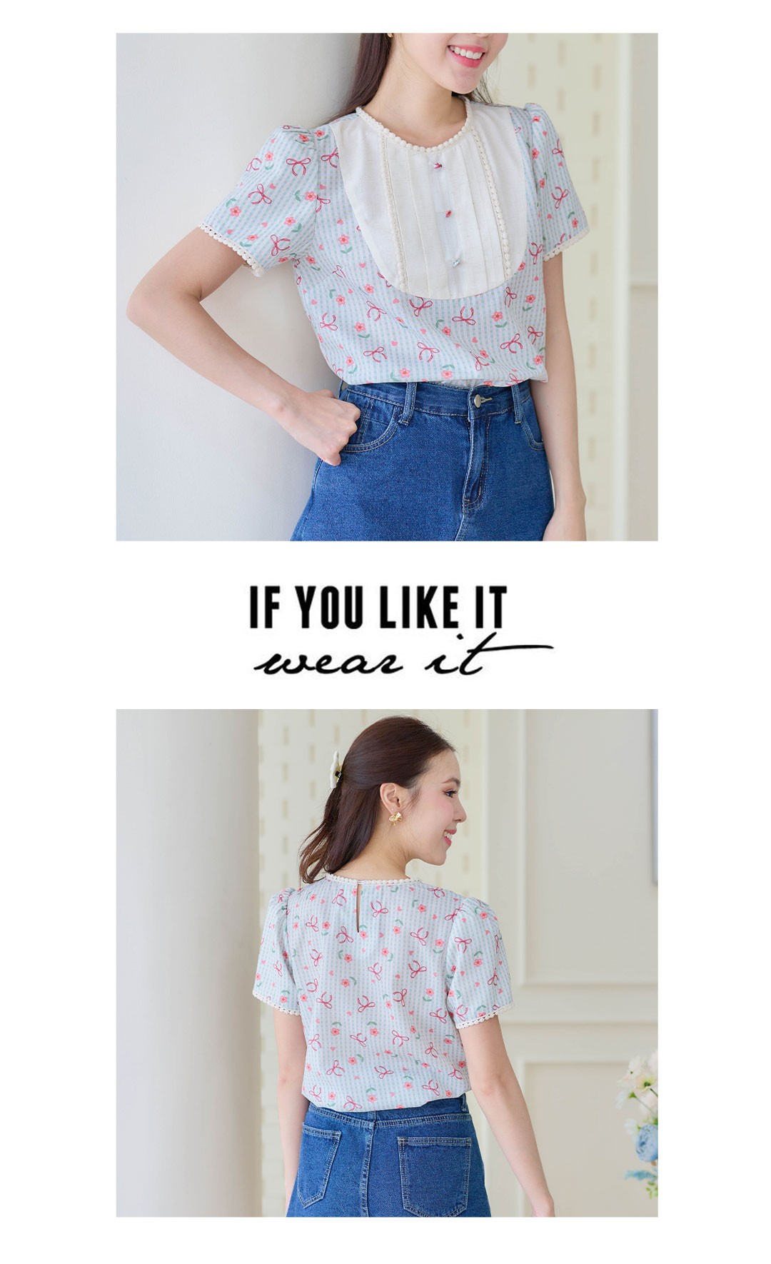 ไอเท็มสุดคิวท์ที่ต้องมีติดตู้! เสื้อแขนสั้นผ้า Cotton ลายตารางโทนสีเขียว ปรินท์ลายดอกไม้และโบว์สีชมพูน่ารักๆ มีซับในทั้งตัว เพิ่มความละมุนด้วยผ้าต่อสีครีมช่วงอก ดีไซน์ตีเกล็ด2ชั้นและแต่งกระดุมหลอกด้านหน้า เพิ่มดีเทลด้วยเทปลูกไม้เล็กๆช่วงอก ช่วงคอ และปลายแขน ลุคแบบคุณหนูน่าร้ากๆสดใส ใส่ Everydaylook ได้ แมตช์กับยีนส์ก็สวยหวานกำลังดี หรือจะจับคู่กับกระโปรงก็ยิ่งดูละมุน