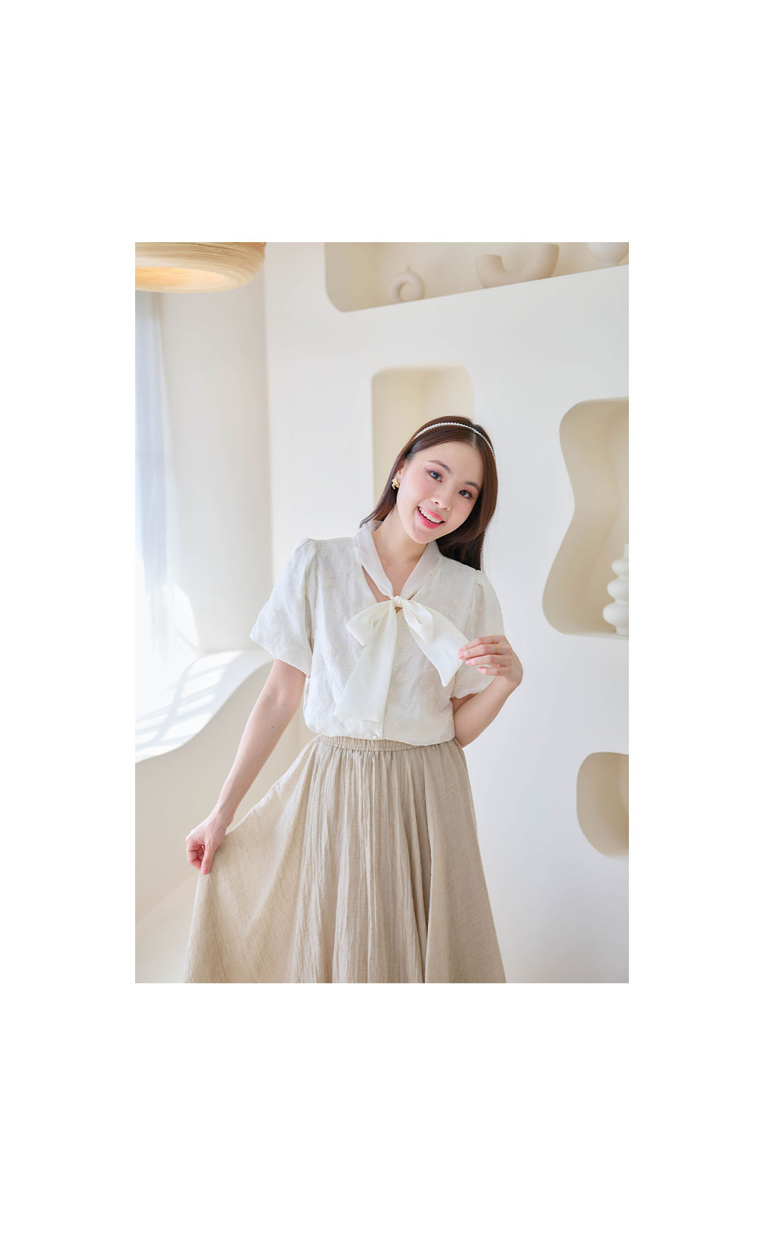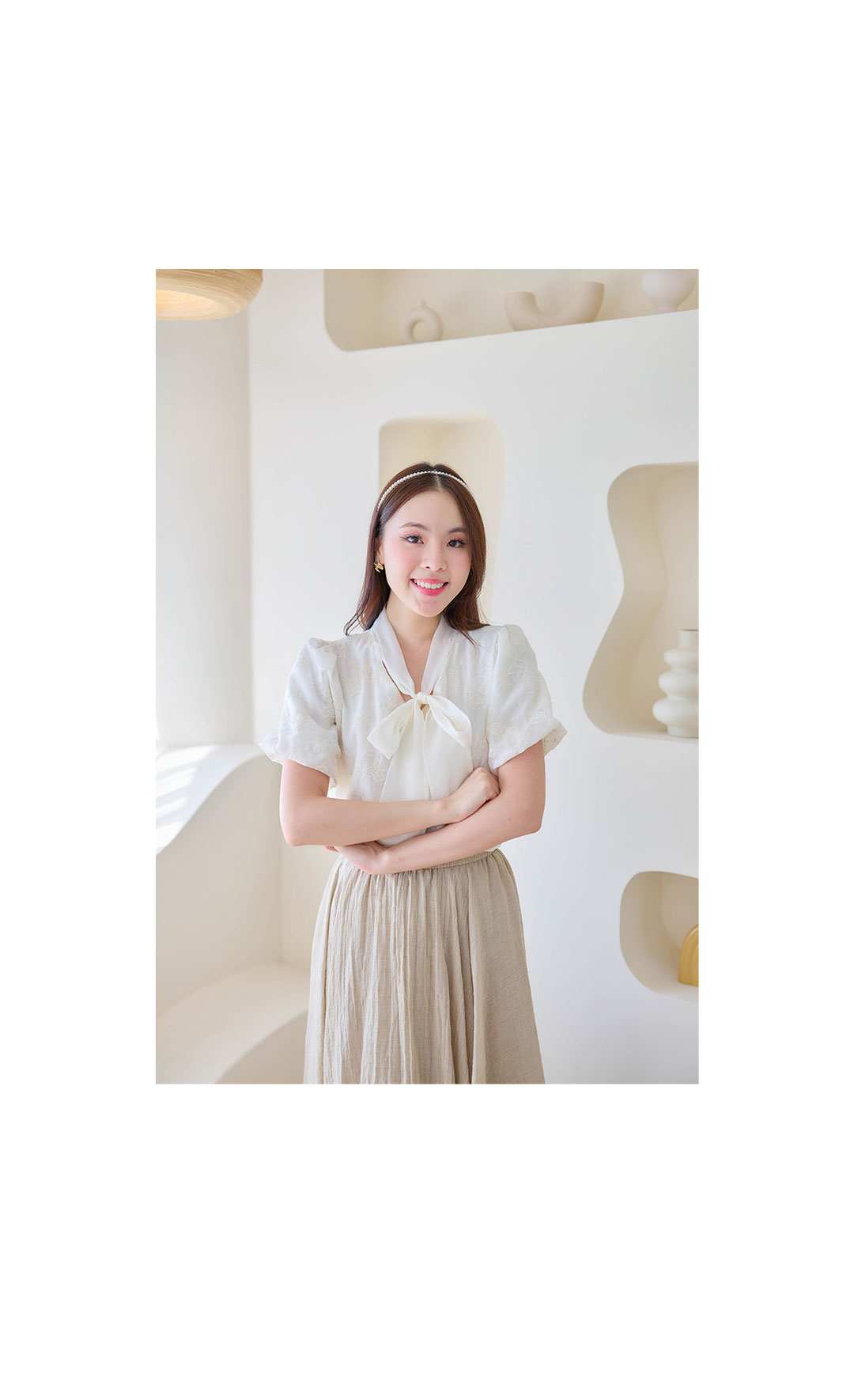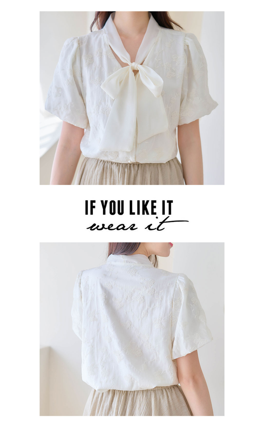 ลุคคุณหนูต้องรุ่นนี้ค่าา กับเสื้อทรงแขนบอลลูน เนื้อผ้า Tencel ปักลายดอกไม้และผีเสื้อ สีขาวครีมสุดละมุน แต่งโบว์ผูกช่วงคอ และกระดุมมุกเรียงด้านหน้า แขนบอลลูนพองนิดๆ ให้ลุคหรูหราเรียบร้อยละมุนในเวลาเดียวกัน แมทช์กับกางเกง/กระโปรง ใส่ทำงานหรือไปเที่ยวก็สวยหรู เอฟไปไม่ผิดหวังค่าา