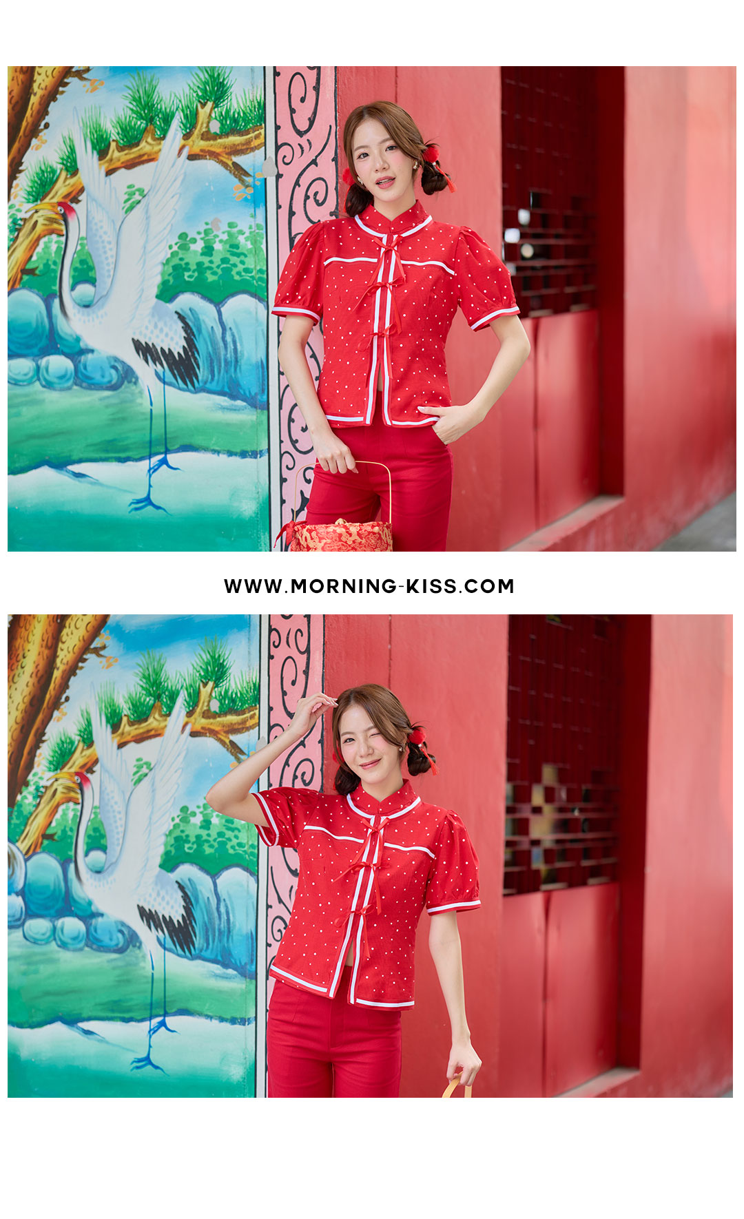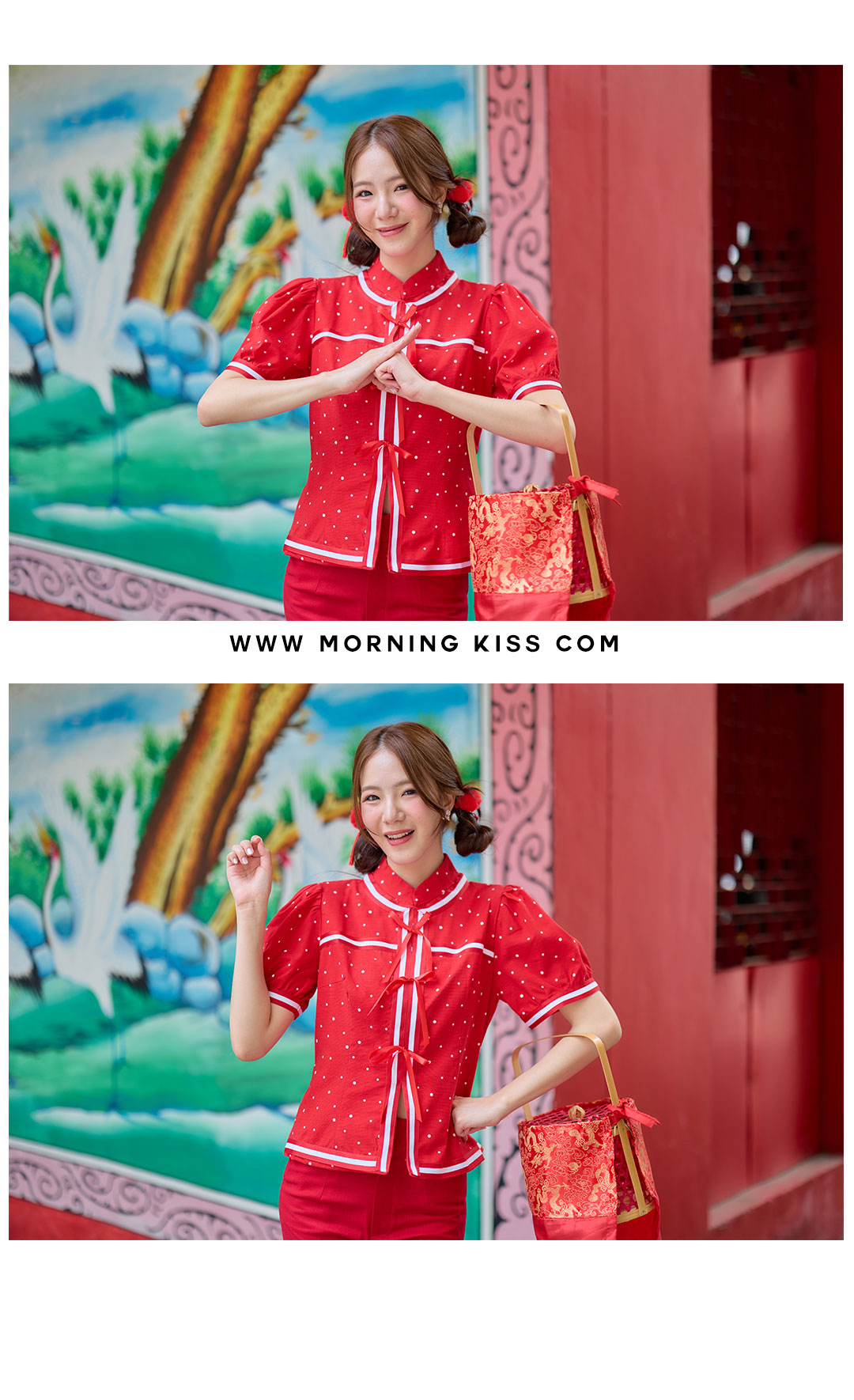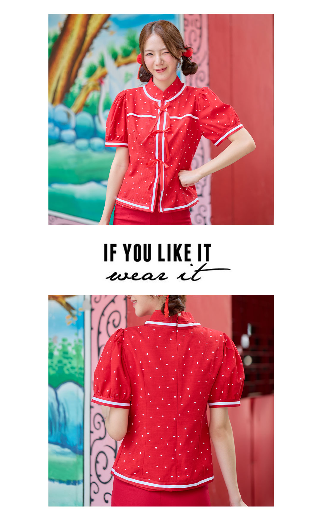 ไอเท็มนี้ ห้ามพลาดเลย เสื้อแขยสั้นโทนสีแดงจุดขาวเล็กๆรอบตัว แต่งขอบตัวเสื้อด้วยริ้วแดงสลับขาว รุ่นนี้ให้อารมณ์จีนๆแบบใส่ลำรอง แต่งโบว์แดงเรียงหน้า มีซับใน เนื้อผ้าดี เป็นโทนใส่ง่ายๆใส่เที่ยวใส่ตรุษจีนนี้หรือเก็บไว้ใส่ทำงานก็ได้ มีติดตู้ไว้ไม่ผิดหวังแน่นอน