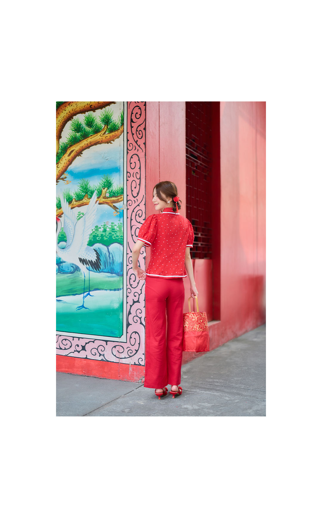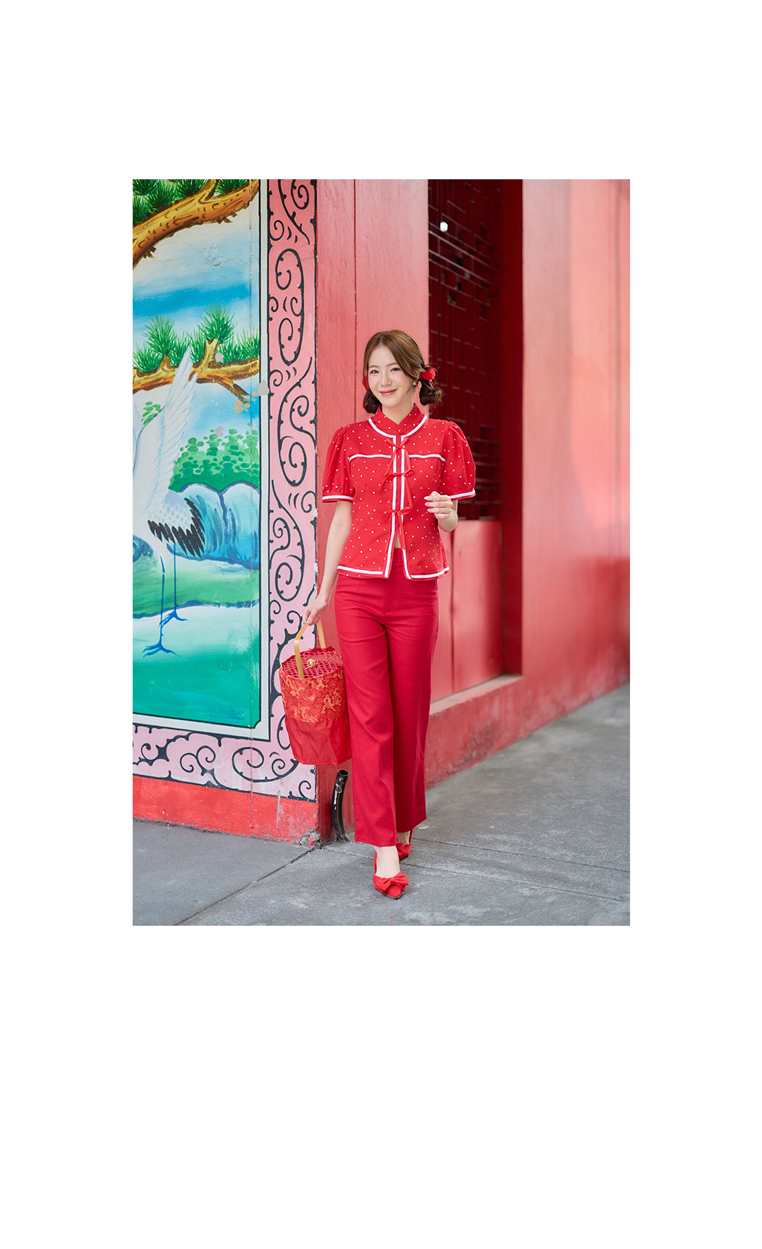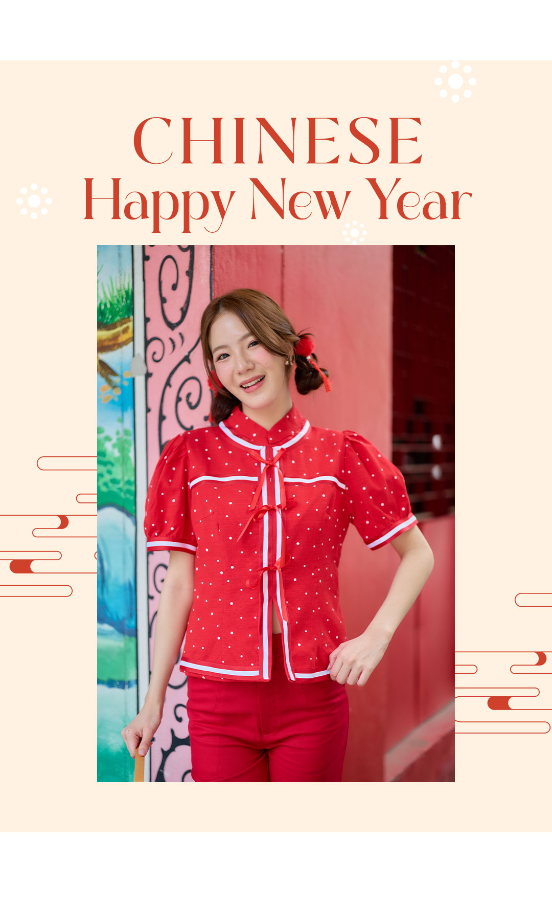 ไอเท็มนี้ ห้ามพลาดเลย เสื้อแขยสั้นโทนสีแดงจุดขาวเล็กๆรอบตัว แต่งขอบตัวเสื้อด้วยริ้วแดงสลับขาว รุ่นนี้ให้อารมณ์จีนๆแบบใส่ลำรอง แต่งโบว์แดงเรียงหน้า มีซับใน เนื้อผ้าดี เป็นโทนใส่ง่ายๆใส่เที่ยวใส่ตรุษจีนนี้หรือเก็บไว้ใส่ทำงานก็ได้ มีติดตู้ไว้ไม่ผิดหวังแน่นอน