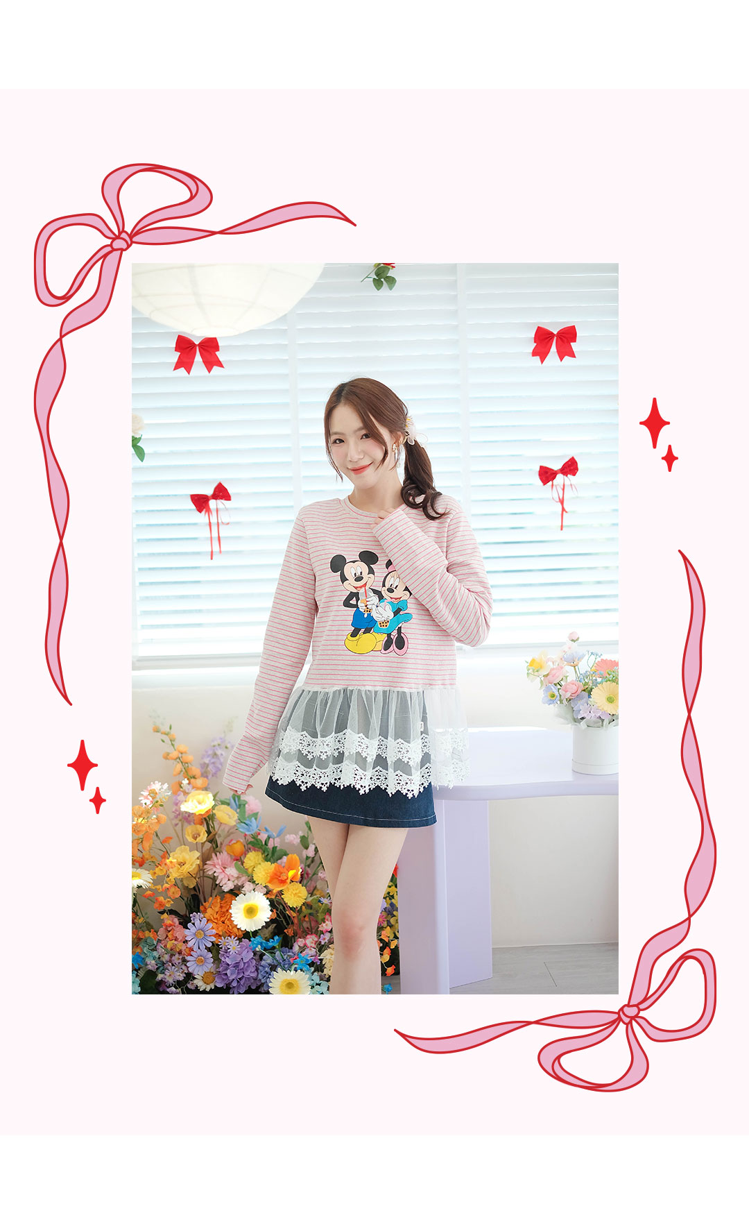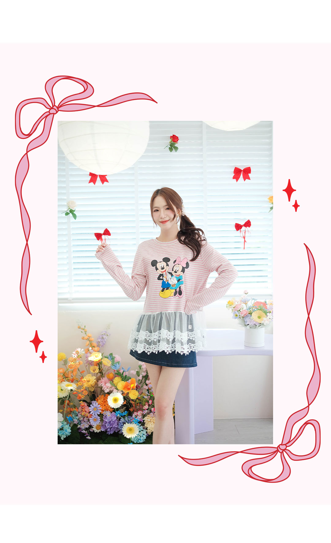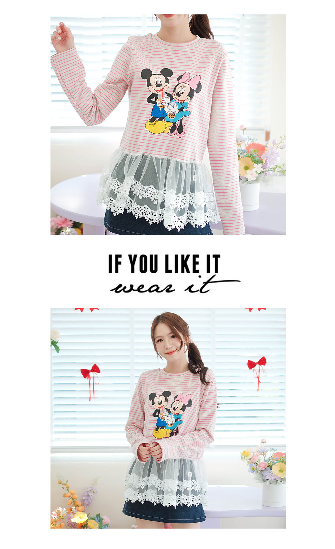 ลุคเท่ๆ ปนน่ารัก กับเสื้อแขนยาว สีครีมริ้วชมพู ด้านหน้าสกรีนลายการ์ตูนน่ารักๆ เนื้อผ้า Cotton เนื้อนิ่มๆ ยืดได้เยอะ เพิ่มดีเทลด้วยการต่อชายด้วยผ้าลูกไม้สีขาวเนื้อนิ่มๆ รุ่นนี้ใส่ง่ายๆ จัดไปใส่เที่ยวหรือใส่อยู่บ้านชิวๆกันได้เลย