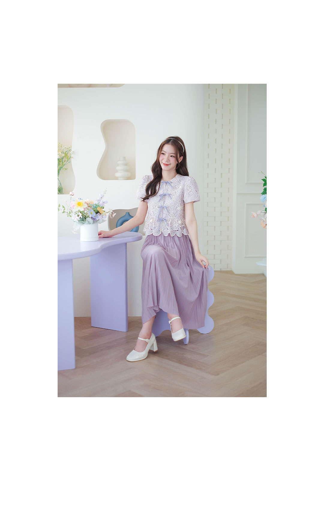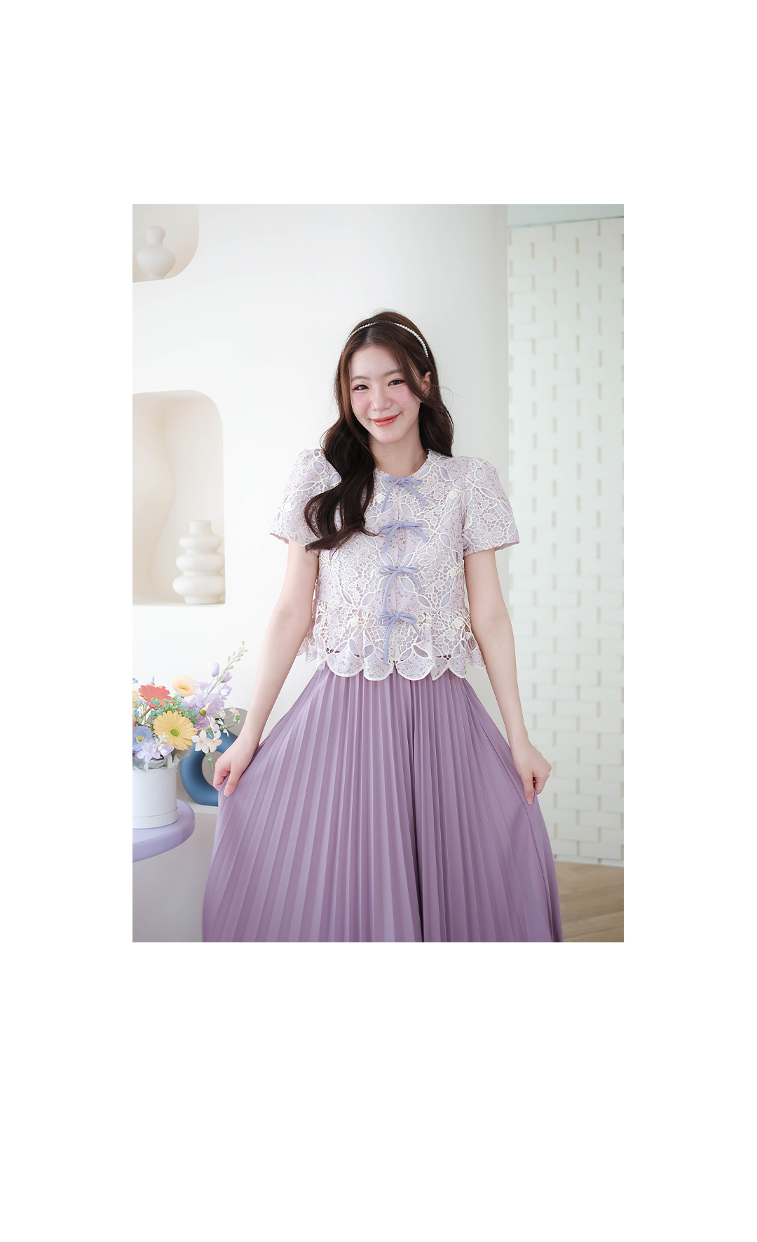 สวยปังไม่ไหว ห้ามพลาดเลย รุ่นนี้บอกเลยว่าสวยมาก เต็ม 10 ไม่มีหักกับเสื้อผ้า Cotton ฉลุลายลูกไม้ ดีไซน์เป็นโบว์ผูกเรียงด้านหน้า มีกระดุมซ่อนสาปเสื้อด้านใน ซับในทั้งตัว ชายระบายเป็นแบบชายเชิงตัดสามลูกไม้อย่างสวยเลย ลุคคุณหนูหวานๆ แมทกับขาสั้นหรือขายาว ดูสวยแพง ใส่ทำงานก็ได้ใส่เที่ยวก็น่ารัก รุ่นนี้จัดไปไม่ผิดหวังจริงๆ