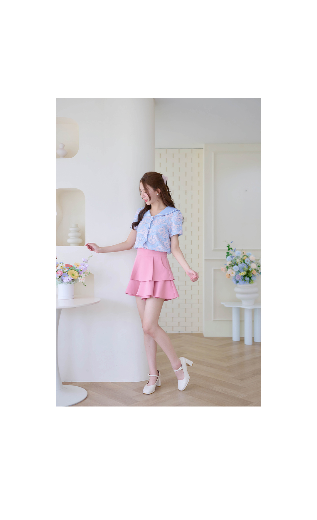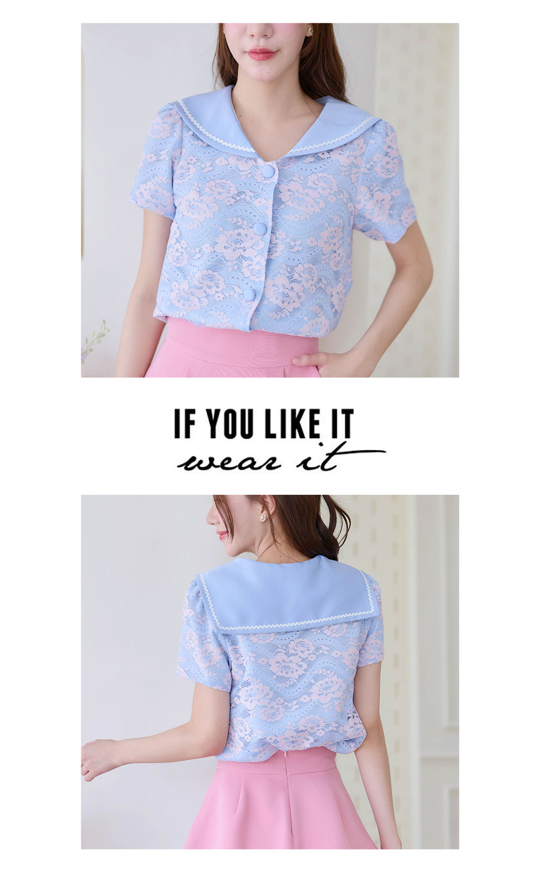 สวยหวานน่ารักมากๆ กับเสื้อแขนสั้นงานผ้าลูกไม้เนื้อนิ่มโทนสีชมพู/ฟ้า ช่วงคอปกทหารเรือแต่งงานปักหยักๆสีขาว กระดุมเรียงหน้า ใส่ซับในสีฟ้าทั้งตัว ทำให้ลายผ้าสวยหวานโดดเด่น ใส่แล้วน่ารักสุดๆ แมทกับขาสั้นหรือขายาว ดูสวยแพง ใส่ทำงานก็ได้ใส่เที่ยวก็น่ารัก รายการนี้แนะนำเลย
