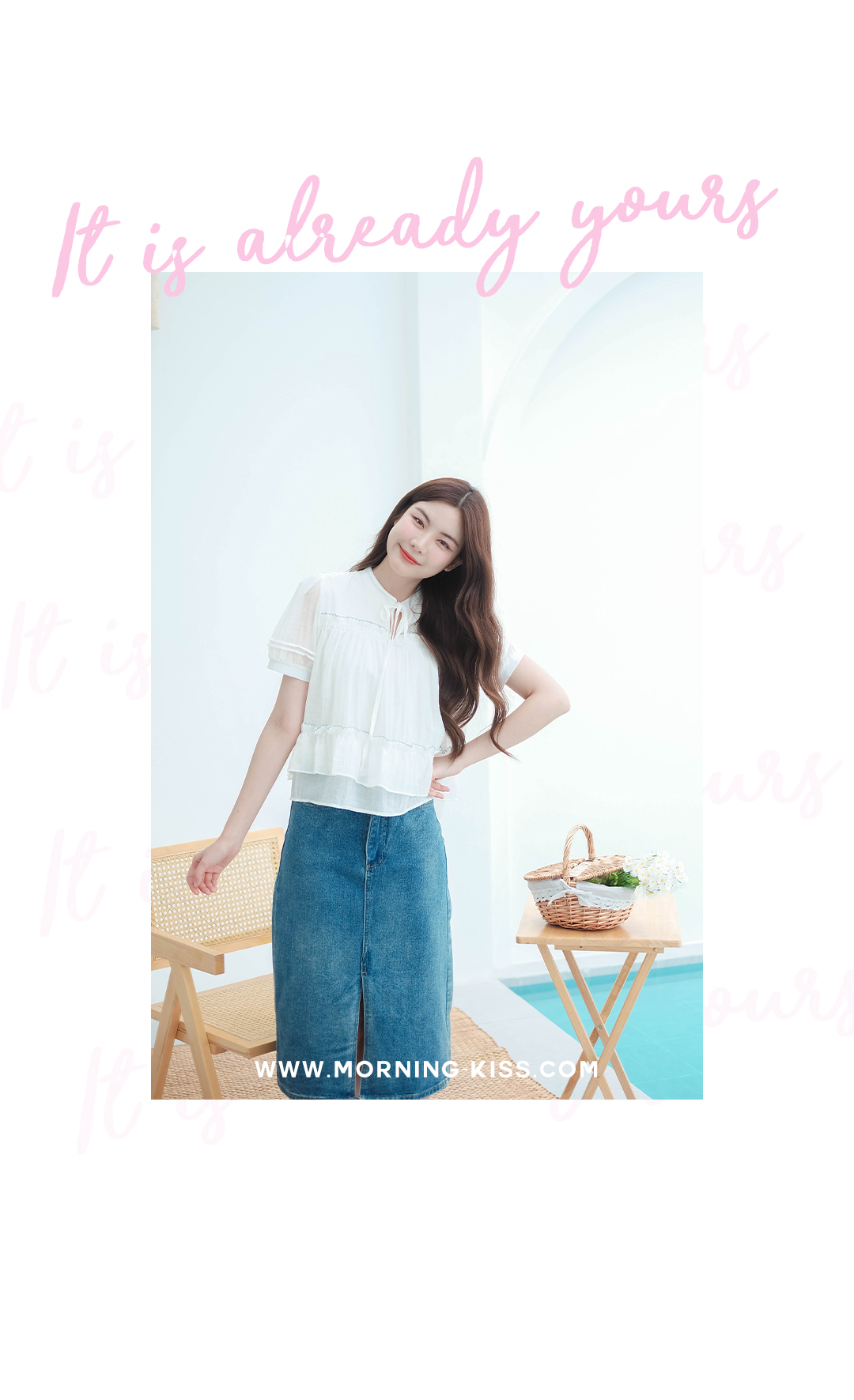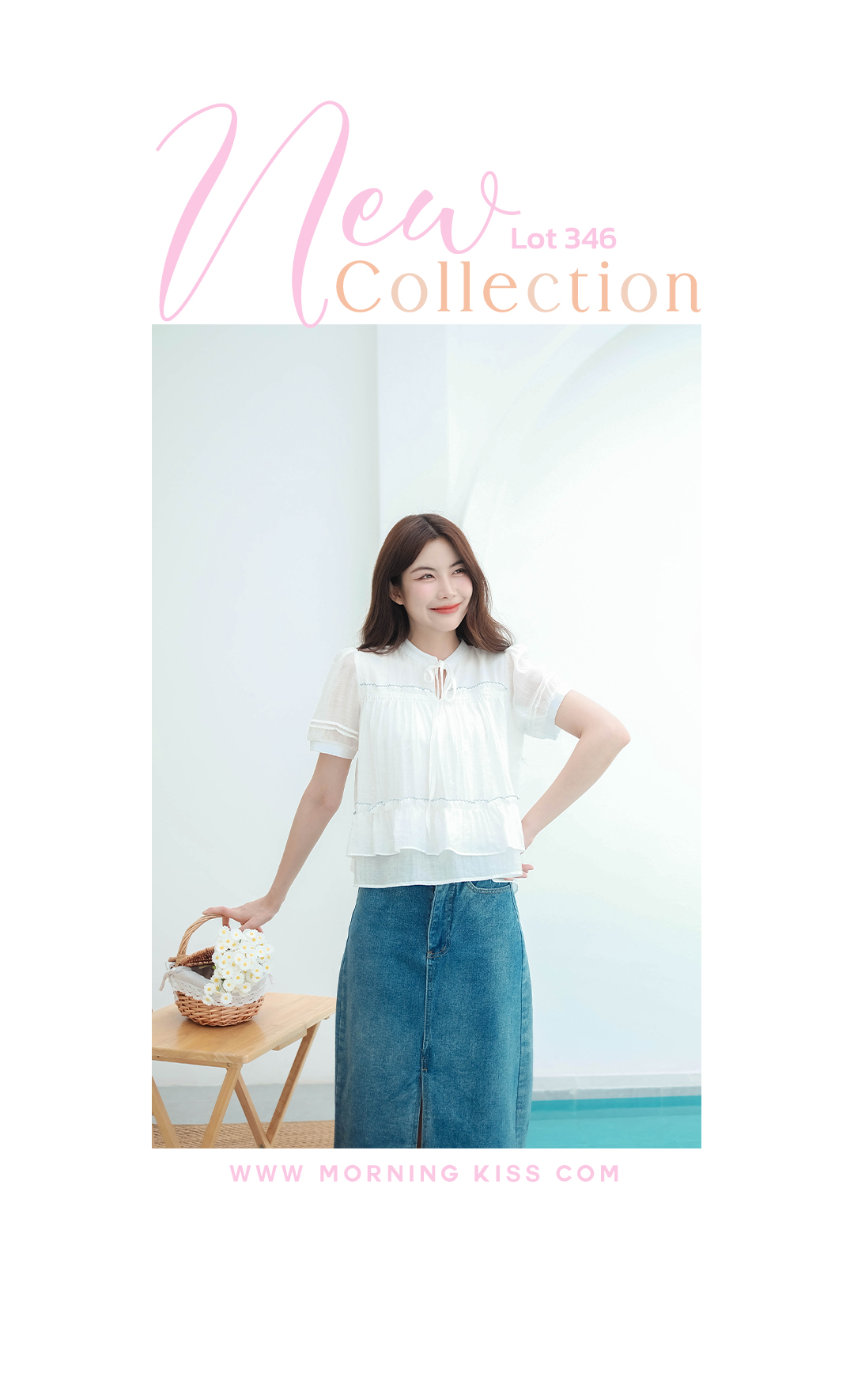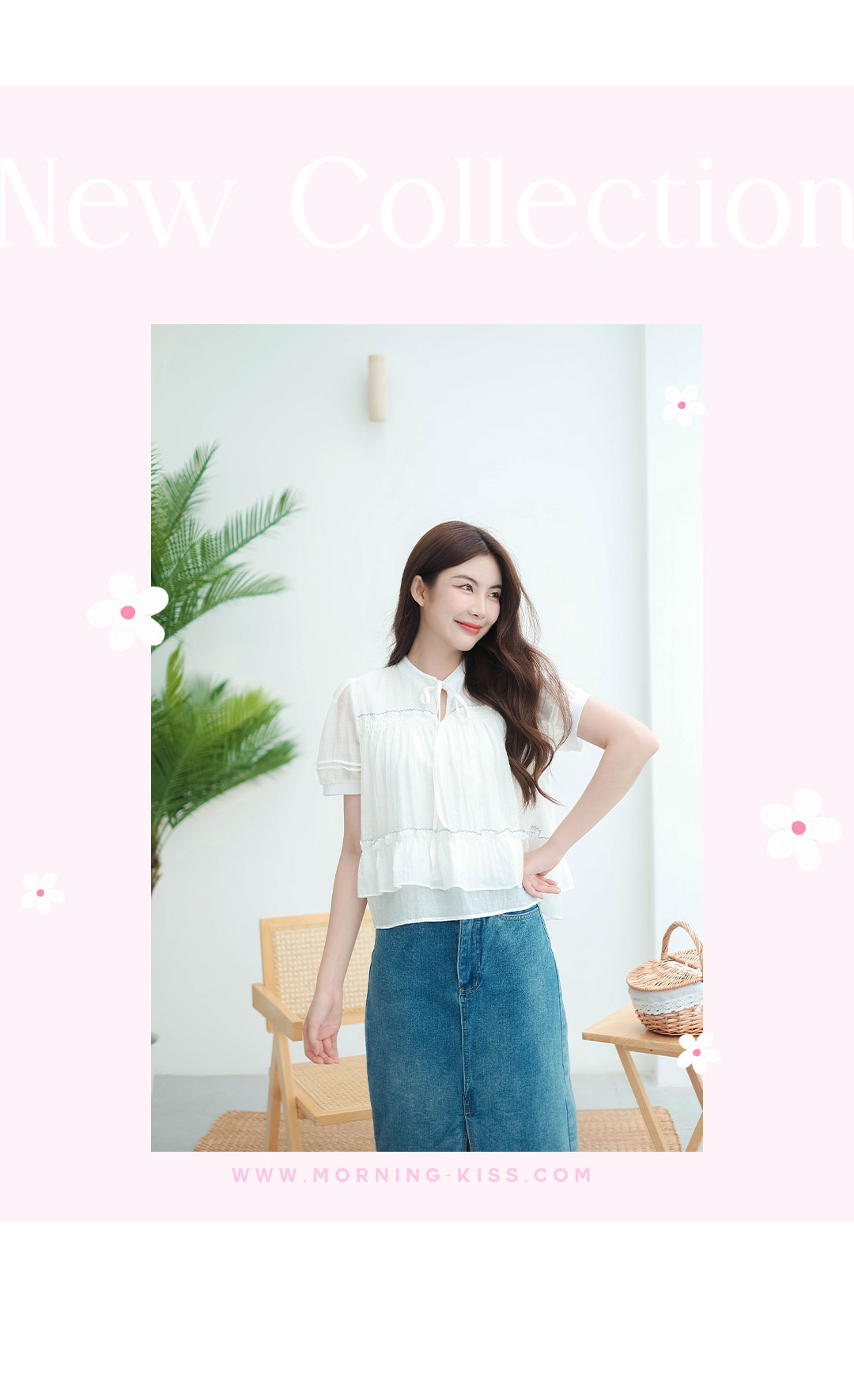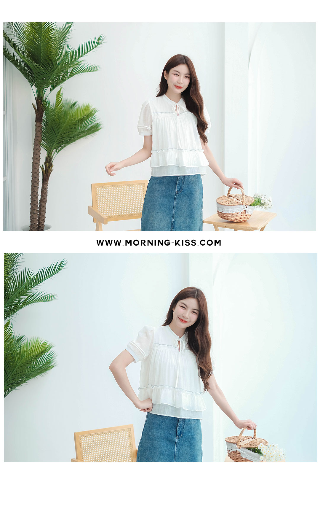 ไอเท็มนี้แนะนำสาวๆเลย สวยหวานมากจริงๆกับเสื้อแขนสั้นโทนสีขาว ช่วงคอมีสายผูกเป็นโบว์น่ารักๆ หน้าอกและชายเสื้อทำระบายเล็กๆกุ๊นด้วยสีฟ้าทำหยักๆ ช่วงแขนทำพองๆนิดๆ ชายทำระบาย 2 ชั้น มีซับในช่วงตัว ดีเทลน่ารัก ใส่ทำงานก็ได้ใส่เที่ยวก็น่ารัก รุ่นนี้จัดไปไม่ผิดหวังจริงๆ
