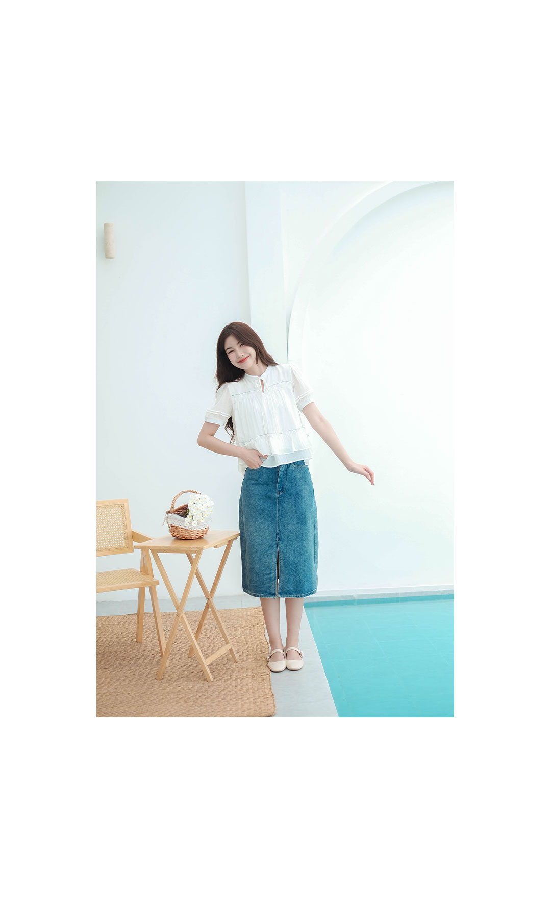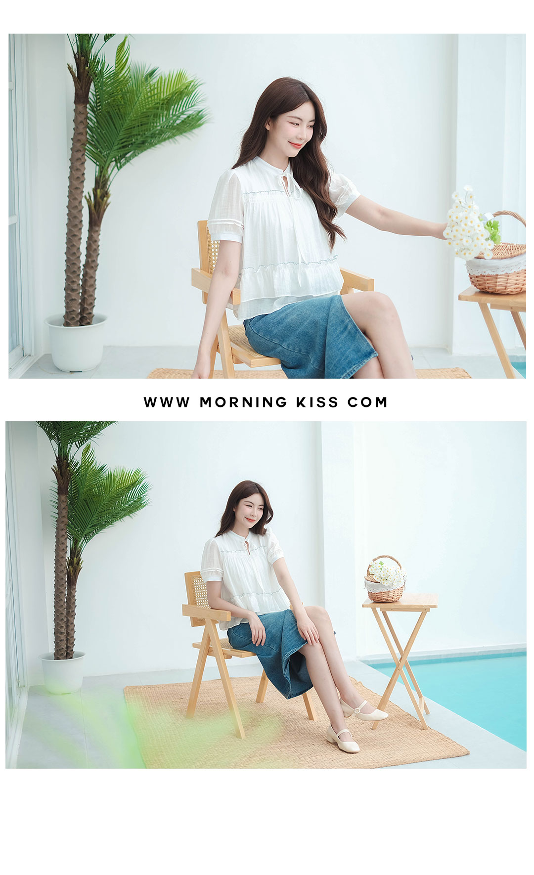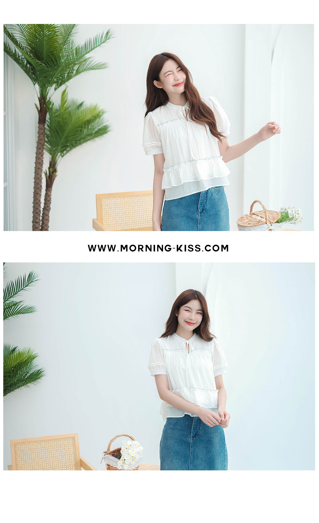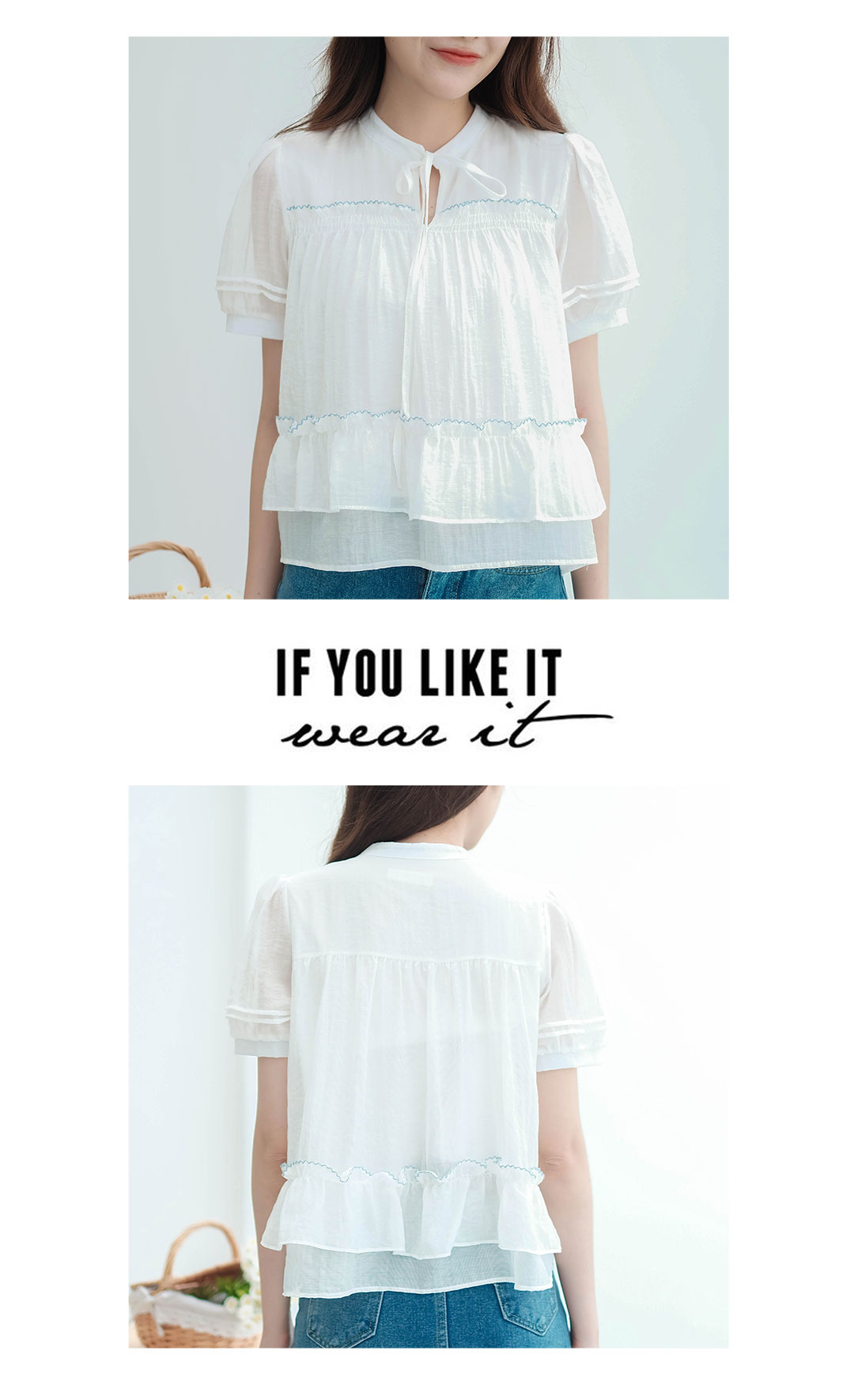 ไอเท็มนี้แนะนำสาวๆเลย สวยหวานมากจริงๆกับเสื้อแขนสั้นโทนสีขาว ช่วงคอมีสายผูกเป็นโบว์น่ารักๆ หน้าอกและชายเสื้อทำระบายเล็กๆกุ๊นด้วยสีฟ้าทำหยักๆ ช่วงแขนทำพองๆนิดๆ ชายทำระบาย 2 ชั้น มีซับในช่วงตัว ดีเทลน่ารัก ใส่ทำงานก็ได้ใส่เที่ยวก็น่ารัก รุ่นนี้จัดไปไม่ผิดหวังจริงๆ