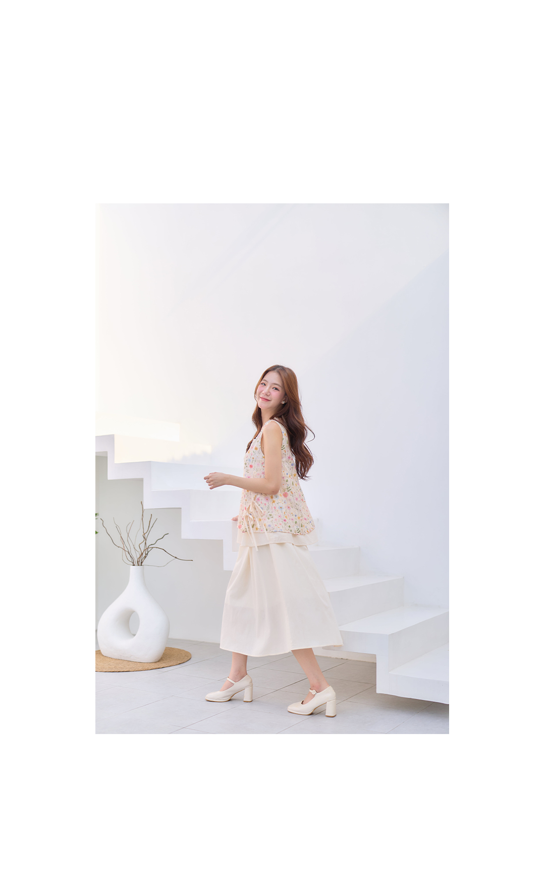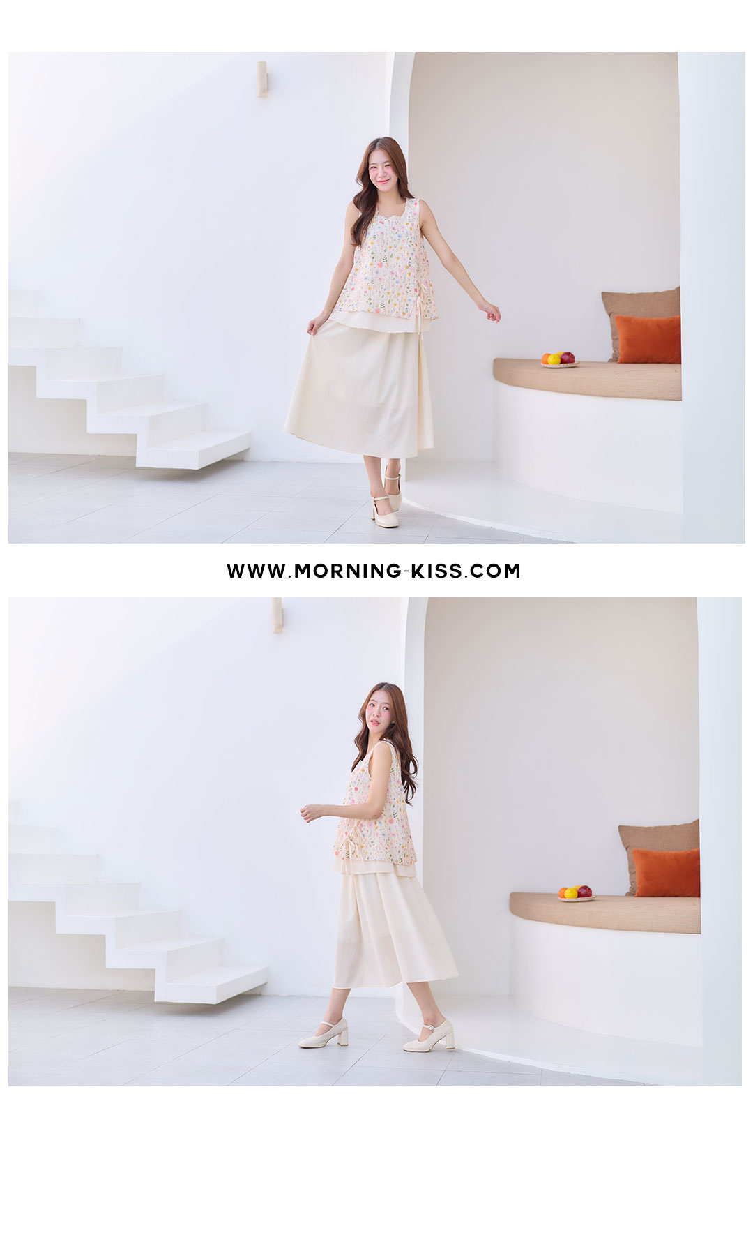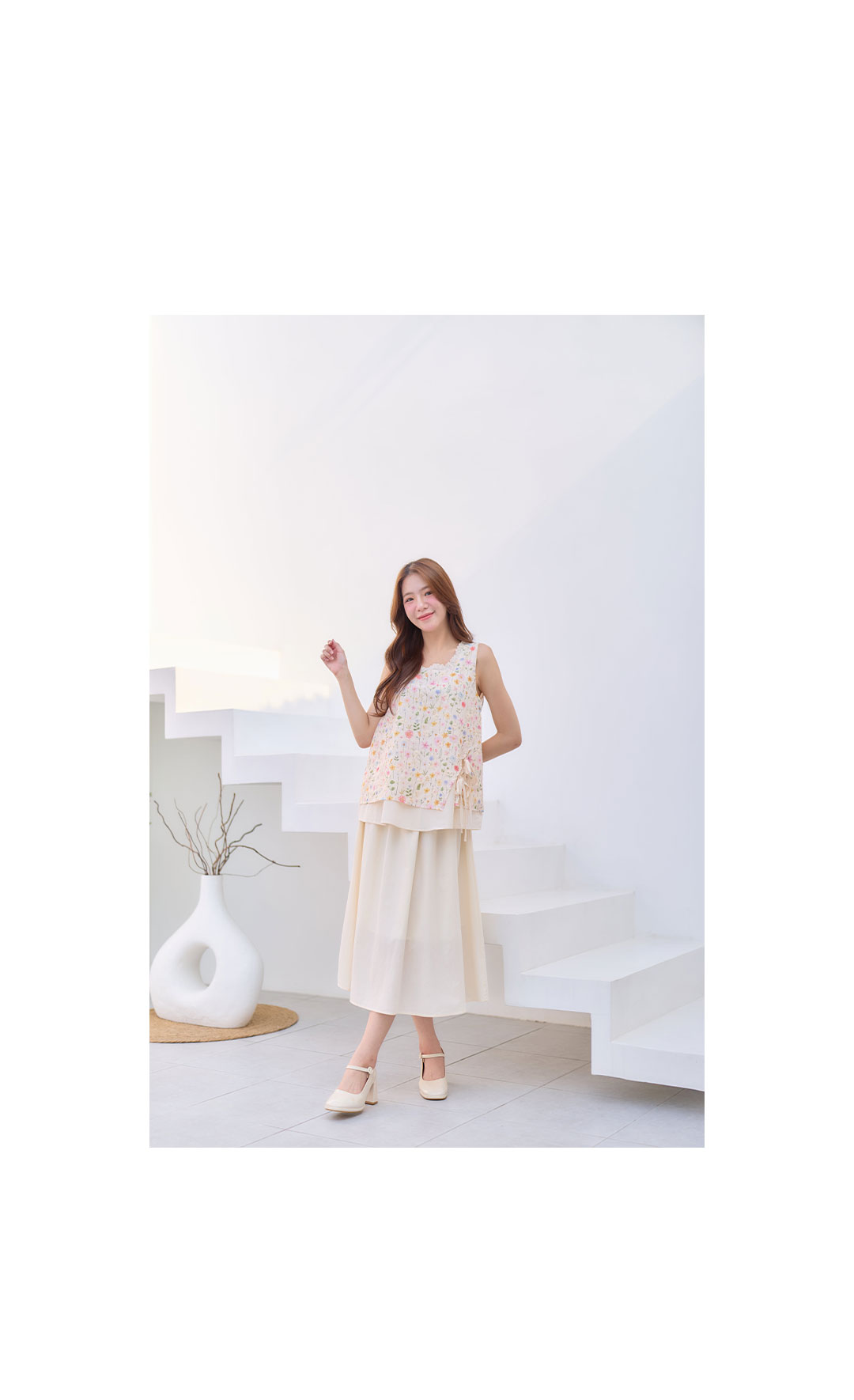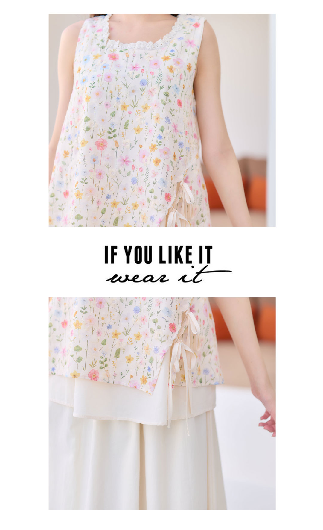 มาเพิ่มวันสดใสกับลุคหวานๆน่ารักๆ มาแพ็คคู่ เสื้อ+กระโปรง ใส่เข้าเซ็ทกันน่ารักมาก เสื้อแขนกุดสีครีมผ้า Cotton ฉลุลายลูกไม้งานพิมพ์ลายดอกไม้สีหวานๆ กุ๊นขอบคอด้วยผ้าฉลุลายลูกไม้เล็กๆ ชายเสื้อผ้าชขึ้นเล็กน้อยมีสายคู่ผูกเป็นโบว์น่ารักๆ ซับในทั้งตัว ตัวกระโปรงยาวสีครีมช่วงเอวเป็นยางยืด มีซับใน ใส่แยกชุดหรือใส่คู่เป้นเซ็ทก้น่ารัก งานดี ราคาคุ้มสุดๆ
