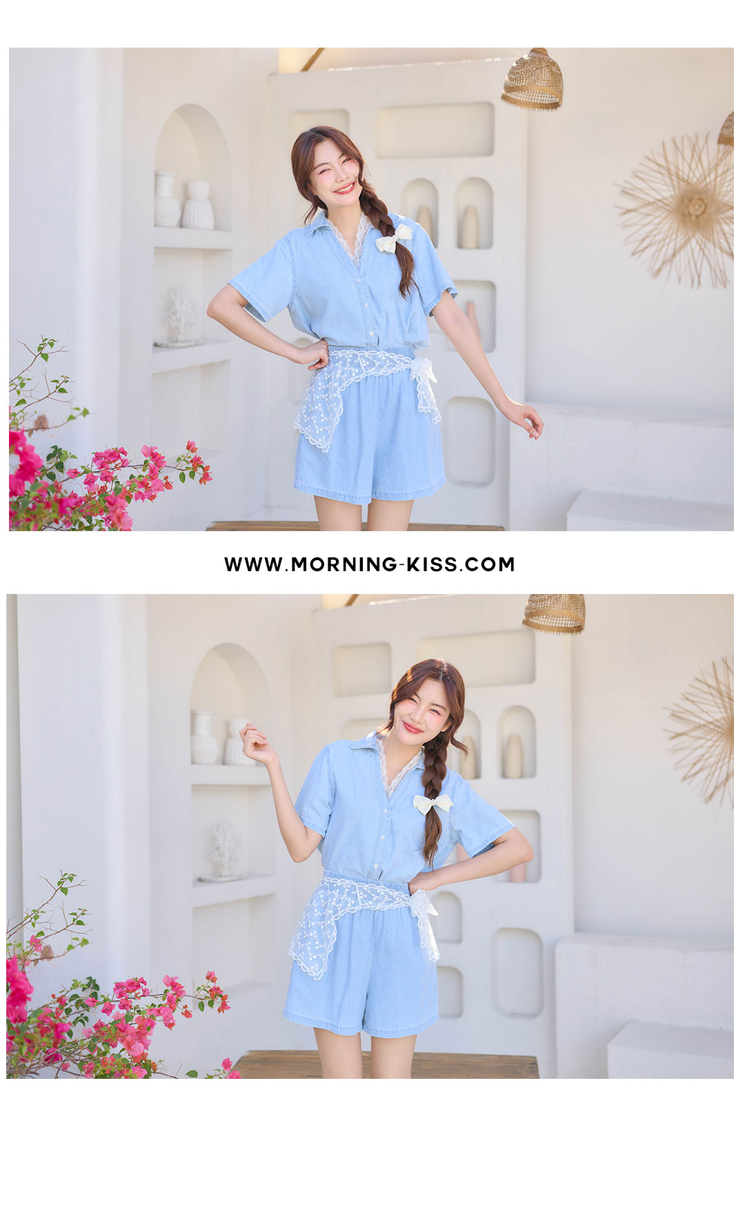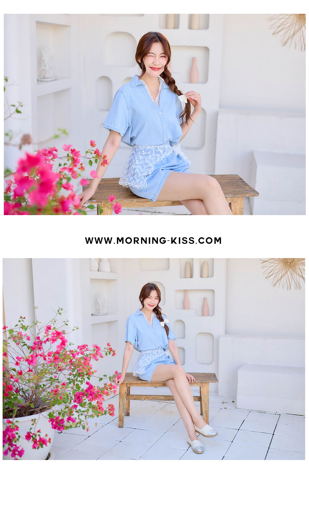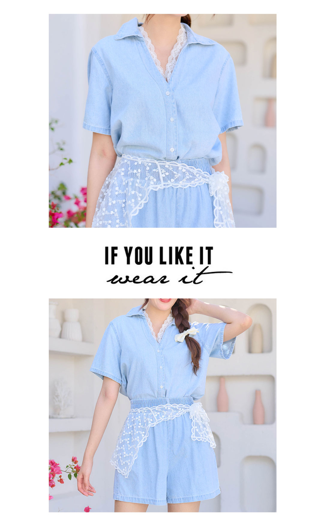 Recommend แบบเท่ๆหวานๆ น่ารักสุดๆ ไม่อยากให้พลาดเลยค่า ชุดเซท(เสื้อ+กางเกง) เสื้อแขนสั้นคอปกช่วงคอแต่งผ้าลูกไม้สีขาวน่ารักๆ กระดุมหน้า ใส่เข้าเซทกับกางเกงยีนส์ช่วงเอวเป็นยางยืด มีกระเป๋าจริง 2 ข้างซ้าย/ขวา มีผ้าคาดเอวเป็นผ้าลูกไม้เข้าเซทให้ด้วยนะคะ (ถอดออกได้) สามารถใส่แยกชิ้นกันได้ สวยคุ้มในชุดเดียว