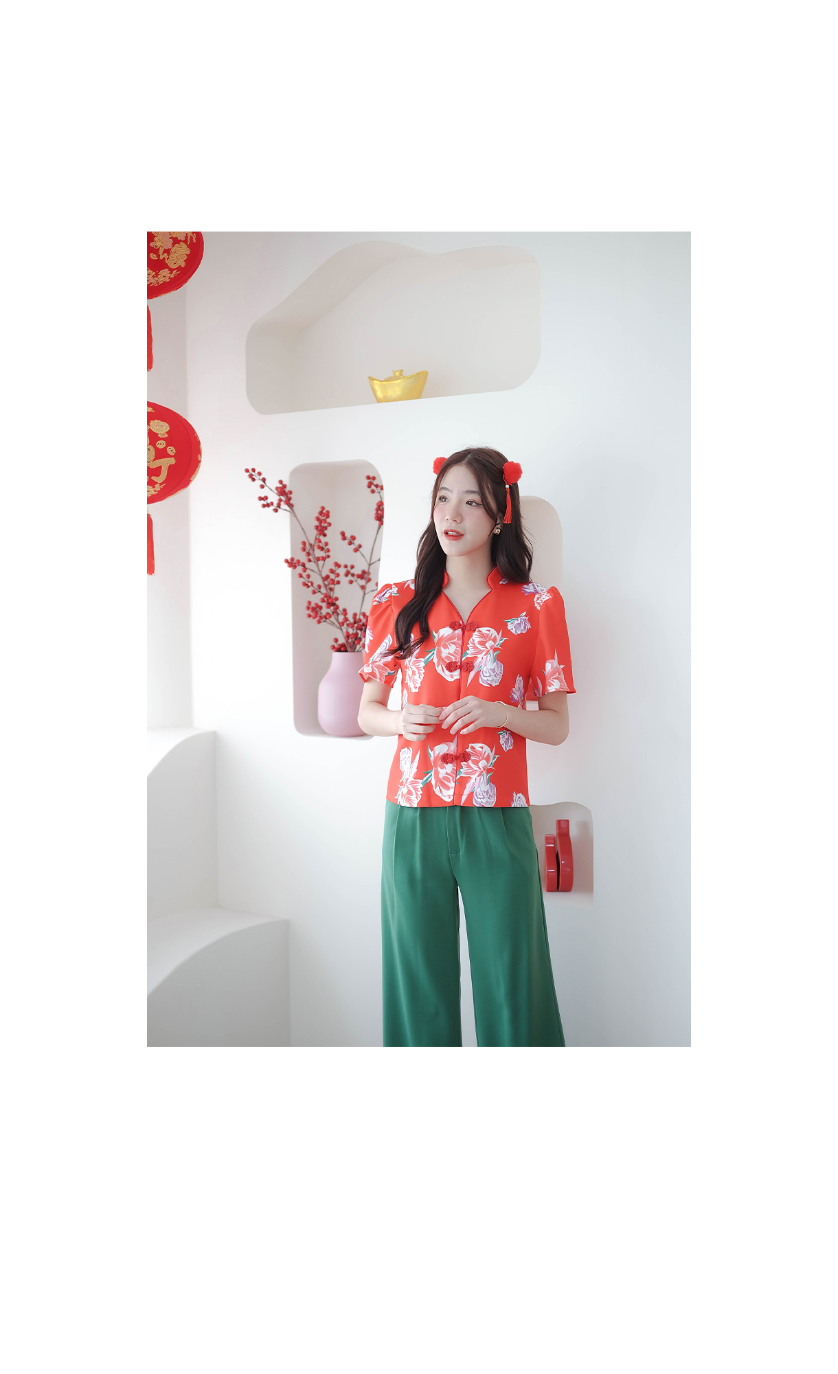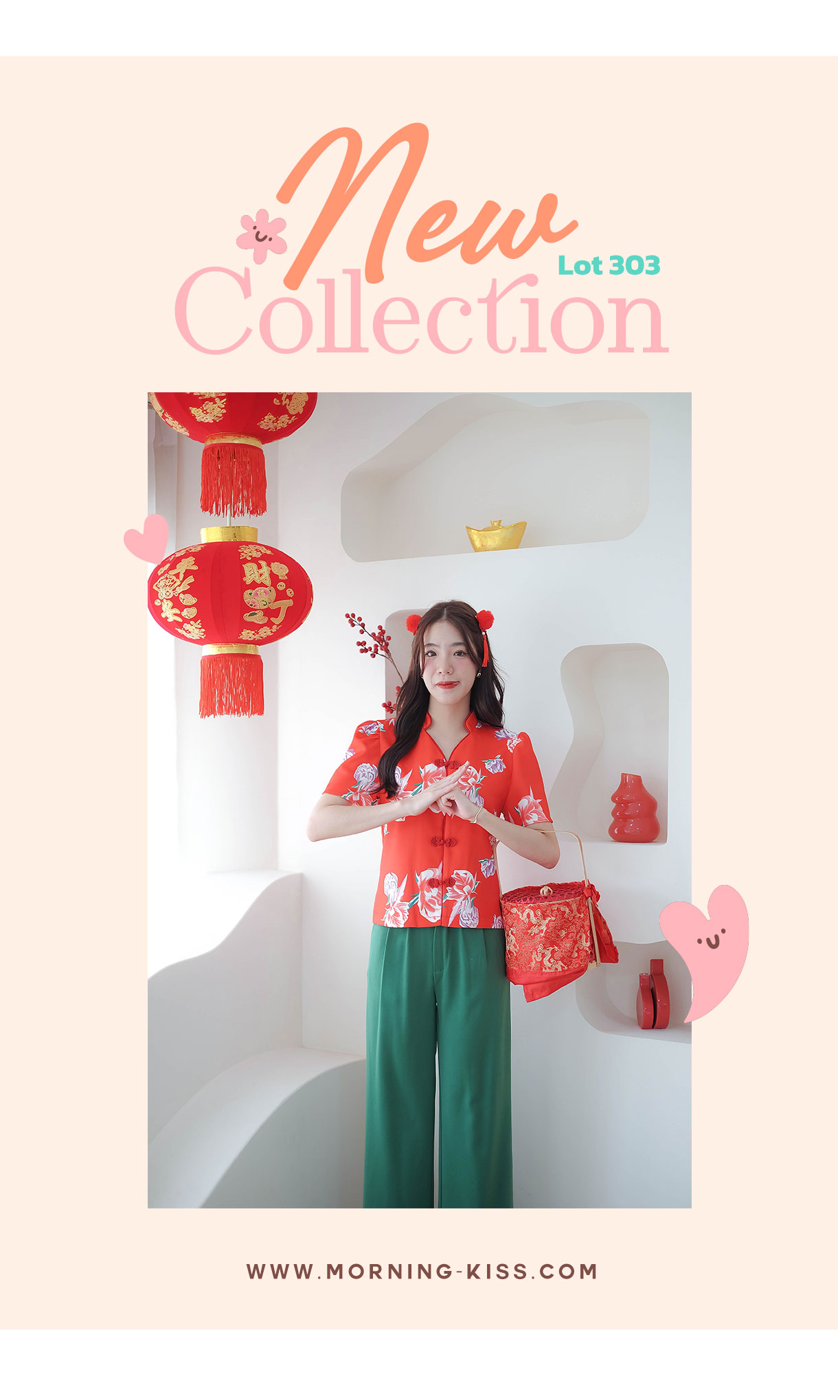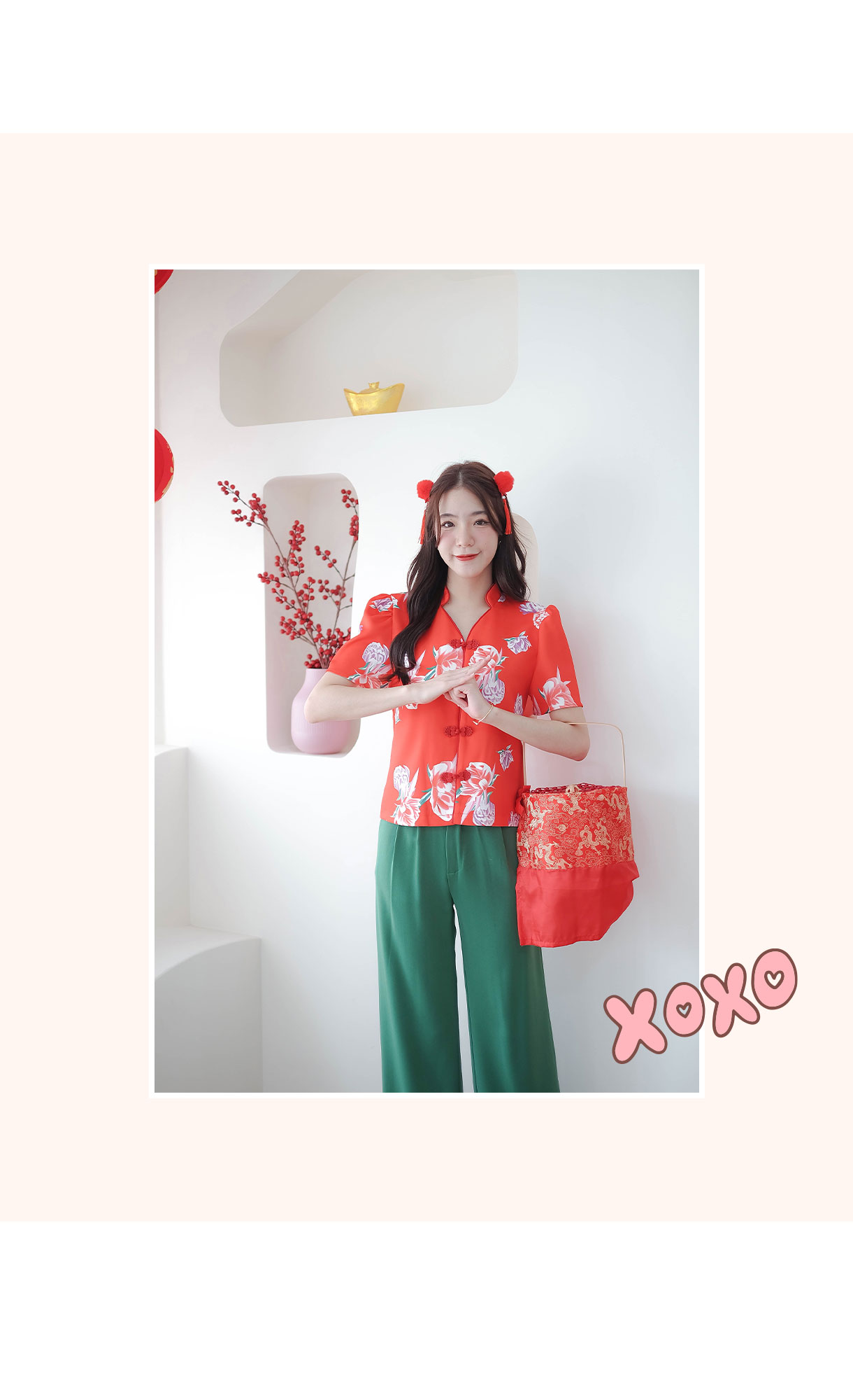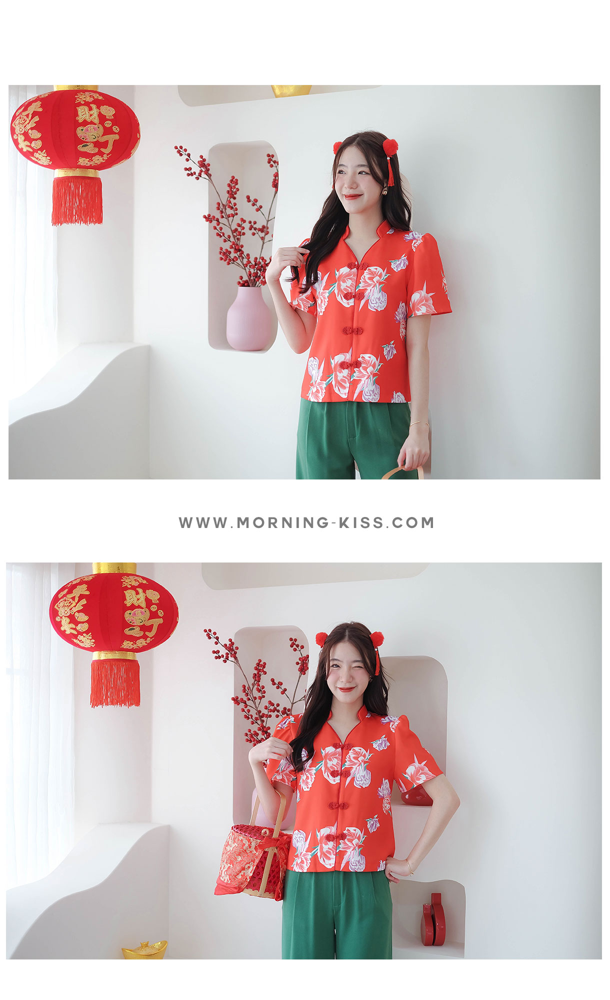 เสื้อคอจีนใส่รับอั่งเปาปีนี้ โทนสีแดงอมส้ม กุ๊นขอบด้วยสีแดง งานปริ้นลายดอกใหญ่หวานๆ แต่งกระดุมจีนสีแดงเรียงด้านหน้า ทรงใส่ง่ายแมทกับกระโปรงกางเกงได้หมด จัดไปใส่ตรุษจีนนี้รับทรัพย์ เฮงๆ กันได้เลย