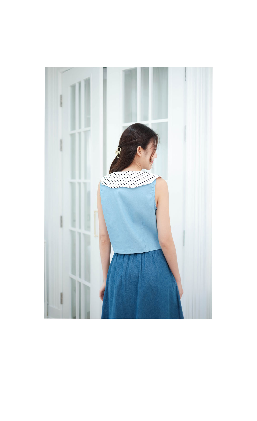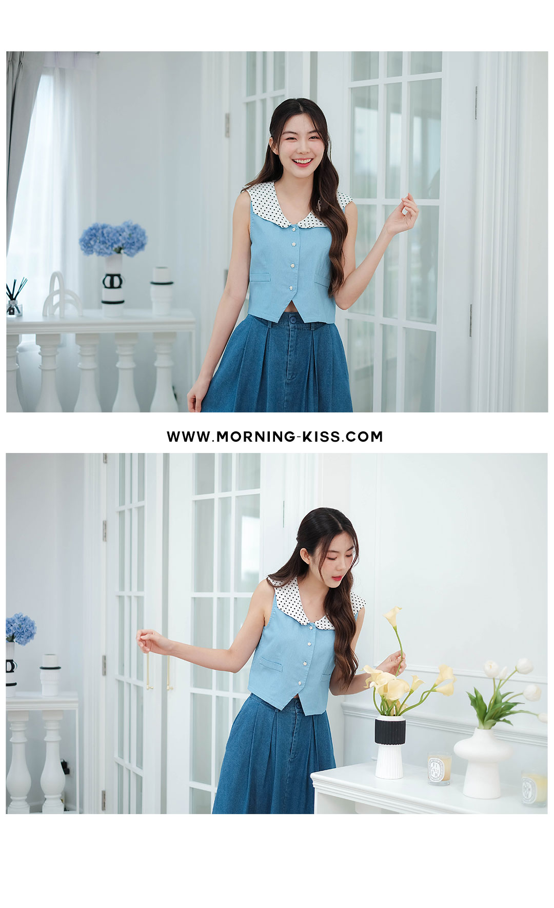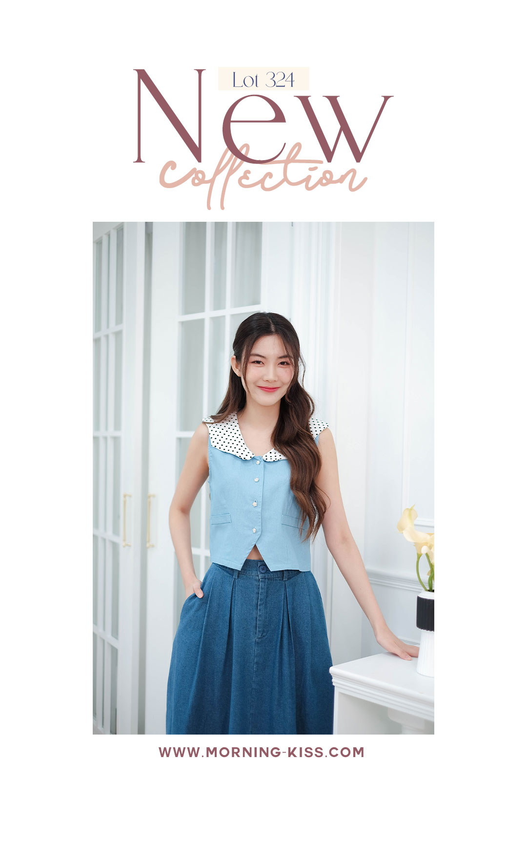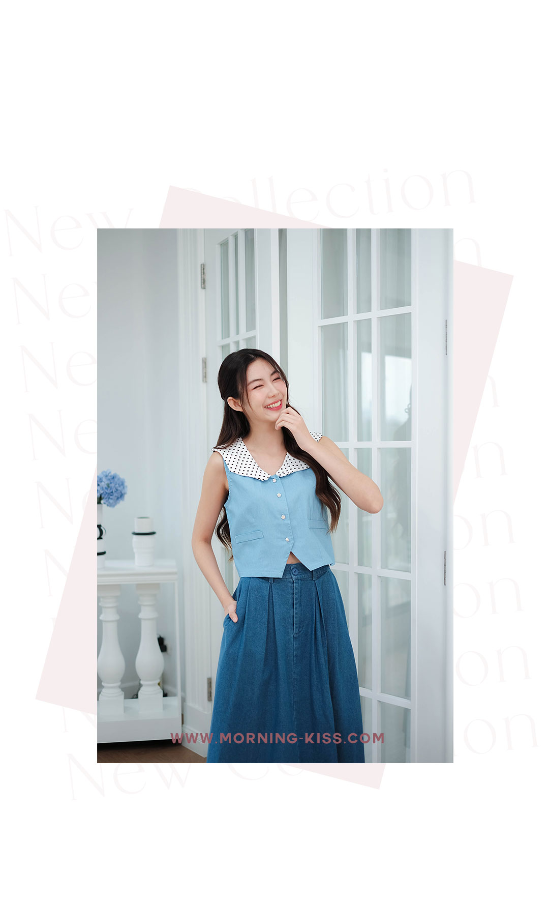 Must Have Item กับเสื้อแขนกุดยีนส์ ช่วงคอปกขาวลายจึดดำ แต่งกระดุมดอกไม้เล็กๆเรียงหน้า มีกระเป๋าหลอก 2 ข้าง ซ้าย/ขวา แบบน่ารักมาก แนะนำเลยค่า ใส่ได้เรื่อยๆ เข้ากับเสื้อผ้าง่าย รุ่นนี้จัดไปไม่ผิดหวังจริงๆ