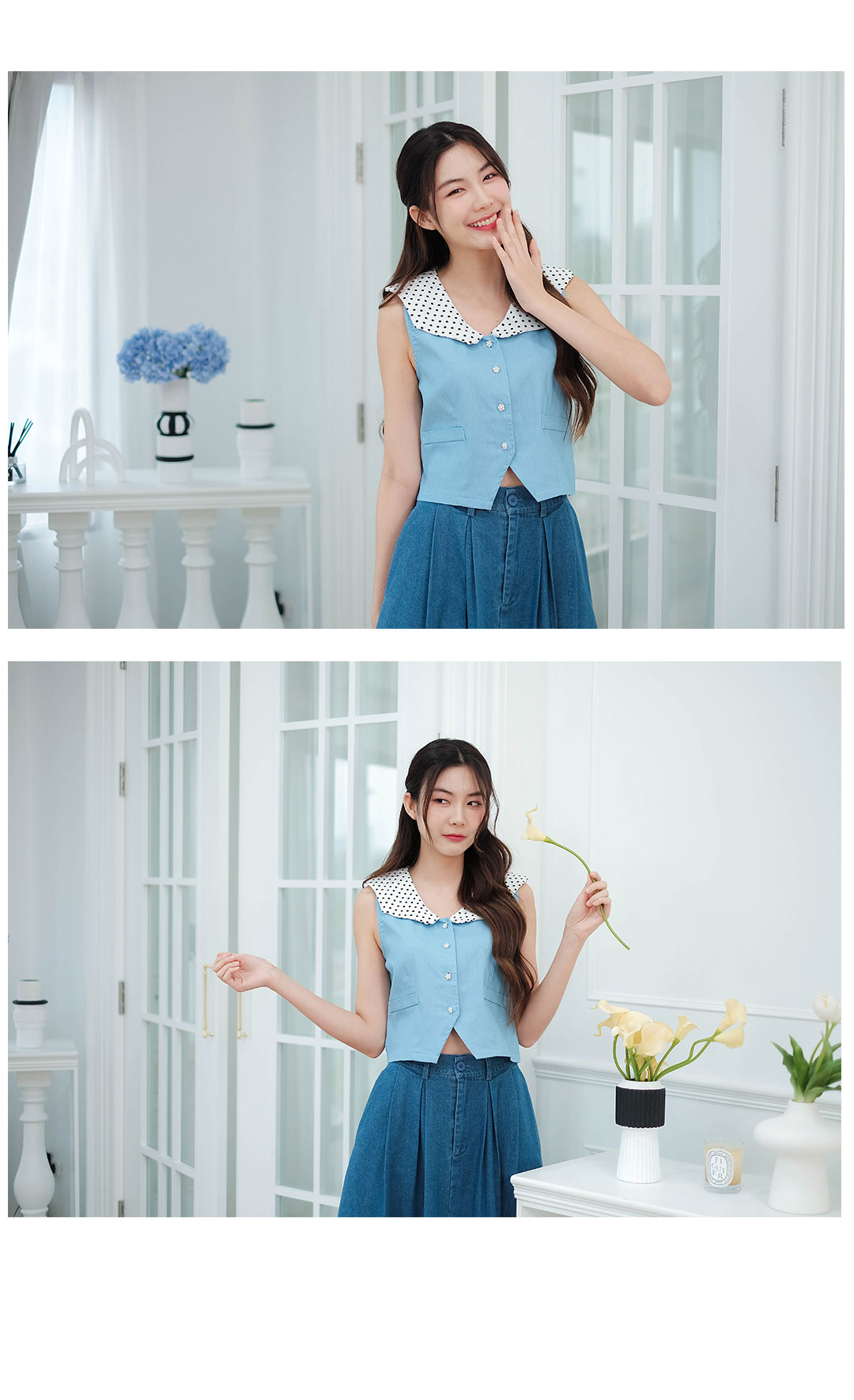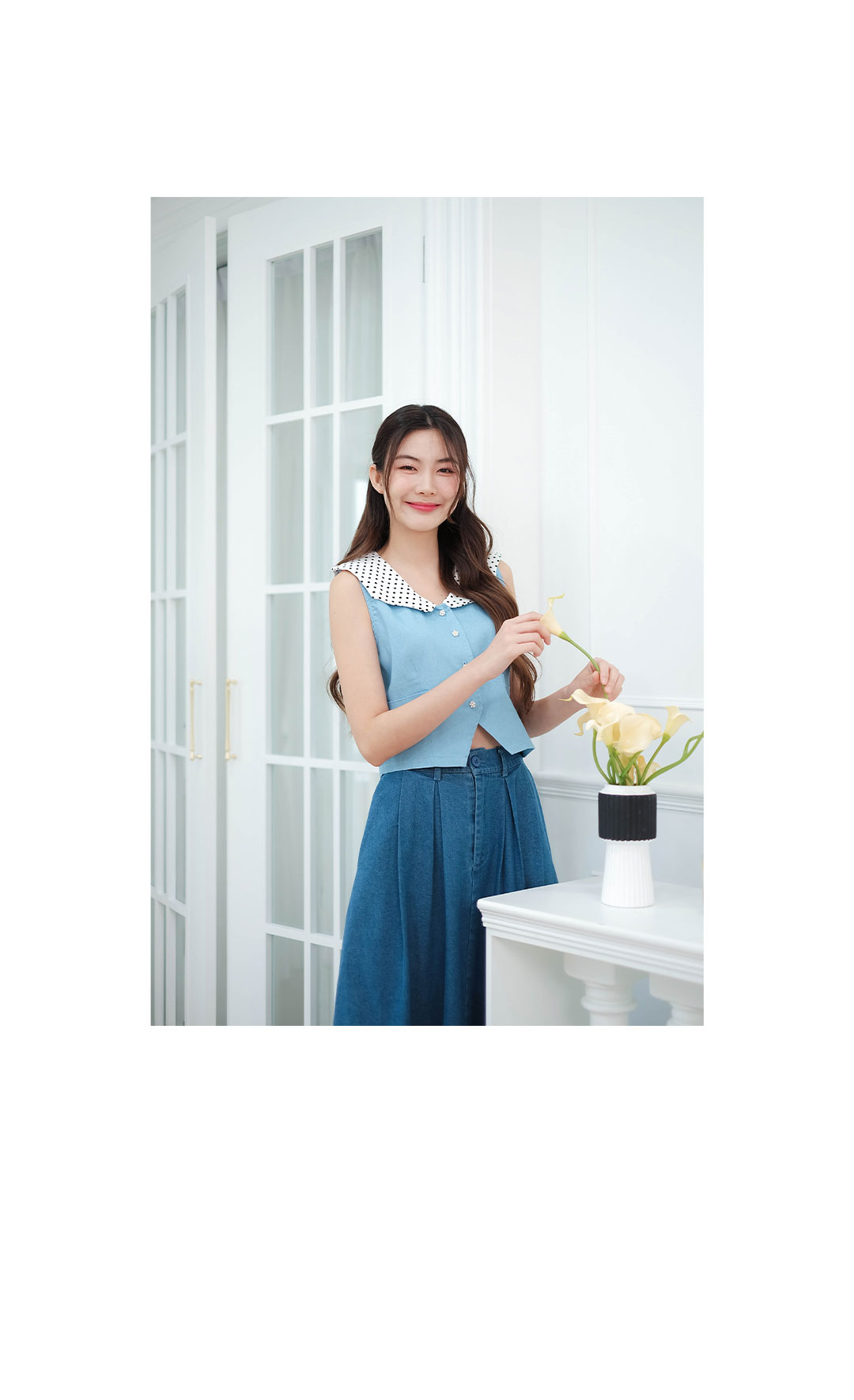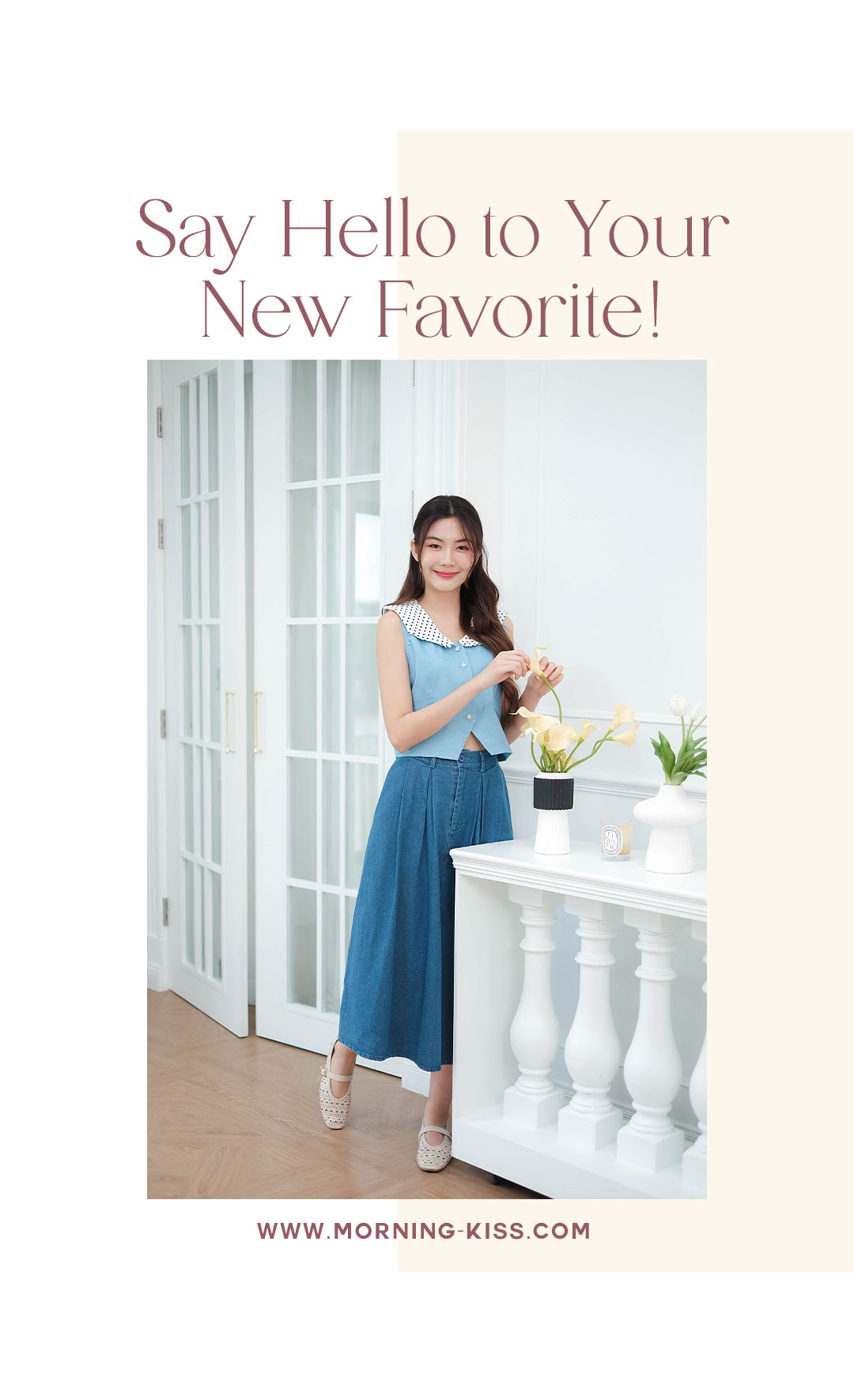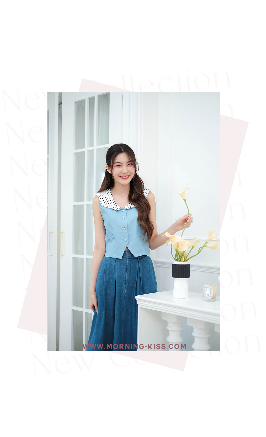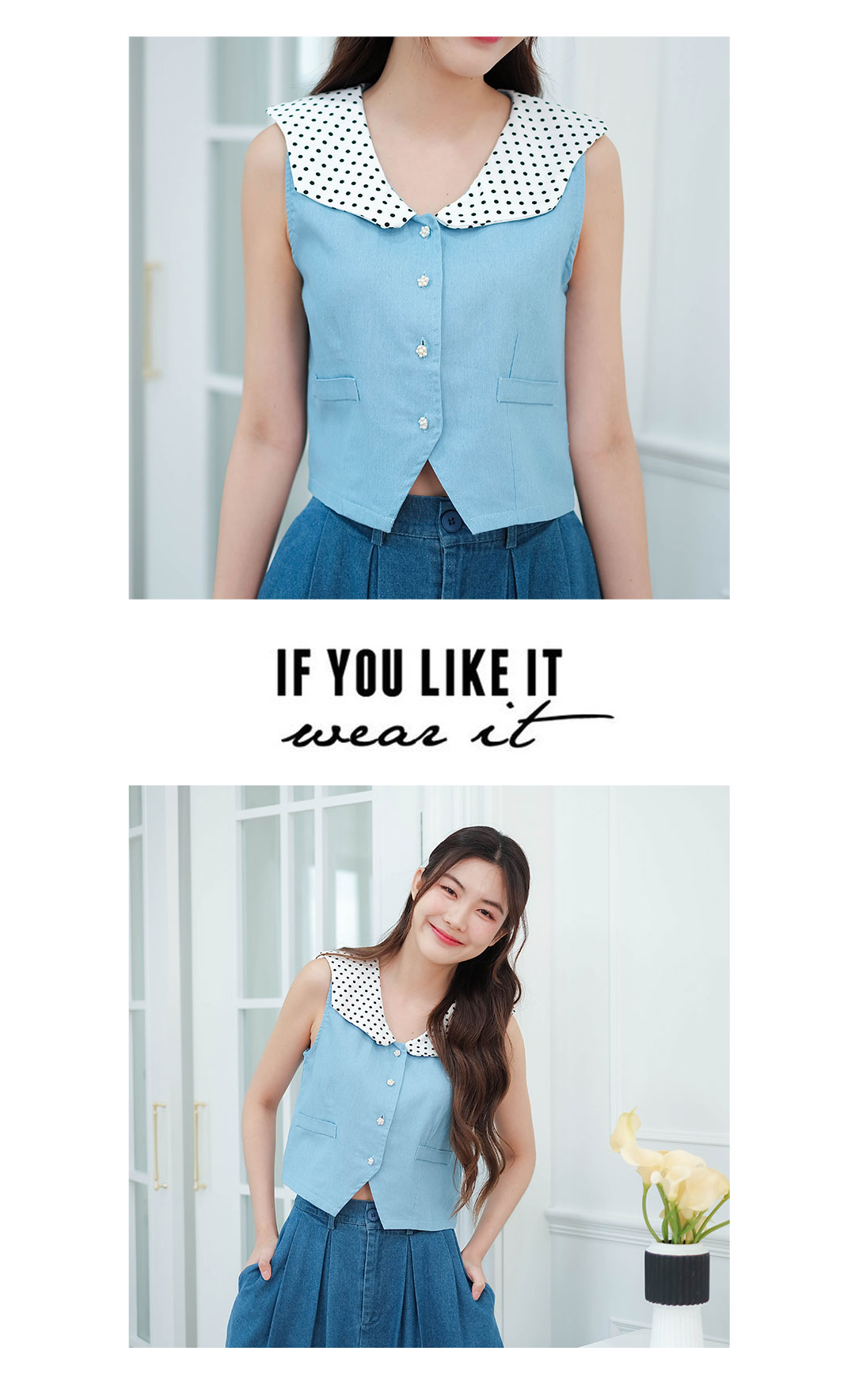 Must Have Item กับเสื้อแขนกุดยีนส์ ช่วงคอปกขาวลายจึดดำ แต่งกระดุมดอกไม้เล็กๆเรียงหน้า มีกระเป๋าหลอก 2 ข้าง ซ้าย/ขวา แบบน่ารักมาก แนะนำเลยค่า ใส่ได้เรื่อยๆ เข้ากับเสื้อผ้าง่าย รุ่นนี้จัดไปไม่ผิดหวังจริงๆ