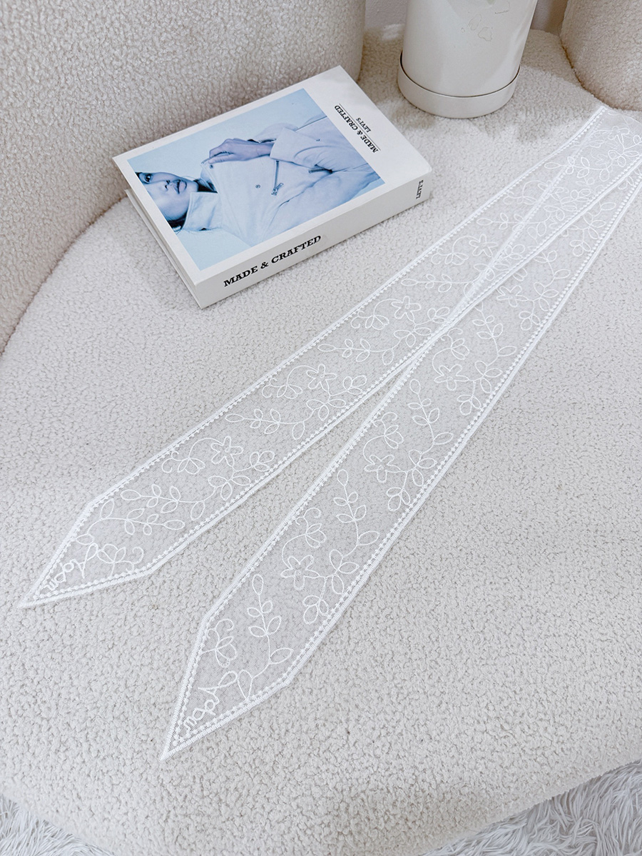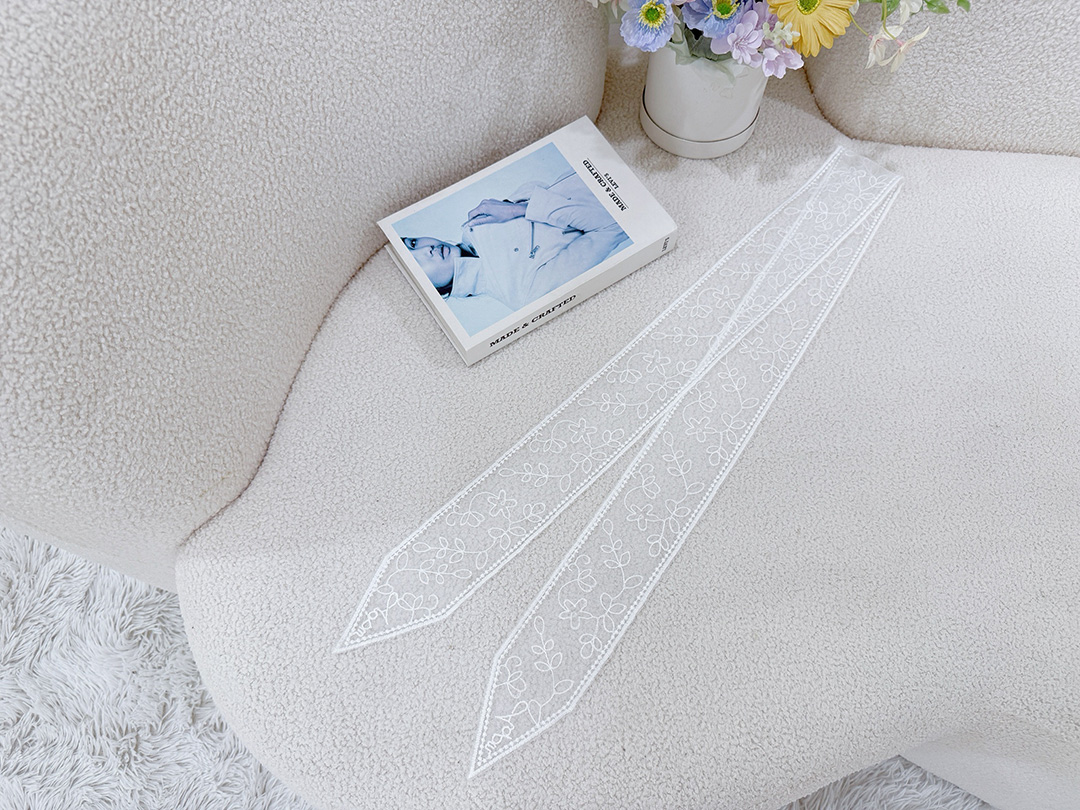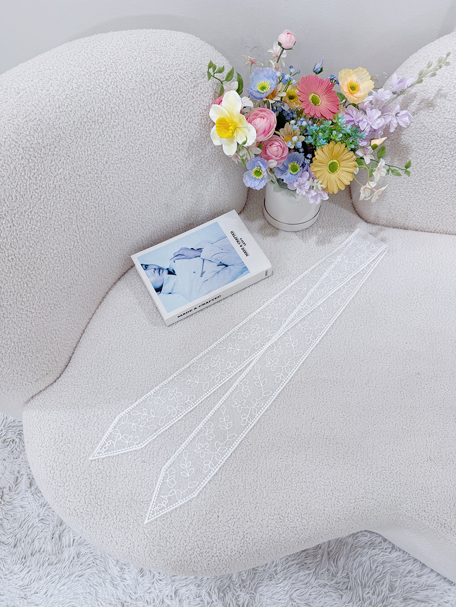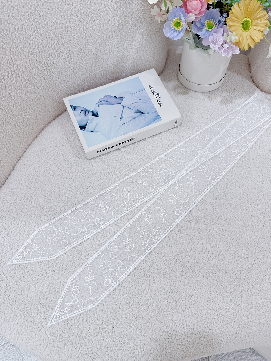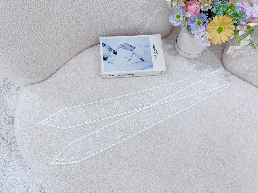 ผ้าประดับลูกไม้สุดชิคที่มาพร้อมดีไซน์สวยหวาน ตัวผ้าลูกไม้ฉลุลายดอกไม้เล็กๆ ทั้งผืน มีปลายแหลมที่ดูเก๋ไม่ซ้ำใคร สามารถนำมาใช้เป็นผ้าคาดผม ผ้าผูกผม หรือจะผูกเป็นโบว์ที่คอหรือเอวก็ดูดีไม่แพ้กัน เป็นอีกหนึ่งไอเทมที่ช่วยเพิ่มความเก๋ให้ชุดของคุณดูมีลูกเล่นมากยิ่งขึ้น