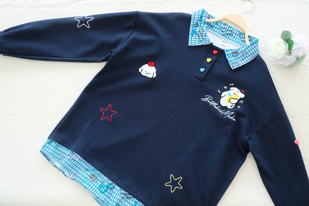 เสื้อสเวตเตอร์สุดคิ้วท์ดีไซน์เก๋มากมีดีเทลน่ารักๆสีน้ำเงินเข้มทรงหลวมๆมาพร้อมปกเชิ้ตลายสก็อตและลูกเล่นกระดุมรูปหัวใจหลากสีคือที่สุด ลายปักน้องหมาสุดคิ้วท์บนอกและลายปักดาวบนแขนเสื้อก็ดูน่ารักไม่ไหวปลายเสื้อก็มีระบายชายเสื้อเป็นลายสก็อต แมตช์กับกระโปรงยีนส์สั้นสีอ่อนหรือกระโปรงเทนนิส ก็จะได้ลุคน่ารักๆ เหมาะมากสำหรับใส่ไปเที่ยวในวันสบายๆ หรือจะใส่ไปคาเฟ่ก็คือได้รูปสวยๆแน่นอน รับรองว่าใส่แล้วสวยปังห็นแล้วต้องรีบสอย