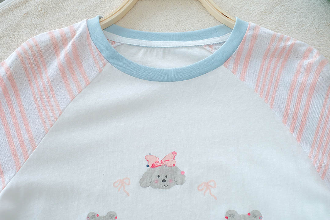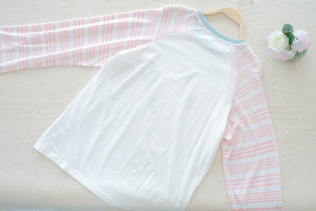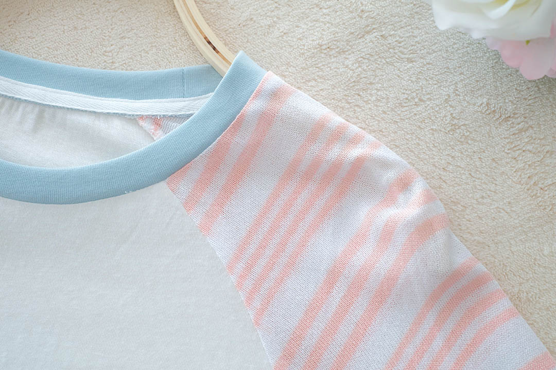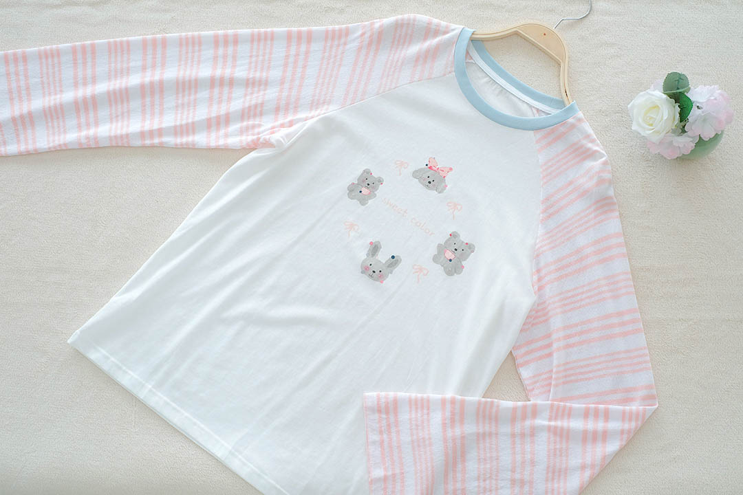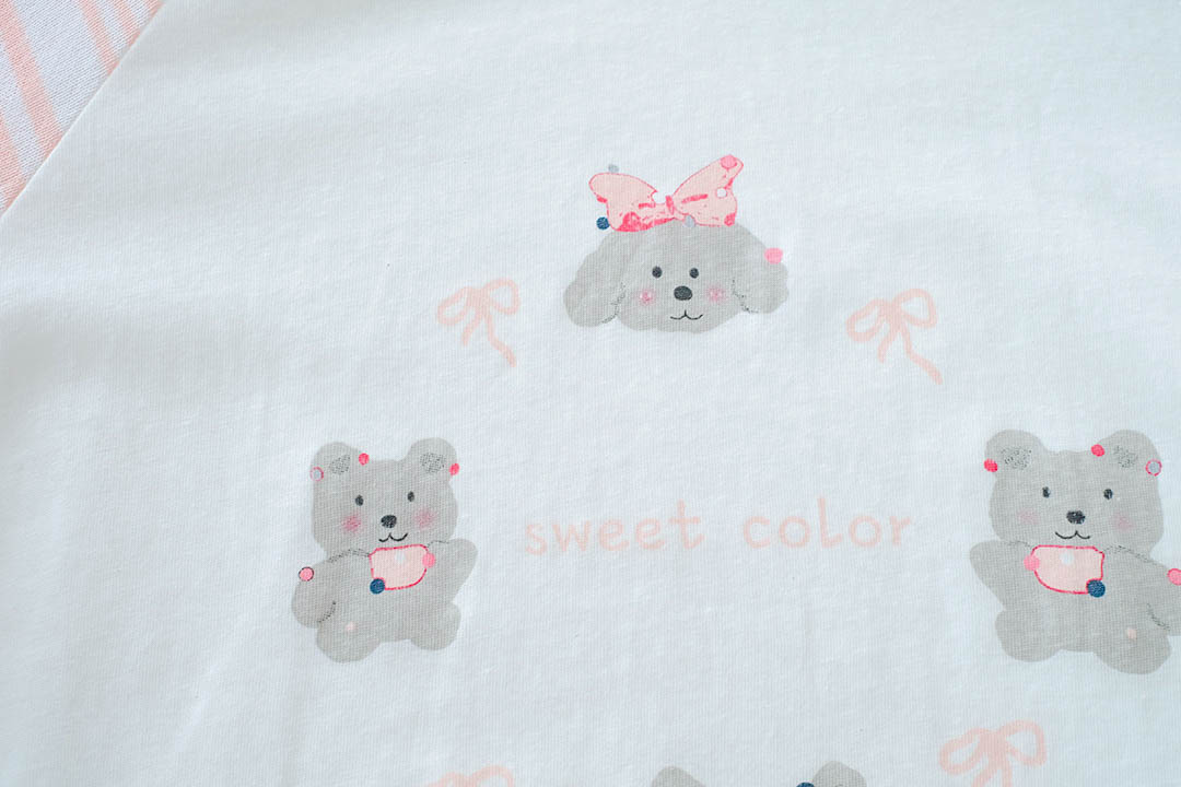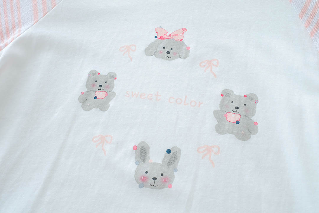 เสื้อแขนยาวลายสุดคิ้วท์ดีไซน์ไม่เหมือนใครเป็นเสื้อสีขาวเรียบๆเพิ่มความน่ารักด้วยแขน Raglan ลายทางสีขาว-ชมพูสุดละมุนและขอบคอสีฟ้าอ่อนที่ตัดกันลงตัวลายสกรีนน้องหมีน้องกระต่ายสุดคิ้วท์พร้อมคำว่า "sweet color" คือน่ารักแบบตะโกน ใส่แล้วดูสดใสซุกซนสุดๆ เนื้อผ้าไม่หนาไม่บางเกินไปแมตช์กับกางเกงยีนส์ขาสั้นหรือกางเกงขาสามส่วนก็ได้ลุคสบายๆ จะใส่ไปเที่ยวไปคาเฟ่ รับรองว่าสวยปัง รีบกดใส่ตะกร้าเลยจ้า