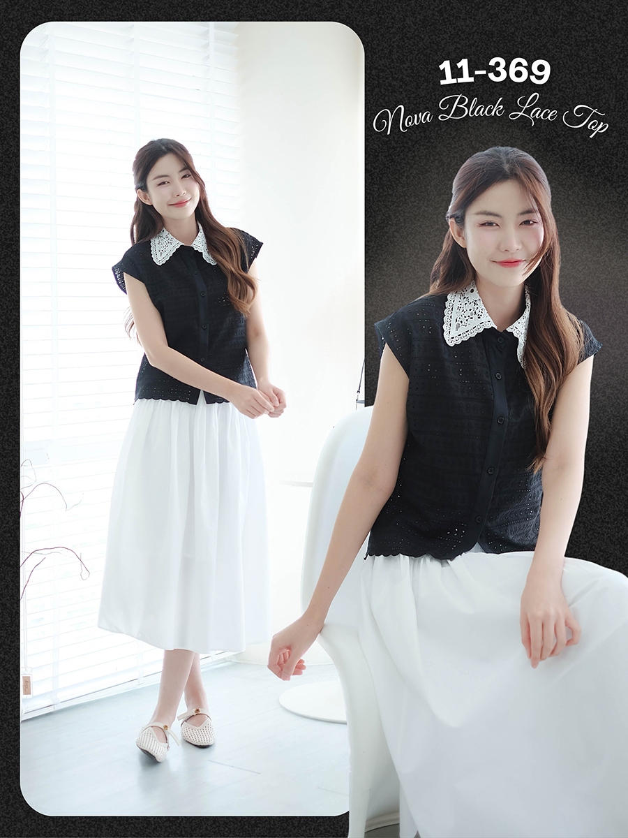 ดีไซน์สุดปังกับเสื้อแขนกุดสีดำคอเสื้อทำจากลูกไม้ถักสีขาวตัดกันของดำ-ขาวคือคลาสสิกตลอดกาลตัวเสื้อสีดำมีดีเทลปักเป็นลายฉลุเล็กๆทั้งตัวทำให้ผ้ามีเท็กซ์เจอร์ มีกระดุมเรียงลงมาด้านหน้าจะใส่คู่กับกางเกงยีนส์เอวสูงสีเข้มก็ดูดีมีสไตล์ไปอีกแบบ ใส่ไปทำงาน งานพิธีการ ออกเดท ได้หมด ของมันต้องมีจริงๆใส่แล้วได้ลุคที่ดูหรูหราน่ารักและมีสไตล์ในเวลาเดียวกัน ใครชอบความเนี้ยบแบบลูกคุณห้ามพลาด!