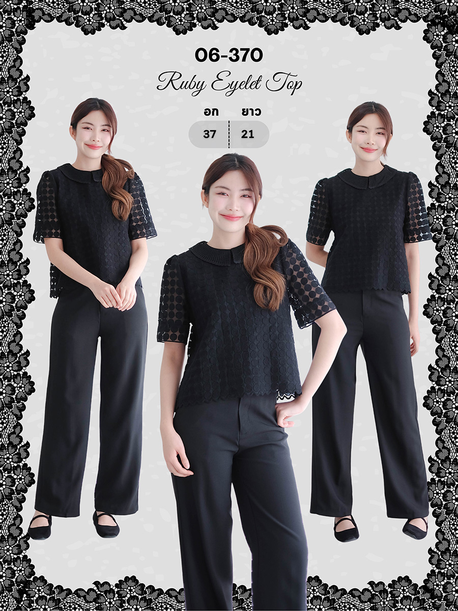 สวยเกินต้านคอบัวลายจุดที่ทำให้คุณดูเด็กลงไปอีก10ปี เสื้อแขนสั้นสีดำคอปกแต่งลูกไม้ถักฉลุลายสวยละเอียด ทำให้เสื้อดูน่ารักแต่ยังคงความเนี้ยบ ตัวเสื้อผ้าลูกไม้ลายวงกลมซ้อนกันอย่างมีมิติแต่ยังคงความหรูหรา ทรงพองเล็กน้อยน่ารักกำลังดี ชายเสื้อดีไซน์ขอบหยักโค้งมนทำให้เสื้อดูอ่อนหวาน มีซับใน จะใส่ไปทำงาน งานที่ต้องการความสุภาพดูเรียบร้อยและมีระดับหรือจะแมตช์กับกางเกง กระโปรง คือได้หมด ใครชอบความเนี้ยบแบบลูกคุณห้ามพลาด!