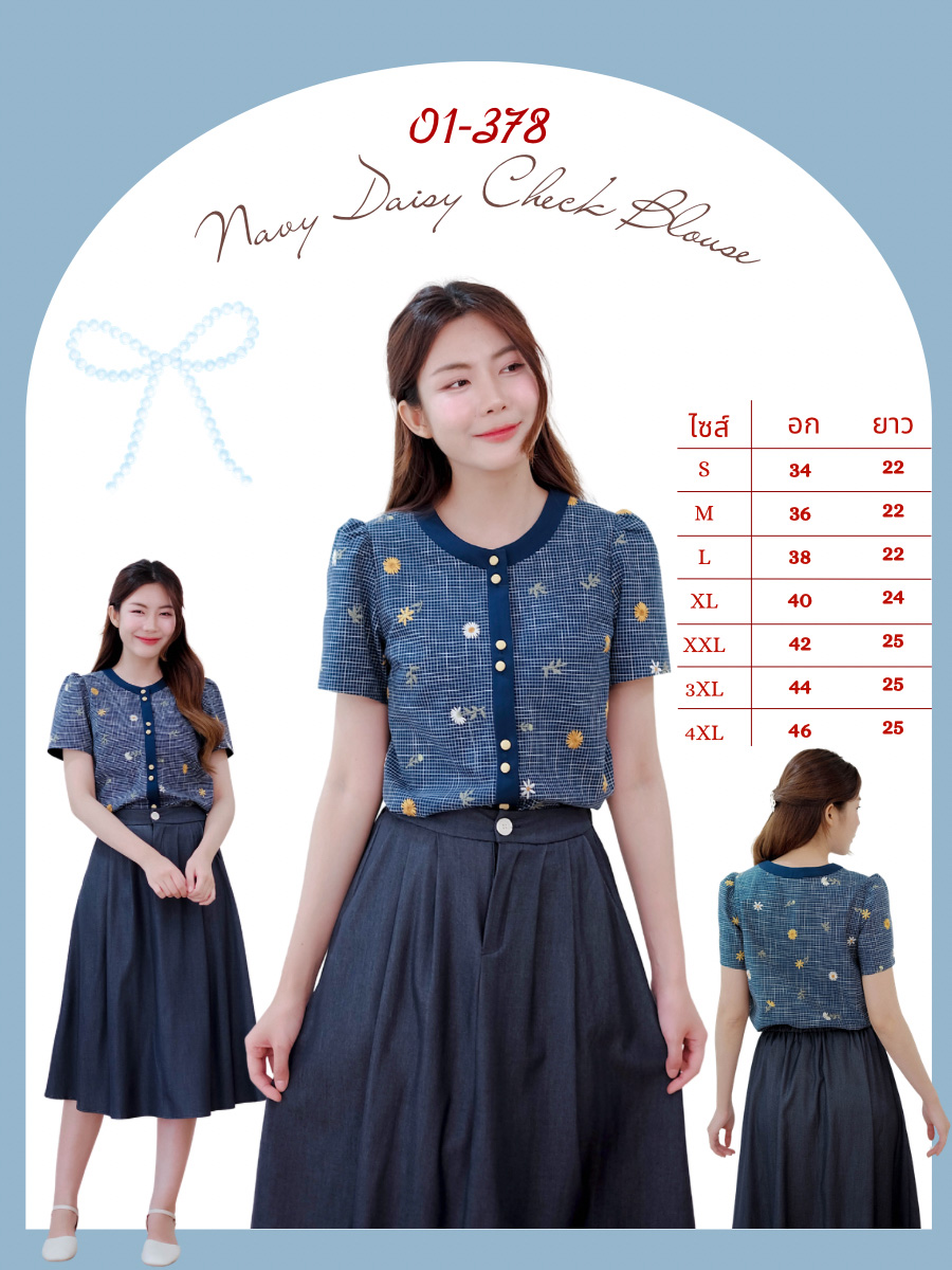 01-378 Navy Daisy Check Blouse - 7 ไซส์