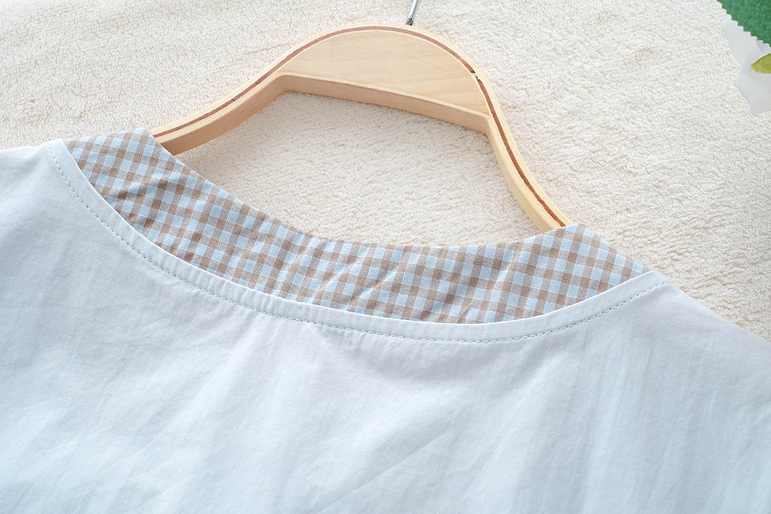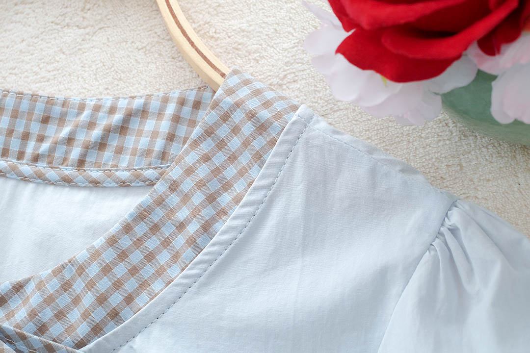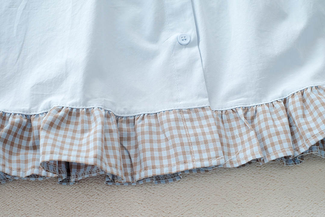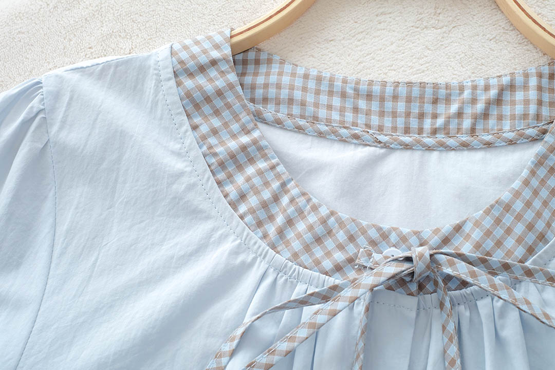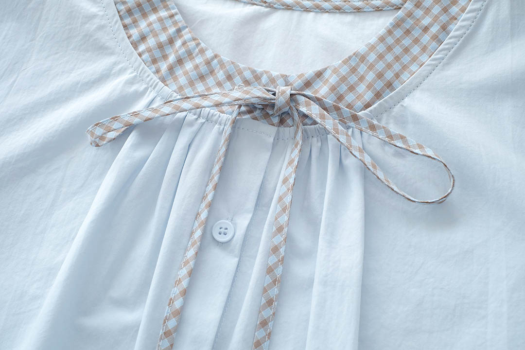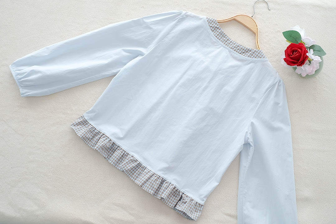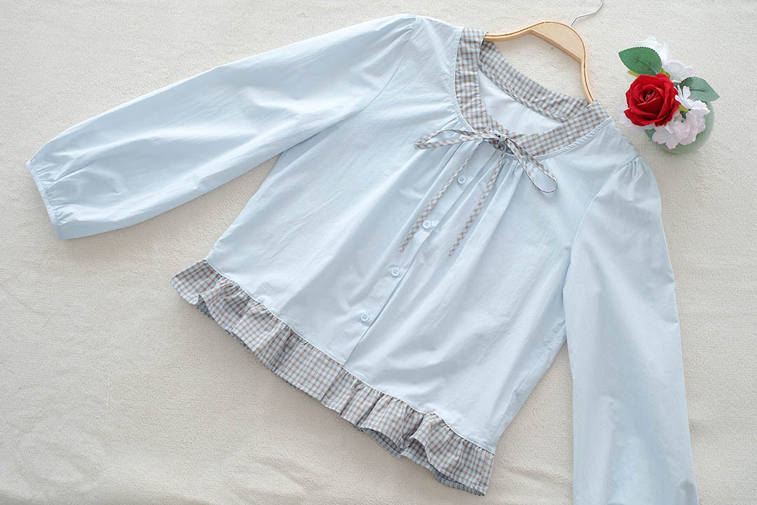 น่ารักละมุนใจกับเสื้อสีฟ้าแต่งระบายลายสก๊อตสไตล์ลูกคุณหนู ใครสายหวานซ่อนความมินิมอลต้องรุ่นนี้เลย เสื้อแขนยาวสีฟ้าอ่อนพาสเทลดูสบายตา โดดเด่นด้วยดีเทลการตัดต่อผ้าลายสก๊อตที่รอบคอเสื้อและทำเป็นระบายๆ ที่ชายเสื้อ เพิ่มความน่ารักแบบคูณสิบ มีสายผูกโบว์ลายสก๊อตเข้าเซ็ตกันที่คออีกด้วย ดีไซน์กระดุมหน้าสวมใส่ง่าย จะใส่ทำงานวันสบายๆ แมตช์กับกางเกงขาสั้นหรือกางเกงผ้าลินินสีครีมก็คิ้วท์สุดๆ หยิบมาใส่ในวันชิลล์ๆ หรือไปคาเฟ่ก็ปังค่า
