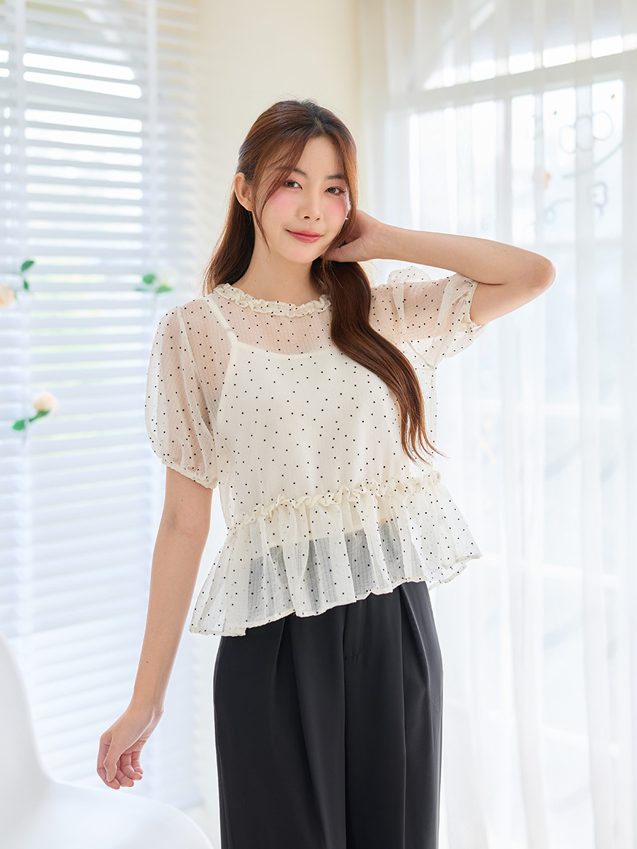 สาวหวานซ่อนเปรี้ยวต้องมาจัดเซ็ทนี้ค่าาา เสื้อซีทรูแขนสั้นโทนสีครีมลายจุดเล็กๆน่ารักๆ แอบเซ็กซี่เบาๆ มาพร้อมสายเดี่ยวสีครีม ดีเทลคือเริ่ดมาก คอระบายจับจีบให้ดีไซน์ดูสวยหวาน ชายระบายเพิ่มให้ลุคดูหวานดูมีอะไร แขนเสื้อพองๆกำลังดี รุ่นนี้แมตช์กับกางเกง/กระโปรงก็ได้ หรือจะเปลี่ยนสีสายเดี่ยวตัวในก็เปลี่ยนลุค! สอยด่วนๆก่อน Sold Out นะคะซิส