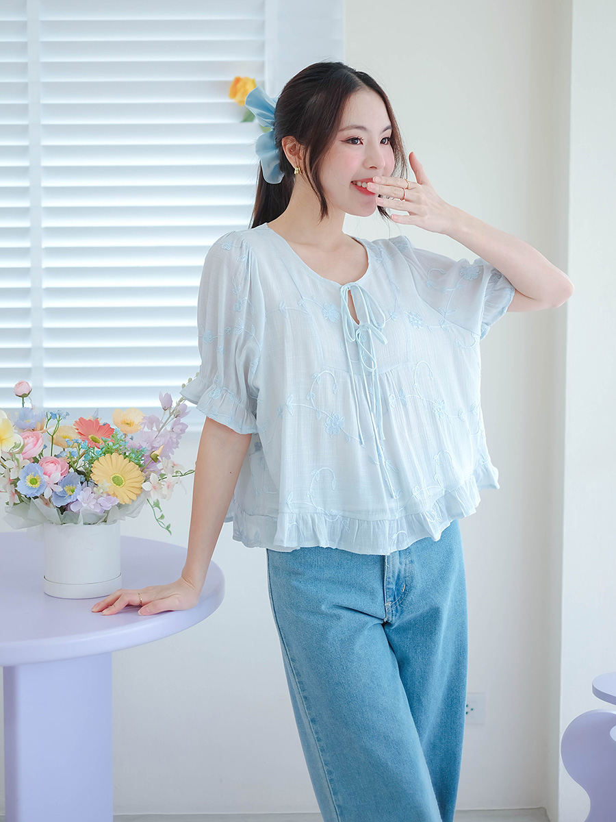 สวยหวานไม่ไหวกับเสื้อแขนสั้นสีฟ้าอ่อนๆละมุนตา สวยหวานแบบขั้นสุด เนื้อผ้ามี Texture แถมงานปักเนี๊ยบๆรอบตัว ดีไซน์ยิ่งเพิ่มให้ลุคนี้ละมุนไปอีก ช่วงคอแต่งเป็นเชือกผูกน่ารักๆ เพิ่มความหวาน แขนเสื้อดีไซน์พองๆนิดๆกำลังน่ารัก ใส่ซับในช่วงตัว ชายระบายแบบเบาๆ แมทช์ง่ายสุดๆ จะยีนส์ กระโปรง หรือกางเกงขาสั้น ก็เข้ากันไปหมด ใส่ไปเที่ยวหรือวันชิลล์ๆก็ได้หมด
