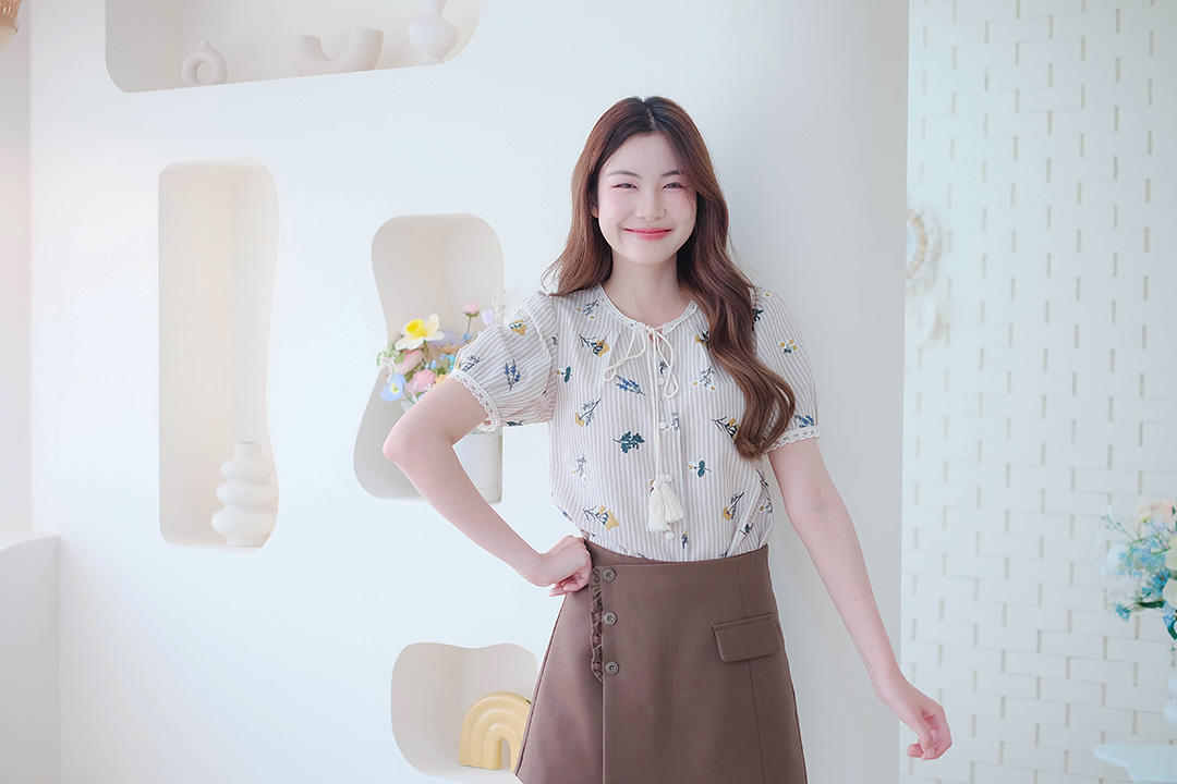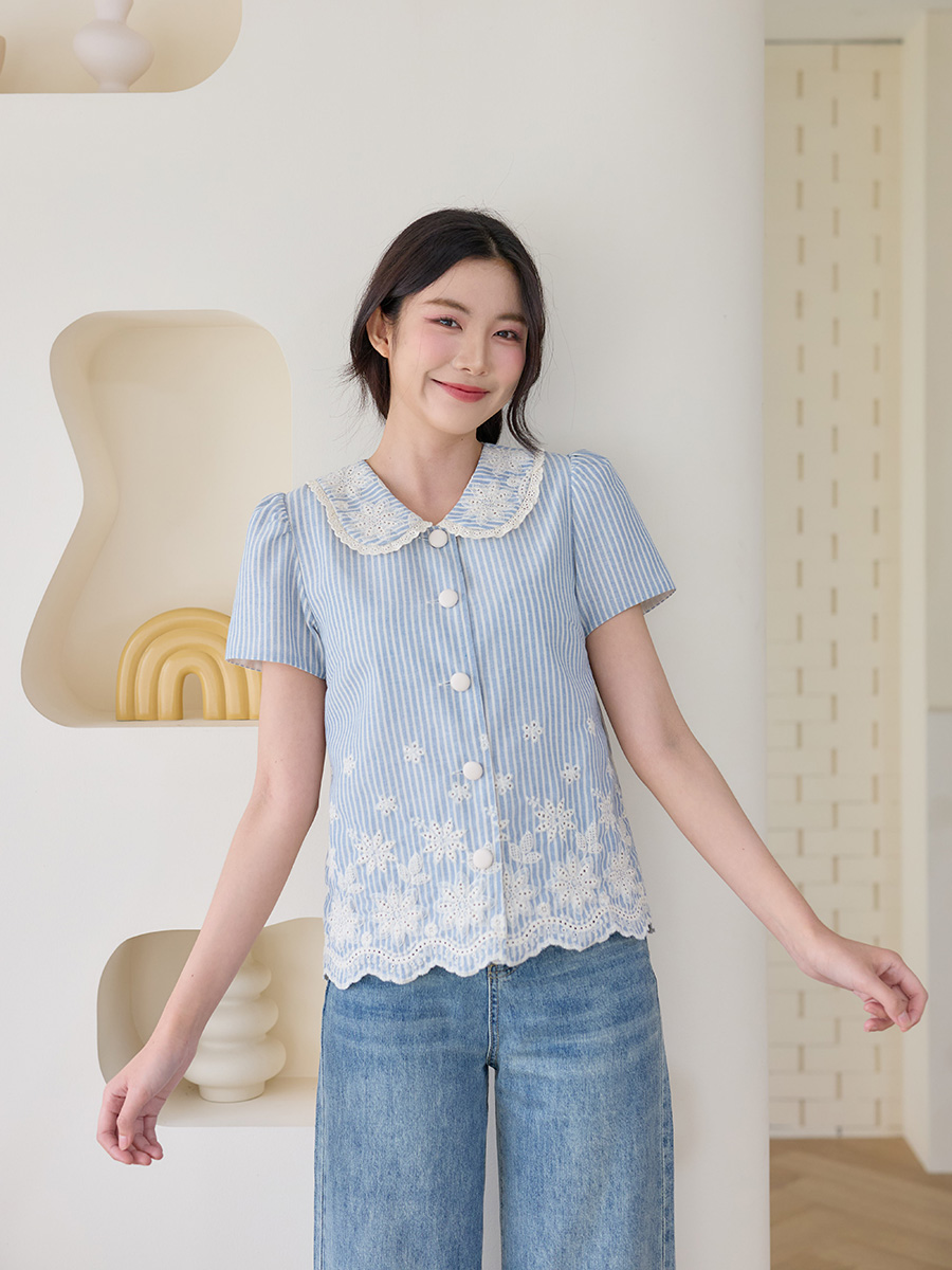มาแล้วค่าาา โทนสีฟ้าที่ทุกคนรอคอยจัดมาให้แล้ว เสื้อแขนสั้นลายทางสีฟ้าครีมคอปกบัวงานปัก เป็นผ้าคอตตอนลินินลายทางฟ้าสลับครีม คือโทนสีละมุนมากก ดีเทลงานปักแน่นๆที่ชายเสื้อและคอปกแถมกุ๊นลูกไม้เล็กๆด้วยน้า แถมชายเสื้อเป็นชายเชิงเพิ่มความคิ้วท์ไปอีกก กระดุมเรียงหน้า ใส่แล้วได้ลุคสาวหวานละมุนสุดๆ ใส่กับกางเกงหรือกระโปรงยีนส์ก็ดูชิลล์น่ารัก พลาดไม่ได้จริงๆนะค้า