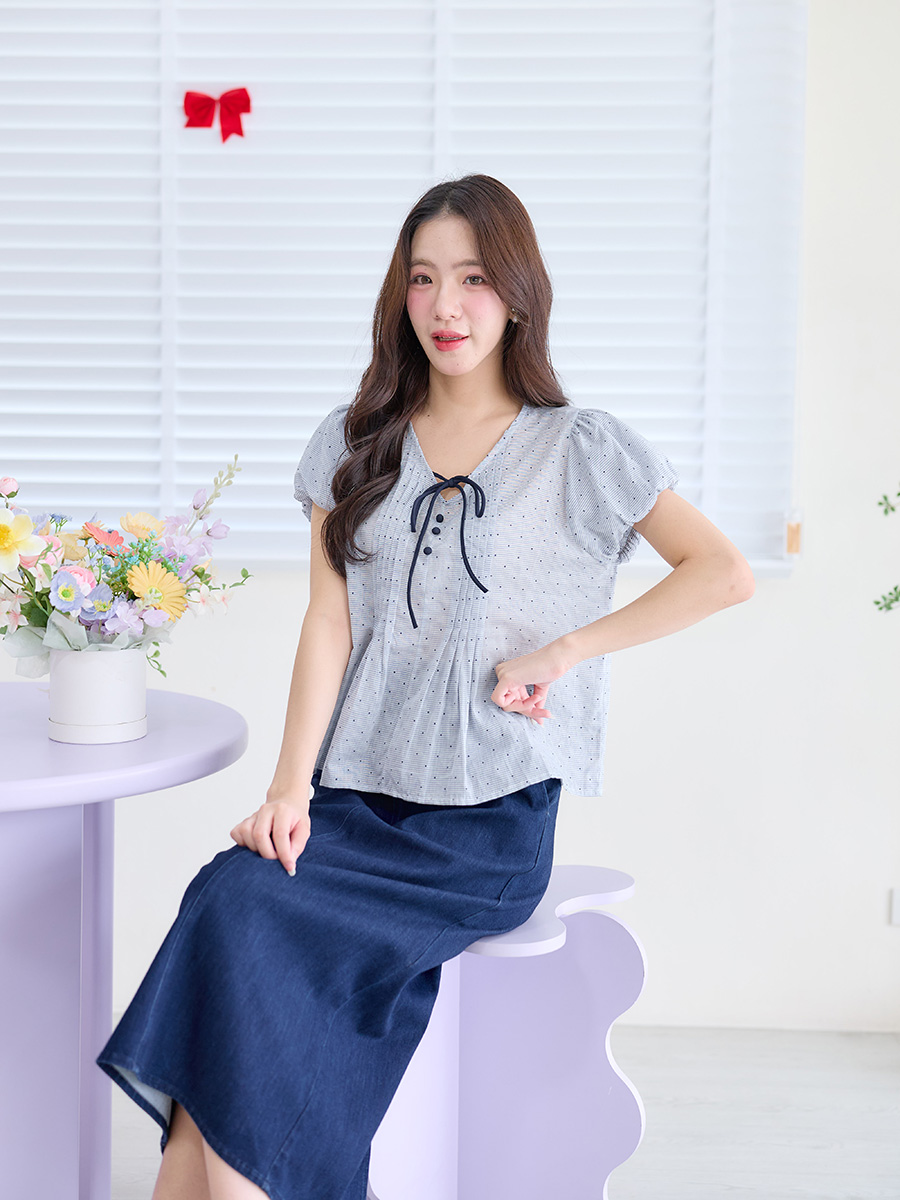 น่ารักเกินต้านมากเสื้อตัวนี้คือความละมุนที่แท้ทรู เป็นเสื้อสีฟ้าอ่อนลายทางเล็กๆ สลับกับลายจุดดอทๆ คือน่ารักคูณร้อย ที่เริ่ดคือดีเทลด้านหน้า เค้าดีไซน์เย็บจับจีบลงมาเป็นแนวสวยๆ แถมมีเชือกผูกโบว์สีดำตัดกันคือเพิ่มความเก๋ไปอีก! มีกระดุมด้านล่างลงมาอีก 2 เม็ด คือดีเทลแน่นๆ แขนเสื้อพองนิดๆ คือน่ารักมาก ใส่แล้วดูเป็นสาวหวานๆ น่ารักขี้เล่น จะแมทช์กับกางเกงยีนส์ขาสั้น ขายาว หรือกระโปรงก็คือเข้ากันสุดๆ! ใส่ไปคาเฟ่ ถ่ายรูปคือปังทุกช็อต พลาดแล้วจะเสียใจนะคะ