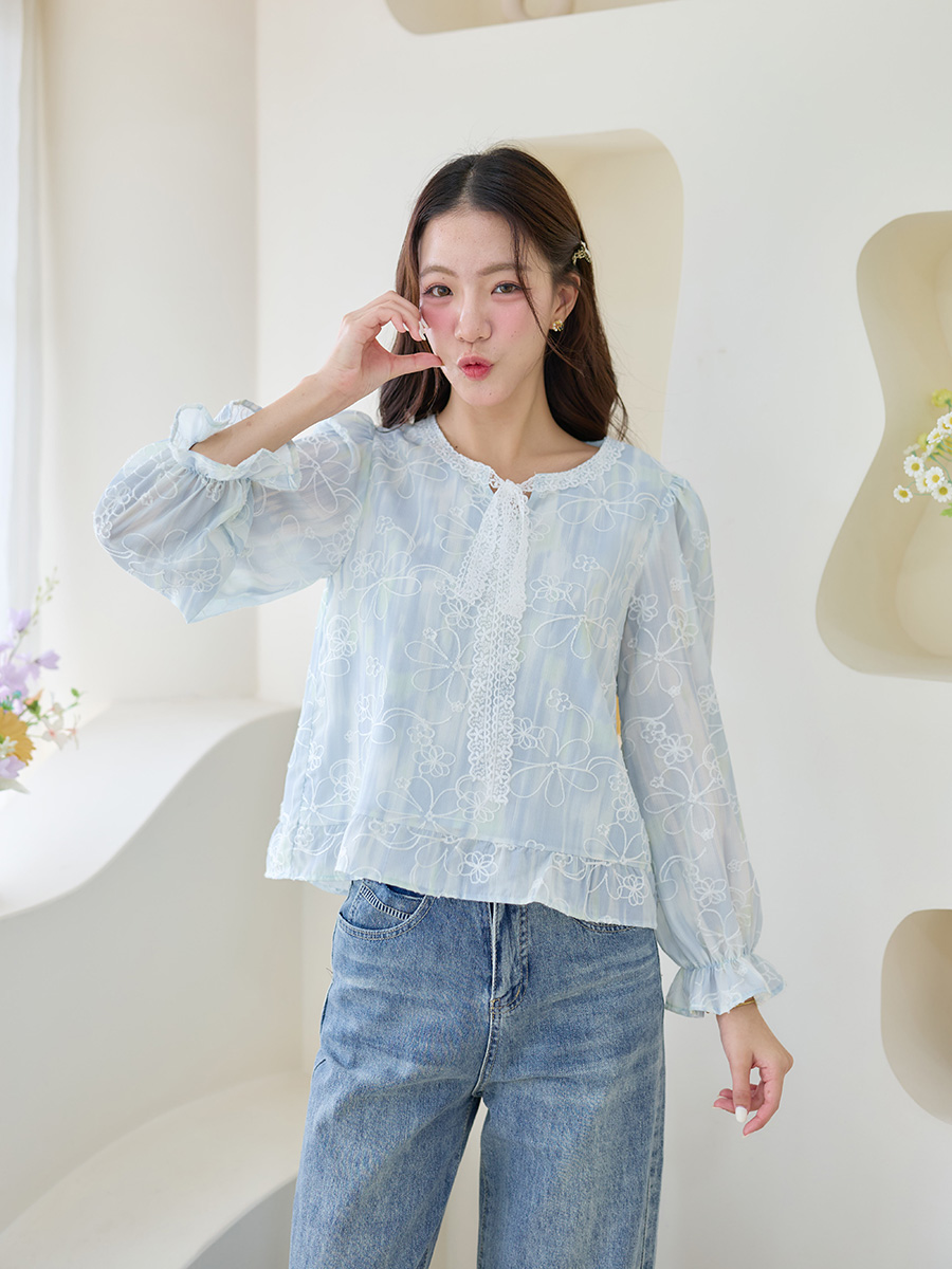 ความละมุนรุ่นนี้ให้เต็มร้อย กับเสื้อแขนยาวโทนฟ้าแซมสีขาวเขียวละมุนมาก ที่ใส่แล้วให้ฟีลผู้ดีแบบลูกคุณจริงๆ ดีเทลผ้าสีสวย นิ่มๆพลิ้วไม่ไหวแถมปักดอกไม้สีขาวทั้งตัว เพิ่มลูกเล่นด้วยโบว์ผ้าลูกไม้รอบคอที่ดูน่าร้าก แขนยาวทรงพองเบาๆ ปลายแขนรูดระบายเล็กๆช่วยเพิ่มความหวาน ชายเสื้อระบายเบาๆให้ลุคที่ดูแพงแต่ยังน่ารักสดใส ใส่ซับในช่วงตัวไม่ร้อนแน่อน ใส่กับยีนส์หรือแมทช์กับกระโปรงเป็นสาวหวานทันที เหมาะทุกโอกาสต้องรีบเอฟก่อนหมดนะค้าาา