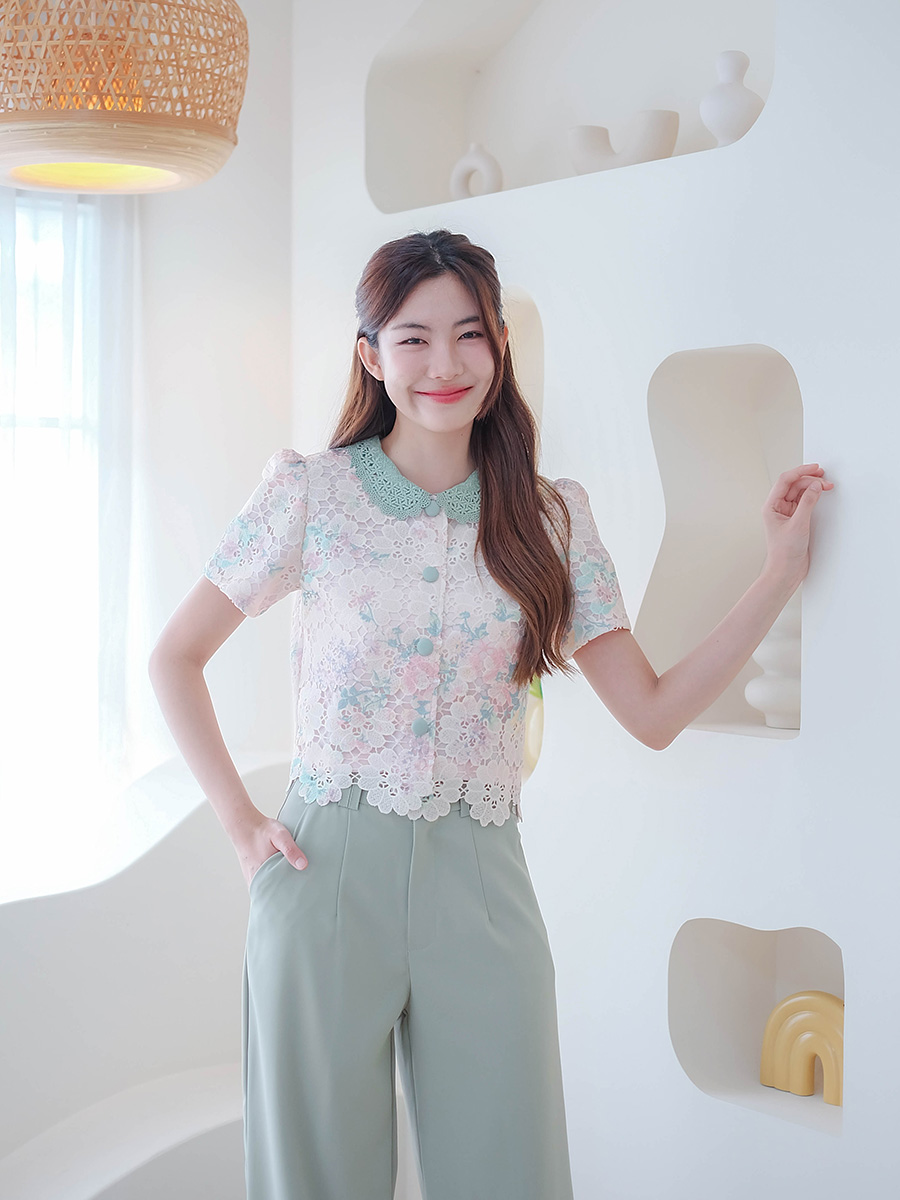 ที่สุดแห่งความน่ารักเสื้อลูกไม้ลายดอกไม้สีพาสเทลละมุนใจมากกดีเทลลูกไม้ฉลุลายสวยแบบตะโกน ที่สำคัญคือมีซับในสีชมพูอ่อนทั้งตัวช่วงปกคอ Peter Pan Collar ลายถักสีเขียวมิ้นต์คือเริ่ดมาก เป็นลูกเล่นที่ทำให้เสื้อดูไม่เรียบเกินไป ส่วนกระดุมก็ยังเป็นสีเขียวมิ้นต์เข้ากับปกไปอีก! ใส่แล้วดูคุณหนูสุดๆจะแมทช์กับกระโปรงสั้น กางเกงยีนส์ หรือกางเกงผ้าก็คือได้ทุกลุค ใส่ได้ทุกโอกาสเลยนะตัวนี้