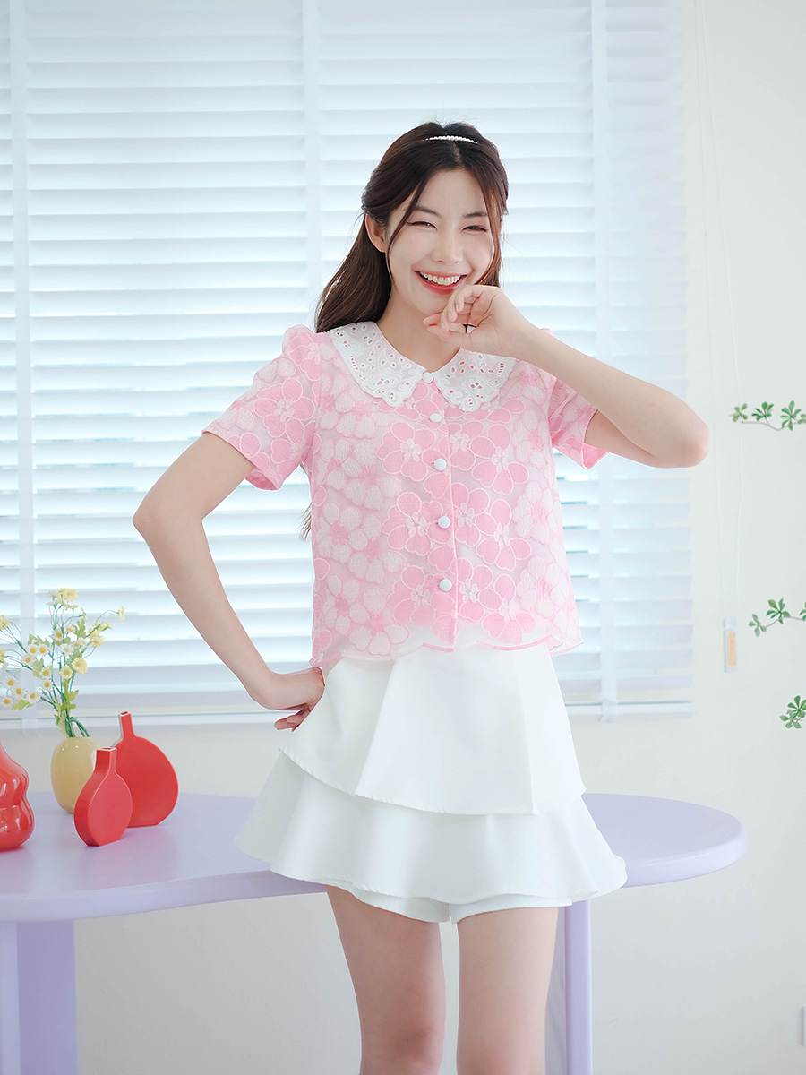 เสื้อตัวนี้คือน่ารักมากเป็นเสื้อสีชมพูละมุนๆลายดอกไม้แบบ Jacquard ที่ดูมีเท็กซ์เจอร์ไม่เหมือนใคร ที่เด็ดสุดคือปก Peter Pan Collar สีขาวฉลุลายลูกไม้แบบสวยมาก ใส่แล้วดูเป็นสาวหวานคุณหนูสุดๆ กระดุมสีขาวกลมๆ เข้ากันกับปกสุดๆ มีซับในทั้งตัวใส่สบายไม่ระคายผิวไม่ต้องกังวลเรื่องความบางเลย จะใส่ไปเที่ยวคาเฟ่ ไปออกเดท หรือไปงานเลี้ยงแบบชิลล์ๆ ก็คือได้หมด ตัวนี้คือแมทช์ได้ง่ายสุดๆ จะใส่กับกางเกงขาสั้นสีขาว หรือกระโปรงทรงสวยๆ ก็คือปังแน่นอน