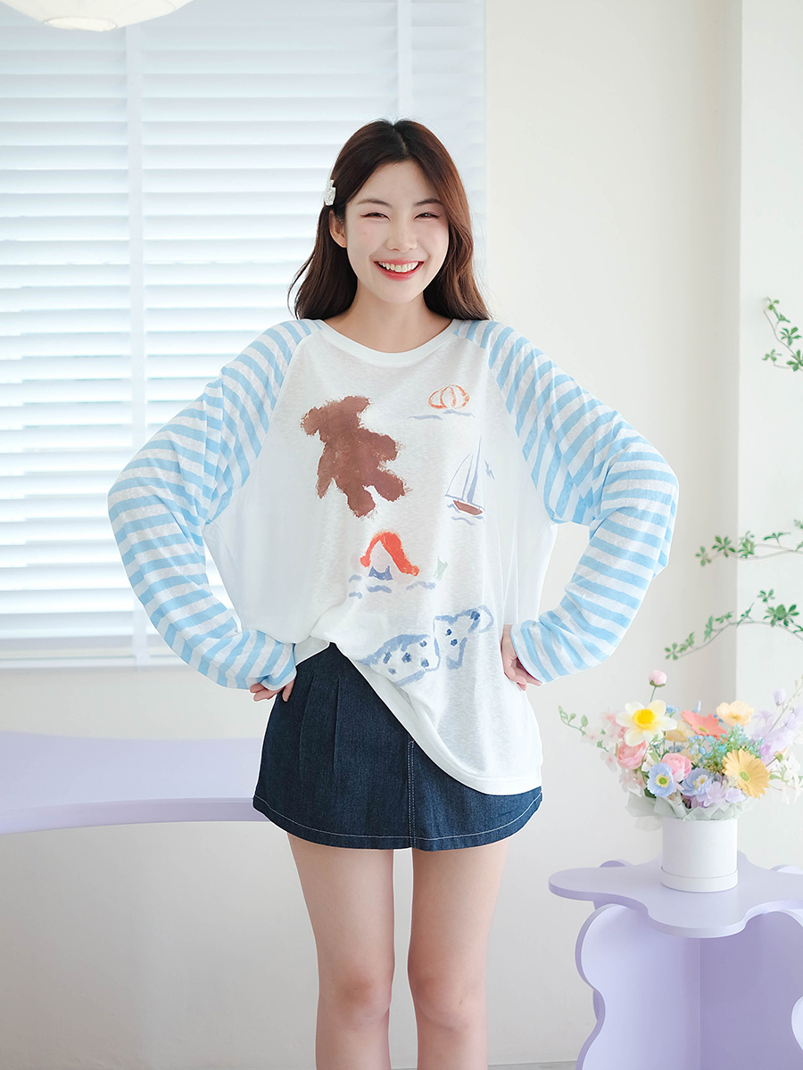 สื้อแขนยาวลายสุดชิคสไตล์มินิมอลสีขาวเรียบๆแต่เพิ่มความน่ารักด้วยแขน Raglan ลายทางสีขาว-ฟ้าอ่อนสุดละมุน ที่สำคัญคือมีลวดลายสกรีนน้องหมี น้องหมา เรือใบ และคลื่นน้ำที่ดูเป็นงานศิลปะสุดๆใส่แล้วได้ลุคแบบอาร์ตๆ มีสไตล์ไม่เหมือนใครแน่นอน เนื้อผ้าไม่หนาไม่บางเกินไปใส่กับกางเกงยีนส์ขาตรงสีเข้ม พร้อมรองเท้าผ้าใบ ก็จะได้ลุคที่ดูเก๋ขึ้นไปอีก จะใส่ไปเที่ยว ไปคาเฟ่ ใครกำลังหาเสื้อตัวโปรด ต้องตัวนี้เลย ไม่ผิดหวังแน่นอน