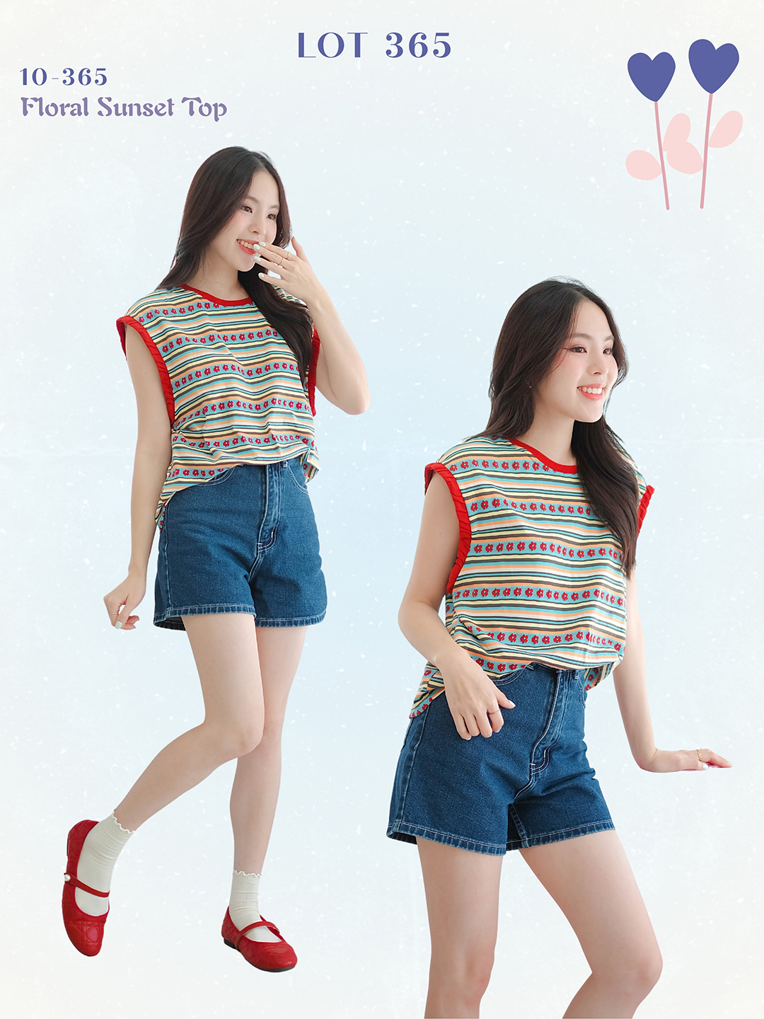 เสื้อแขนกุดลายทางสุดจี๊ดสีสันสดใสแบบตะโกนทั้งฟ้า ส้ม เหลือง และมีลายดอกไม้เล็กๆแซมอยู่ด้วยลายรวมกันแล้วได้ฟีลแบบเรโทยุค 70s/80s ที่กำลังอินมาก ขอบคอและแขนแต่งด้วยผ้าสีแดงเข้มมีดีเทลระบายเล็กๆตรงหัวไหล่ เนื้อผ้าจะนุ่มและบางเบาใส่สบายไม่ร้อน แมตช์กับกางเกงยีนส์ขาสั้นหรือกระโปรงยีนส์ทรง A จะใส่ไปคาเฟ่ เดินเล่น ไปเที่ยวทะเล ไอเท็มที่ไม่ควรพลาด ดีเทลสุดคิ้วท์คือที่สุด ต้องจัดด่วน!