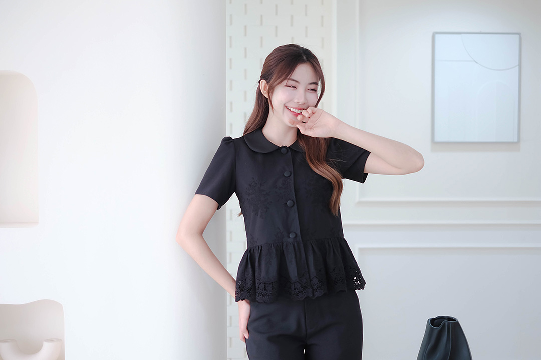 สวยจนต้องร้องคอบัวปักลายที่'หรูหราเกินเบอร์'ใส่แล้วดูแพงทันที เสื้อแขนสั้นสีดำคอปกบัวทรงกลมสุดคลาสสิกดูน่ารักแต่ยังคงความเนี้ยบ ลายปักดอกไม้ที่ช่วงกลางลำตัวทำให้เสื้อดูมีมิติและหรูหราแบบมินิมอล ทรง Peplum มีระบายลูกไม้สวยงามที่ชายเสื้อใส่แล้วช่วยพรางหุ่นได้ดีมาก กระดุมสีดำเรียงแถว มีซับในทั้งตัวทำให้สวมใส่สบายไม่ระคายผิว แมตช์กับกางเกงสแล็คสีดำหรือกระโปรงได้หม