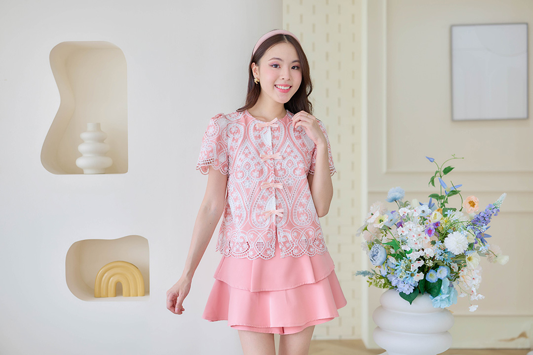 สายหวานห้ามพลาด! เสื้อแขนสั้นโทนชมพูลุคใส่ง่ายๆแต่ดีเทลแน่นปึ้ง เป็นผ้า Cotton ฉลุลายเป็นรูปหัวใจ พร้อมปักดอกไม้เพิ่มความหวานละมุนแบบเต็มสิบไม่หัก แต่งโบว์สำเร็จเป็นผ้ากำมะหยี่สีชมพูเพิ่มลุคให้ดูน่ารักและสวยจบในตัวเดียว แขนและชายเสื้อเป็นชายเชิงดีไซน์หวานลงตัวสุดๆ ใส่แล้วไม่คันเพราะมีซับในให้ทั้งตัว จะใส่กับกระโปรงหรือกางเกงก็ดูดี บอกเลยว่าใส่แล้วสวยฉ่ำมงลงแน่นอน! รีบจับจองก่อนหมดนะค้า~