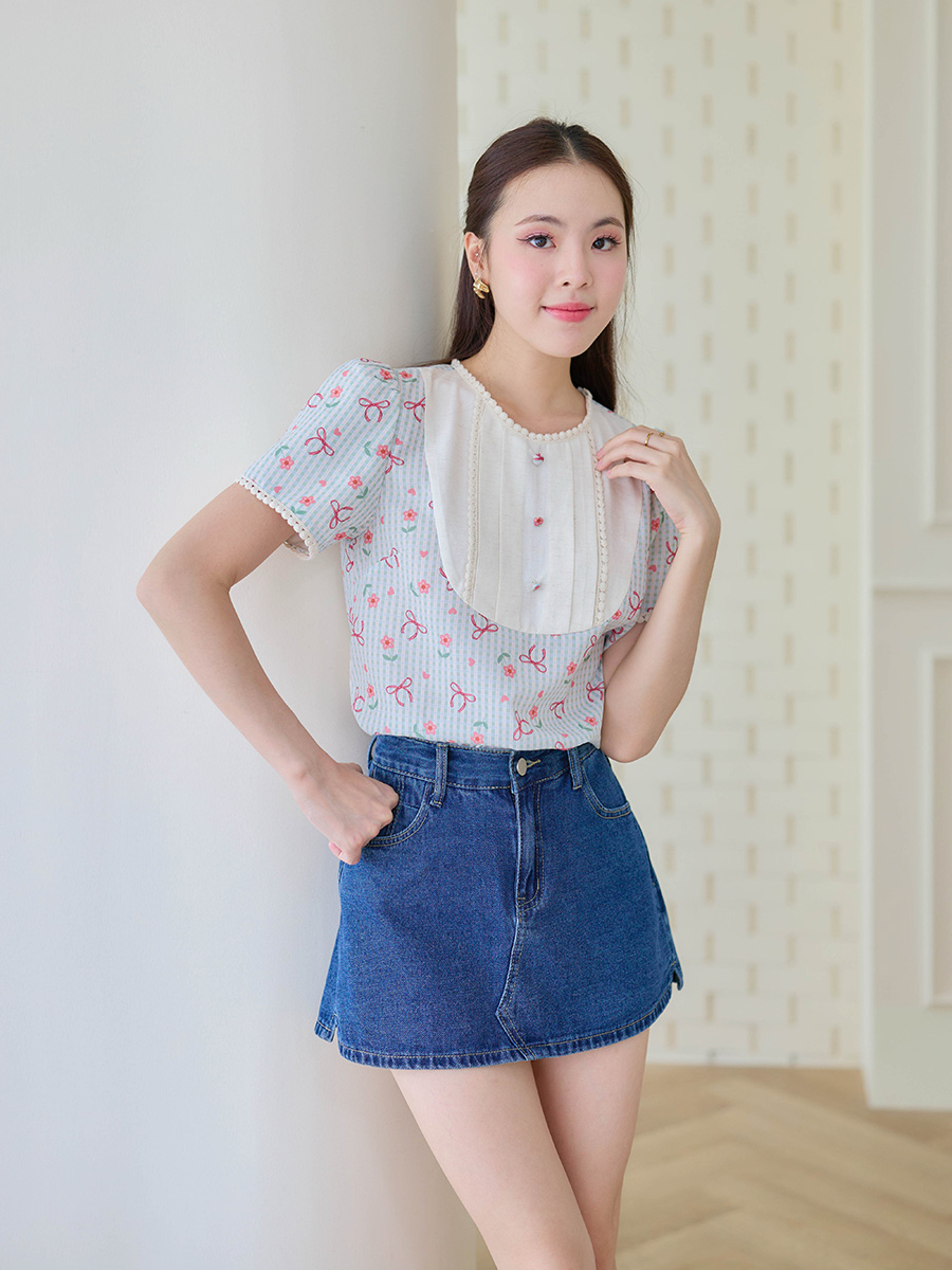 ไอเท็มสุดคิวท์ที่ต้องมีติดตู้! เสื้อแขนสั้นผ้า Cotton ลายตารางโทนสีเขียว ปรินท์ลายดอกไม้และโบว์สีชมพูน่ารักๆ มีซับในทั้งตัว เพิ่มความละมุนด้วยผ้าต่อสีครีมช่วงอก ดีไซน์ตีเกล็ด2ชั้นและแต่งกระดุมหลอกด้านหน้า เพิ่มดีเทลด้วยเทปลูกไม้เล็กๆช่วงอก ช่วงคอ และปลายแขน ลุคแบบคุณหนูน่าร้ากๆสดใส ใส่ Everydaylook ได้ แมตช์กับยีนส์ก็สวยหวานกำลังดี หรือจะจับคู่กับกระโปรงก็ยิ่งดูละมุน