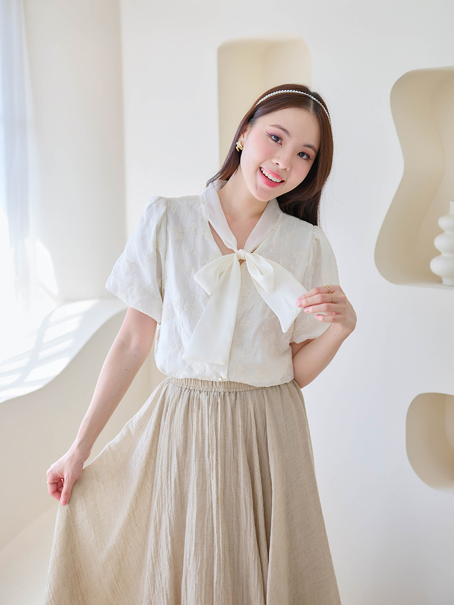 ลุคคุณหนูต้องรุ่นนี้ค่าา กับเสื้อทรงแขนบอลลูน เนื้อผ้า Tencel ปักลายดอกไม้และผีเสื้อ สีขาวครีมสุดละมุน แต่งโบว์ผูกช่วงคอ และกระดุมมุกเรียงด้านหน้า แขนบอลลูนพองนิดๆ ให้ลุคหรูหราเรียบร้อยละมุนในเวลาเดียวกัน แมทช์กับกางเกง/กระโปรง ใส่ทำงานหรือไปเที่ยวก็สวยหรู เอฟไปไม่ผิดหวังค่าา