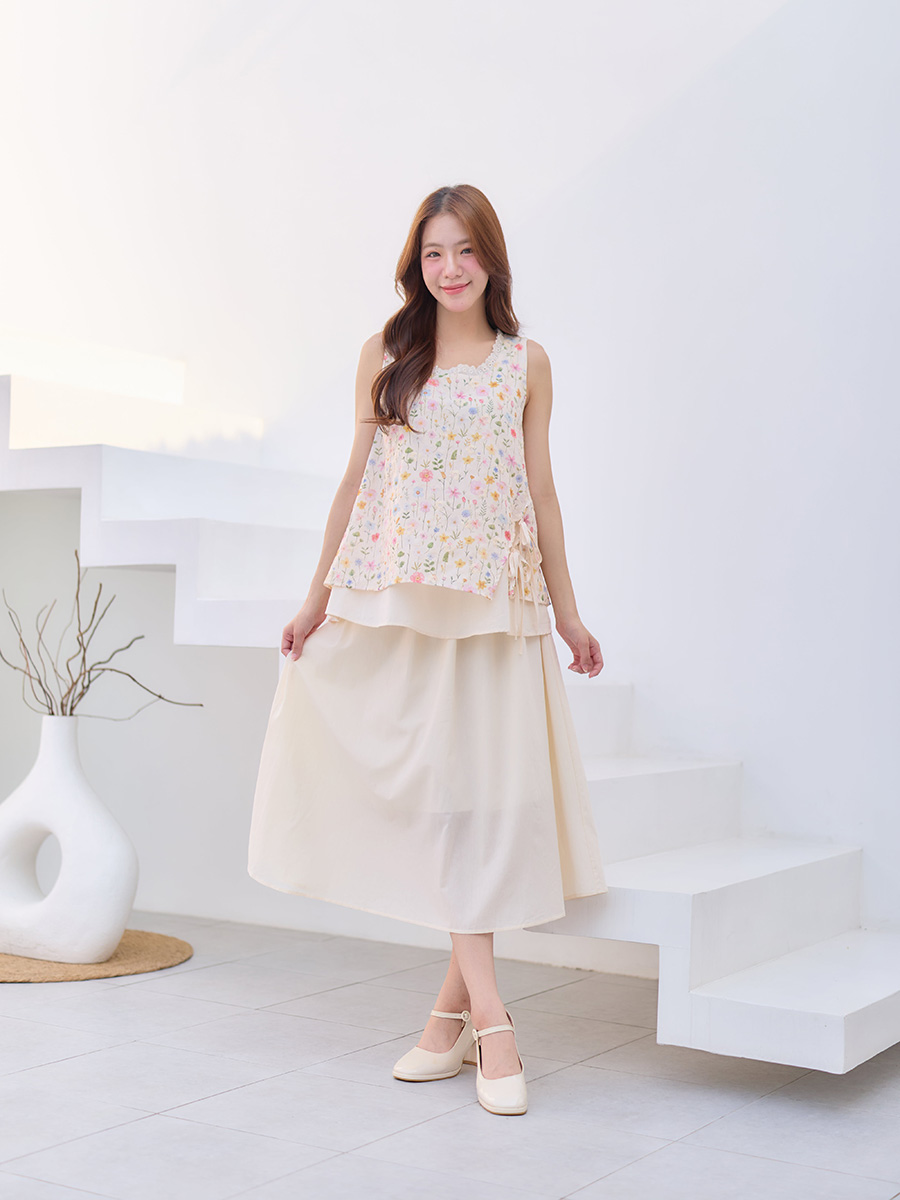 มาเพิ่มวันสดใสกับลุคหวานๆน่ารักๆ มาแพ็คคู่ เสื้อ+กระโปรง ใส่เข้าเซ็ทกันน่ารักมาก เสื้อแขนกุดสีครีมผ้า Cotton ฉลุลายลูกไม้งานพิมพ์ลายดอกไม้สีหวานๆ กุ๊นขอบคอด้วยผ้าฉลุลายลูกไม้เล็กๆ ชายเสื้อผ้าชขึ้นเล็กน้อยมีสายคู่ผูกเป็นโบว์น่ารักๆ ซับในทั้งตัว ตัวกระโปรงยาวสีครีมช่วงเอวเป็นยางยืด มีซับใน ใส่แยกชุดหรือใส่คู่เป้นเซ็ทก้น่ารัก งานดี ราคาคุ้มสุดๆ