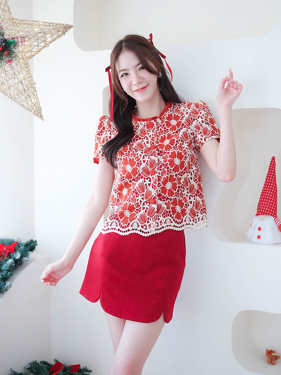 งานผ้า Premium สวยปังไม่ไหว ความอลังการดีเทลอัดแน่น เต็ม 10 ไม่มีหักเลย เสื้อลูกไม้สวยหรูโทรสีแดงอมส้มชายเชิงลูกไม้ครีม ลุคคุณหนูหวานๆ ใส่แล้วน่ารักสุดๆ แมทกับขาสั้นหรือขายาว ดูสวยแพง ใส่ทำงานก็ได้ใส่เที่ยวก็น่ารัก รายการนี้แนะนำเลย
