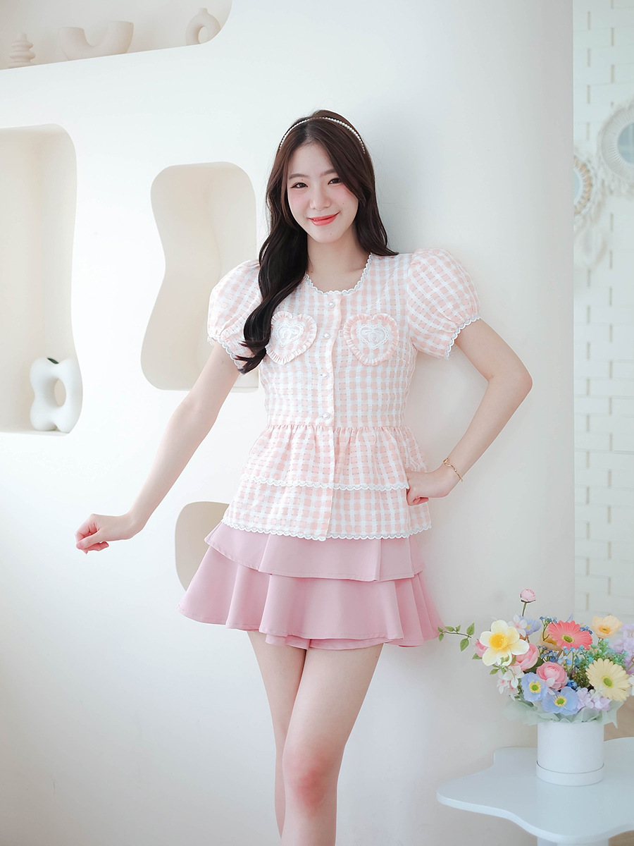 สาวหวานห้ามพลาด สวยหวานน่ารักๆเลย เสื้อแขนสั้นลายตารางเล็กๆสีชมพูโอรสสลับขาวเนื้อผ้าแบบมี texture ในตัว ทรงแบนบาร์บี้ แต่งกระเป๋ารูปหัวใจ 2 ข้างซ้าย/ขวา น่ารักมากๆ กระดุมมุกเรียงหน้า มีซับในทั้งตัวใช้ผ้าไหมอิตาลีอย่างดี ชายระบาย 2 ชั้น ใส่ทำงานก็ได้ใส่เที่ยวก็น่ารัก จัดไปไม่ผิดหวังแน่นอน