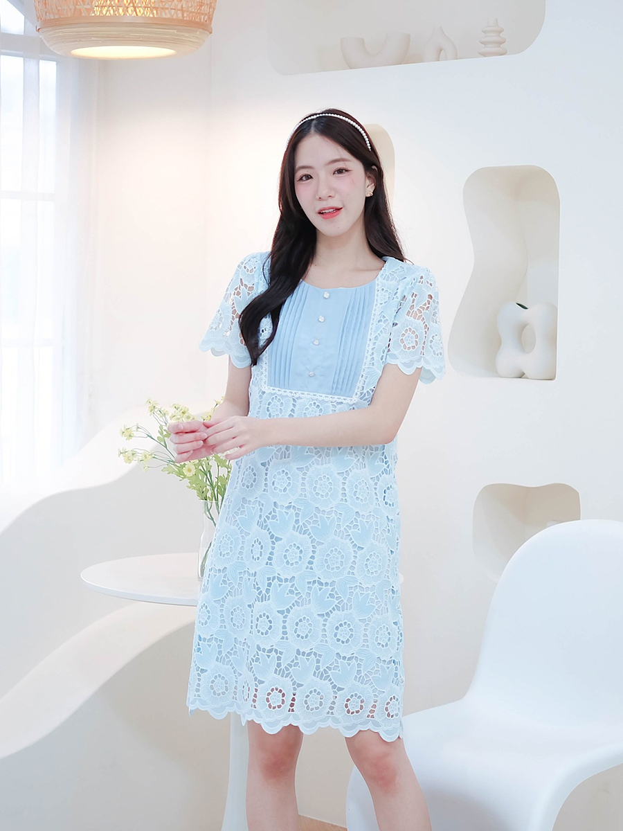 ใครรองานเดรสอยู่ มาจัดไป กับเดรสแขนสั้นคุณหนูคุณนายสวยหวาน เนื้อผ้าฉลุลายดอกไม้โทนสีฟ้าขาว ช่วงคอด้าหน้าต่อด้วยผ้าสีฟ้าเย็บจับจีบกุ๊นขอบลูกไม้เล็กๆ แต่งกระดุมมุหลอกช่วงคอด้านหน้า เนื้อผ้าแบบมี texture ในตัว มีซับใน ความยาวกำลังดี รุ่นนี้แนะนำเลยนะคะ ใส่ทำงาน ใส่ออกงาน มีติดตู้ไว้รับประกันได้ใส่บ่อยๆแน่นอน